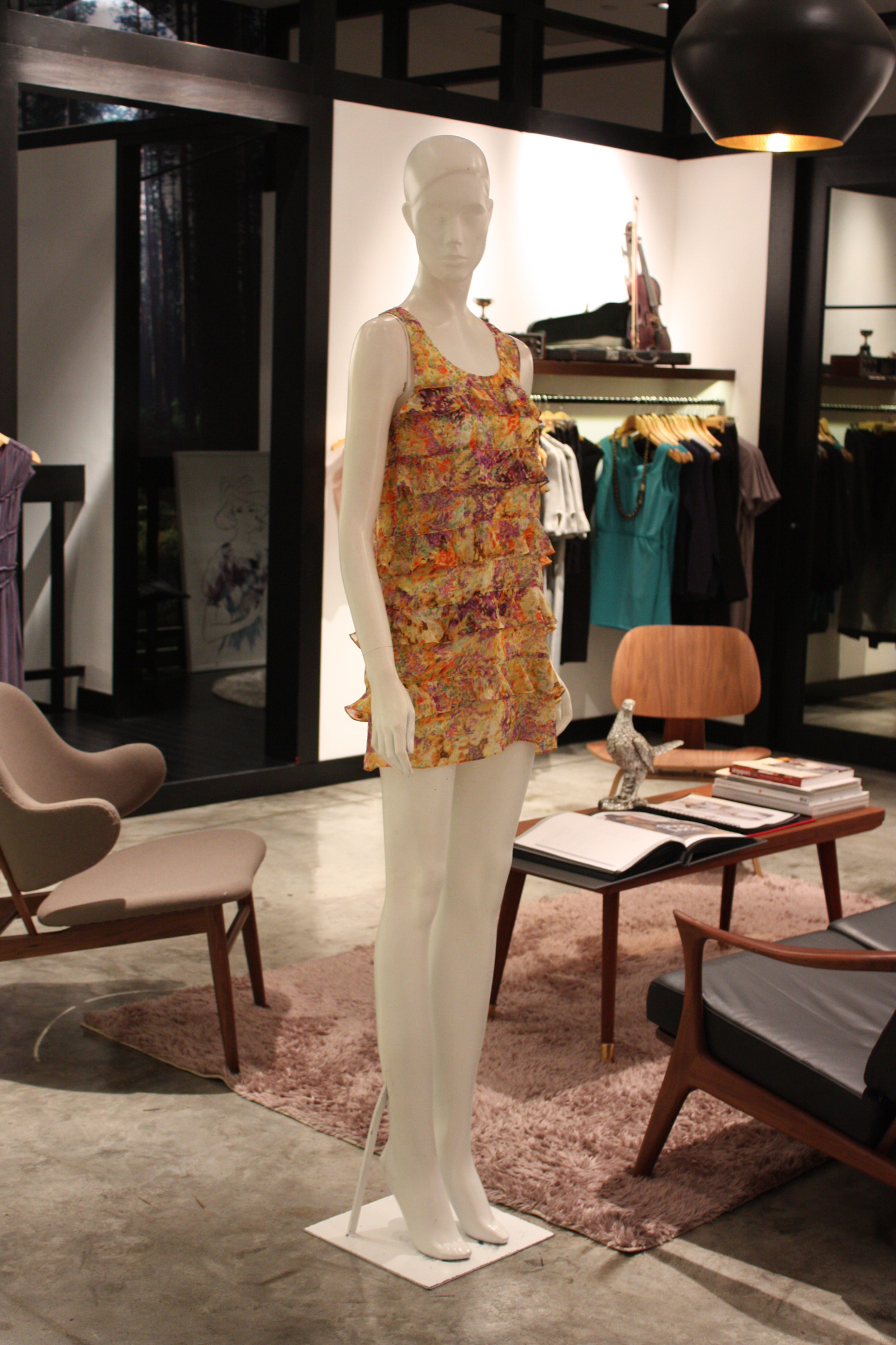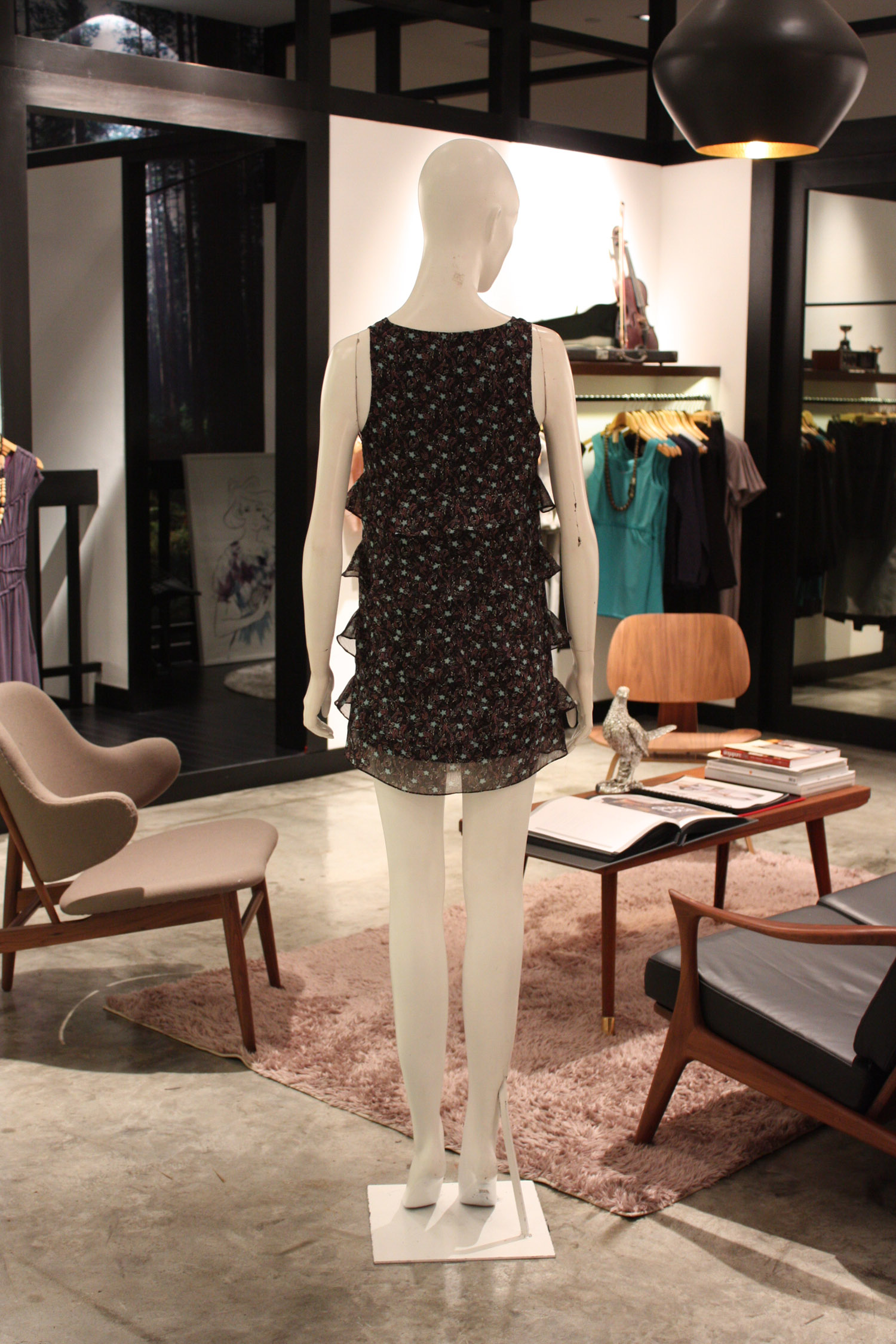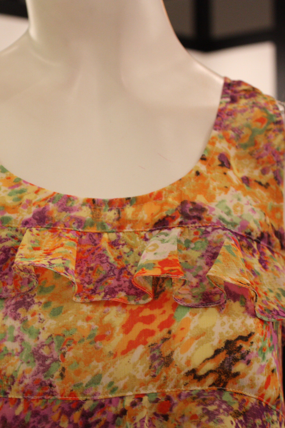 Sleeveless tiered A-line short dress Round scoop neckline Features 5 tiers of ruffled layers Fully lined with acetate lining