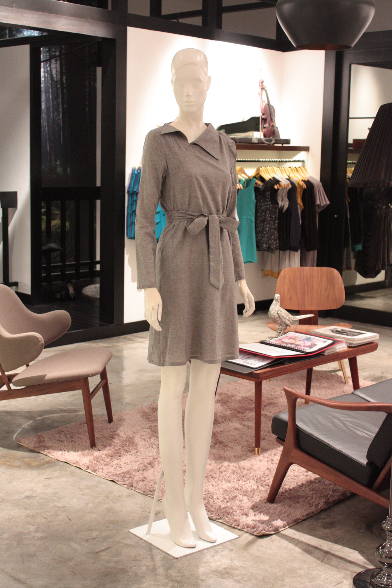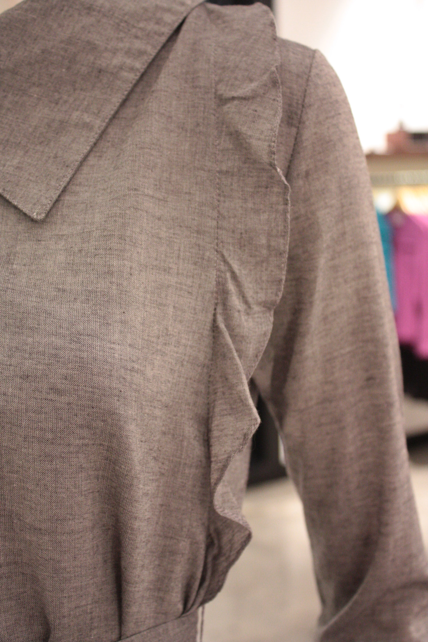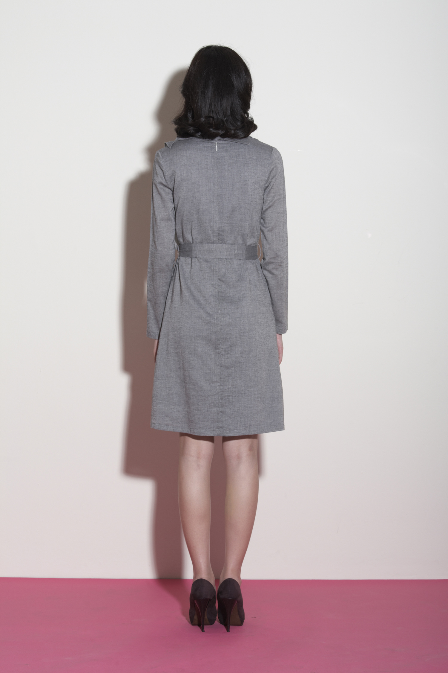 Long-sleeved dress with an asymmetrical fold-over collar Features a vertical ruffle detail on the left chest Comes with a detachable fabric belt Concealed zip at the centre back 2 string belt loops at the sides Fully lined with acetate lining