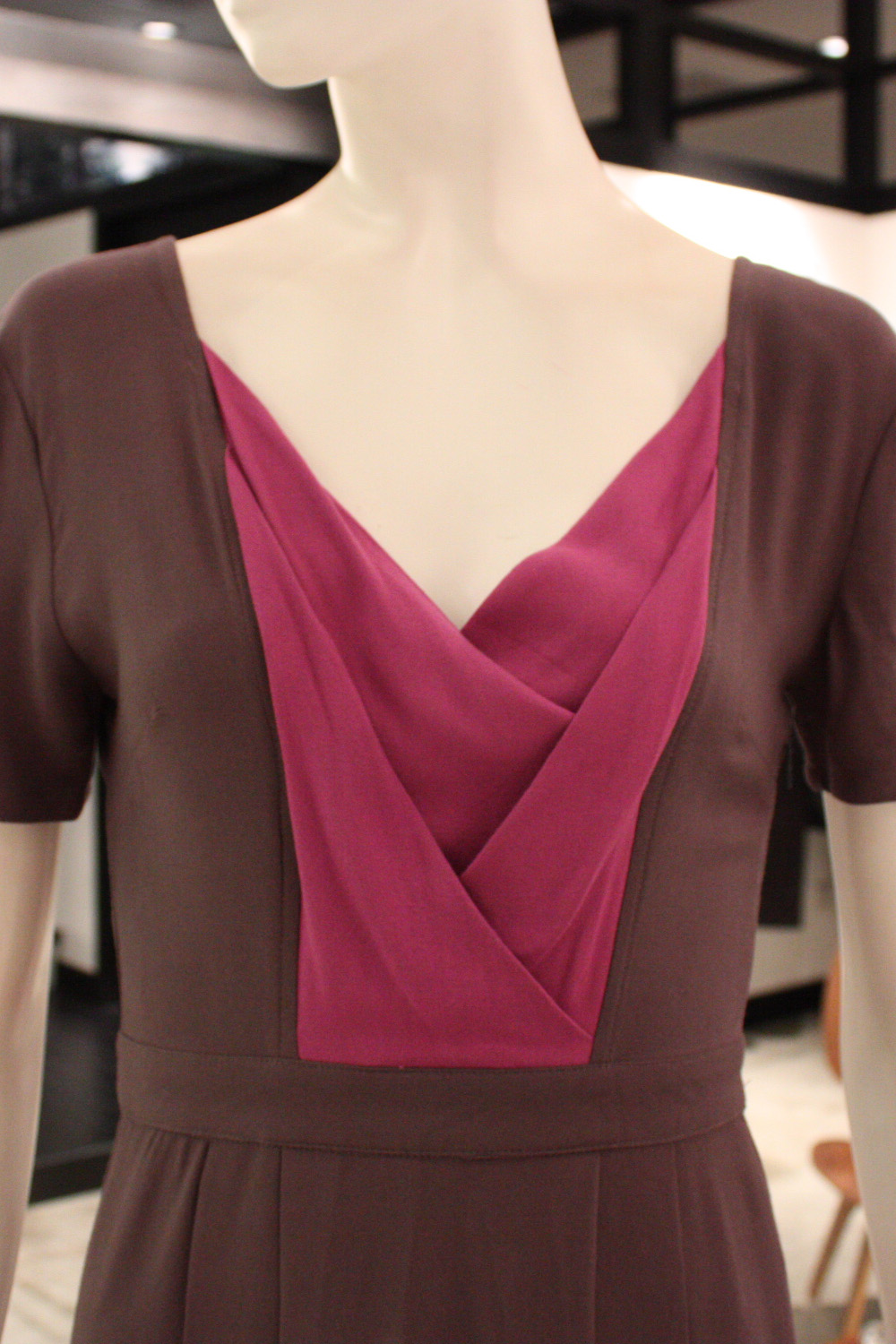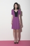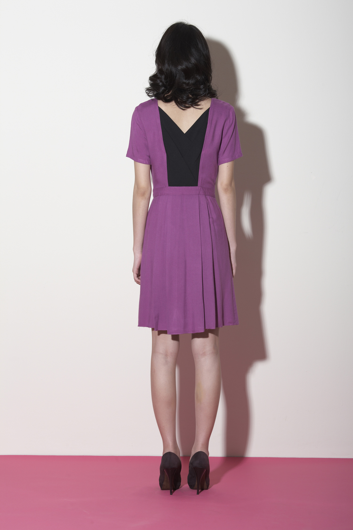 Two-tone waisted short-sleeved dress with a V shaped neckline Features a contrast overlapping design at the front and back Box pleats under the waistband Flared skirt Concealed side zip