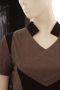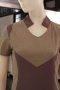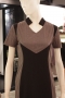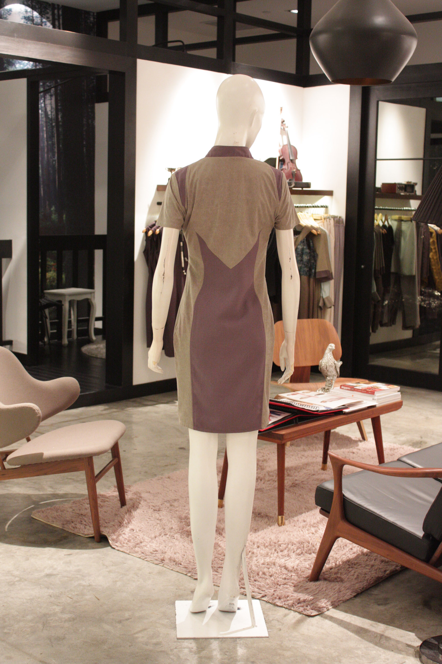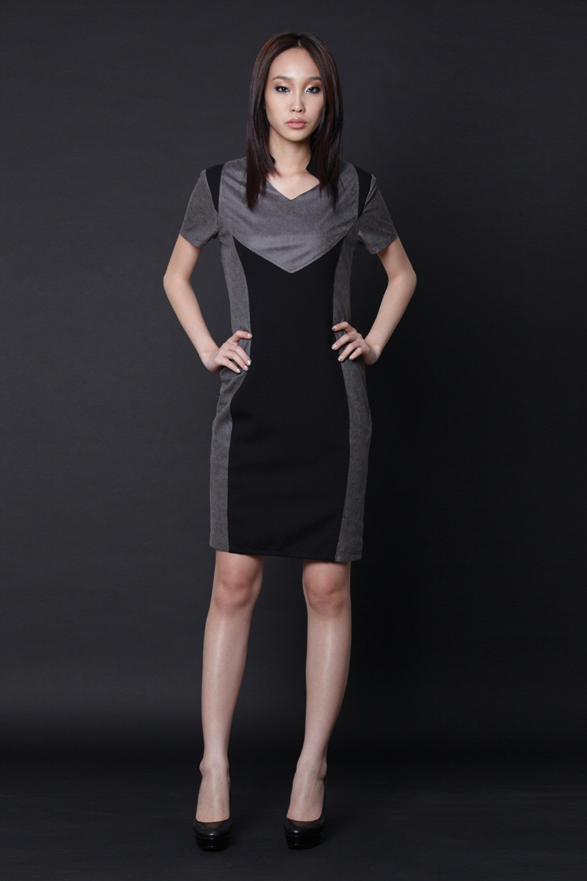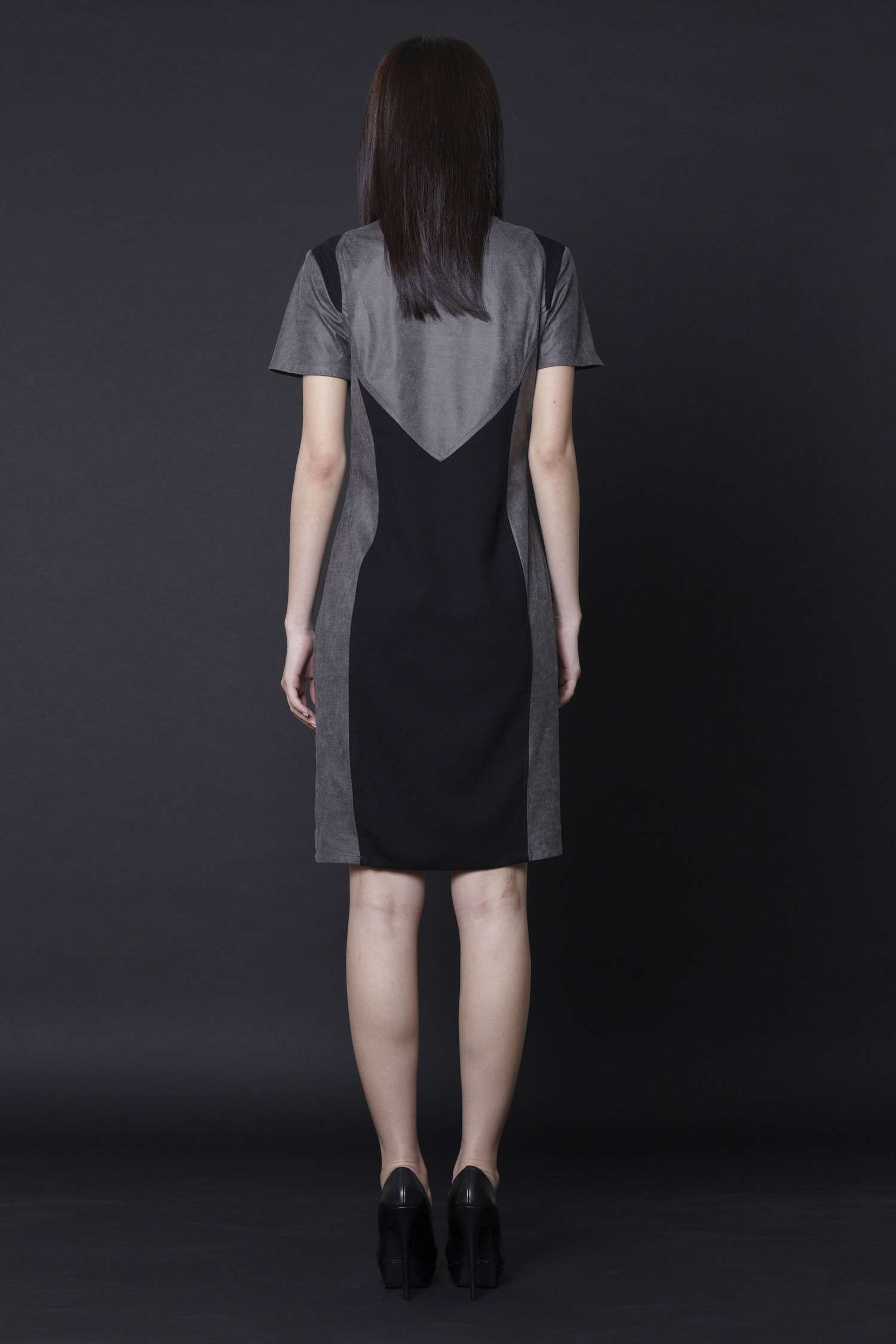 Two-toned short-sleeved dress Contrast mandarin collar with a gradual V neckline Contrast panels at the front and back and at the shoulders Concealed side zip Fully lined with acetate lining