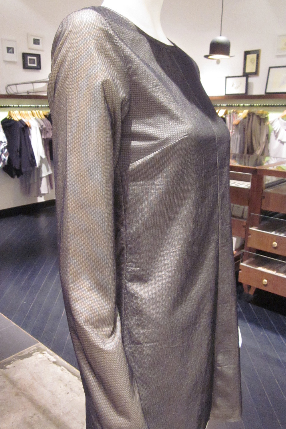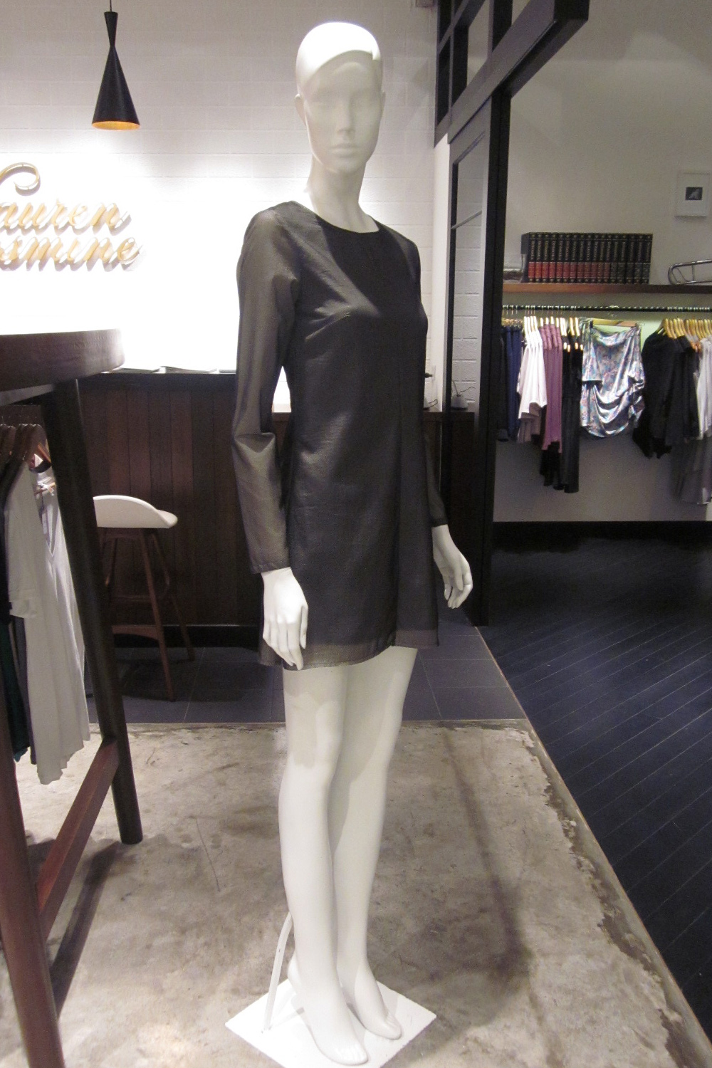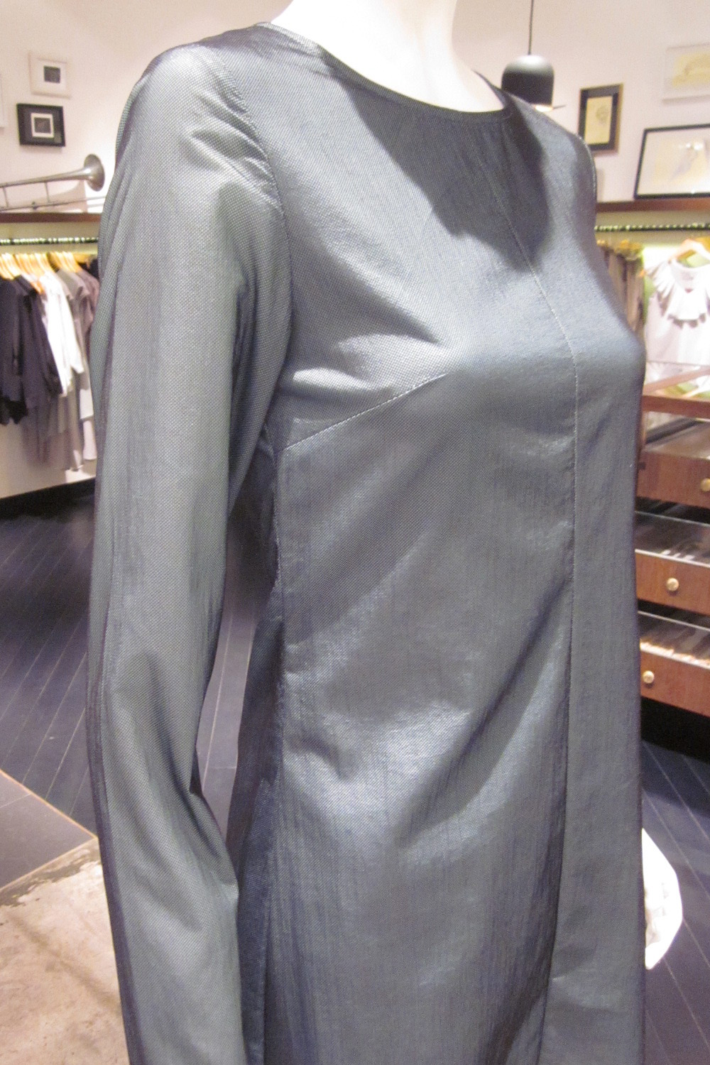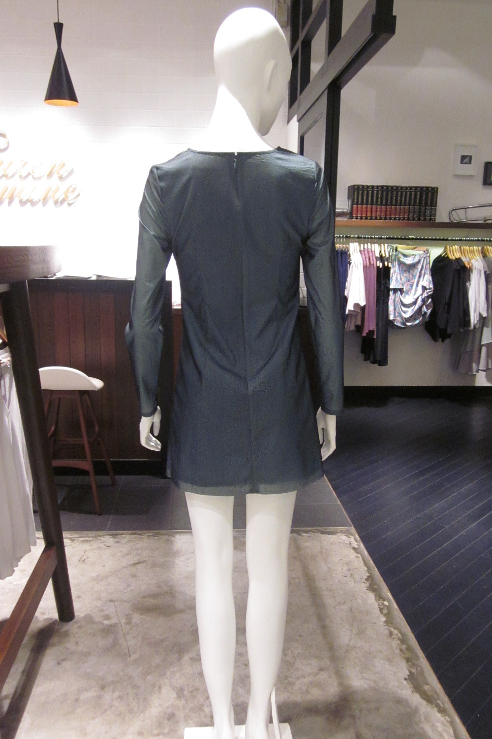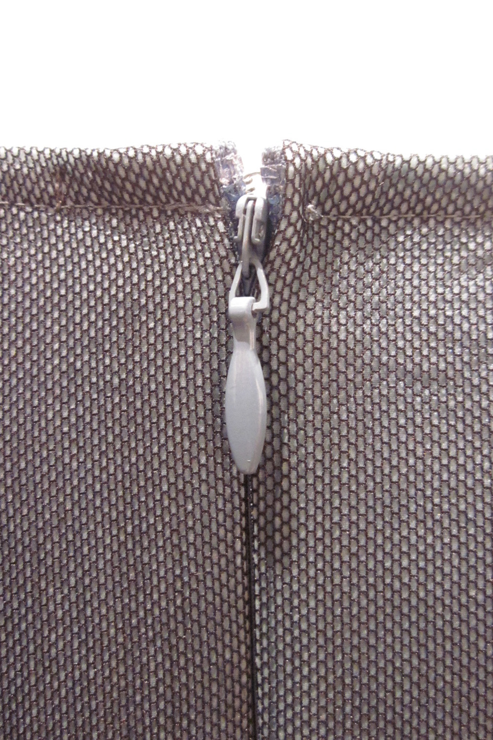 Long sleeved dress Textured material with a net-like effect Vertical seam running down the centre front and back Concealed centre back zip with hook and eye Raw edges at the hem; Lined with acetate lining