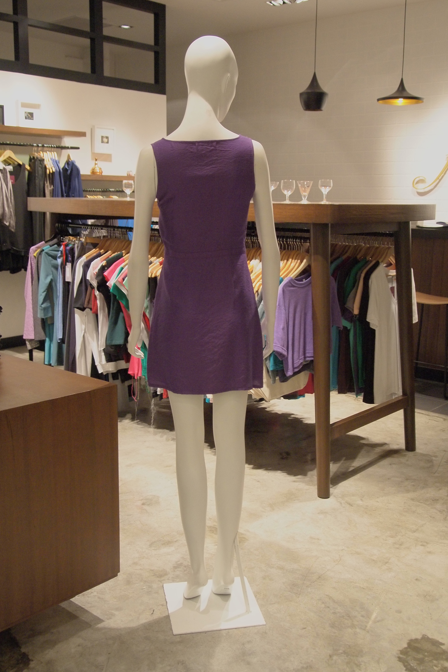 Purple sleeveless dress Narrow waistband Concealed zip with hook and eye at the side Triangular detail at the front Fully lined with acetate lining