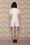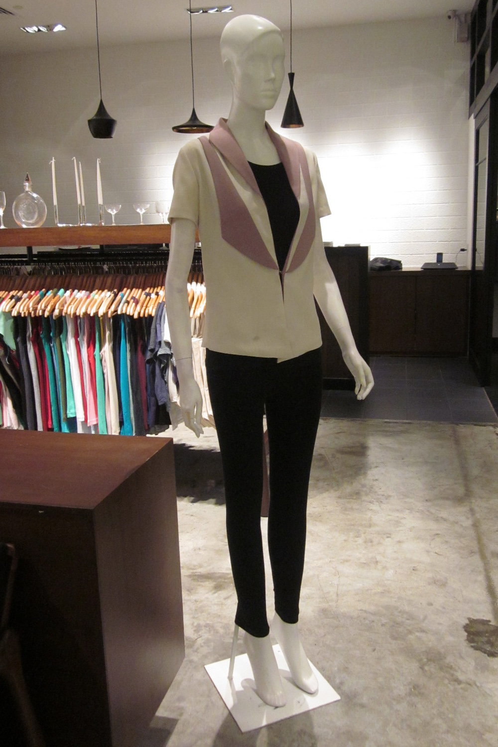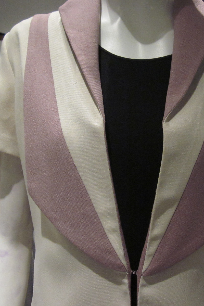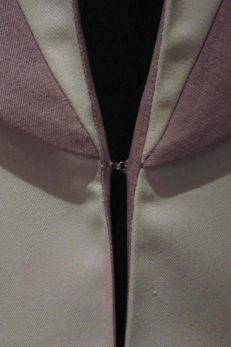 Short-sleeved colourblock jacket Standard collar and lapel with an additional lapel on each side Single hook and eye closure at the front Body of the jacket is lined with acetate lining