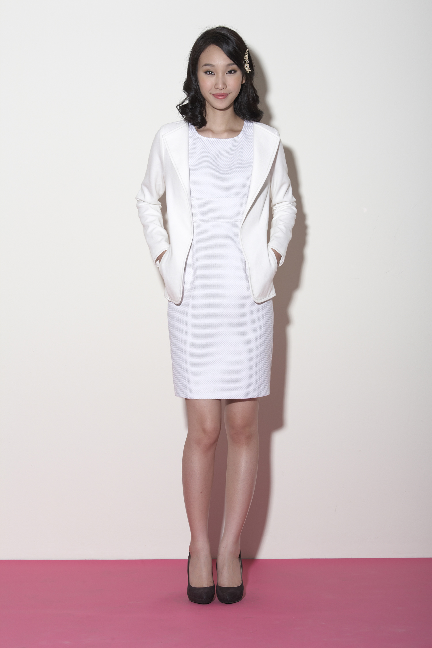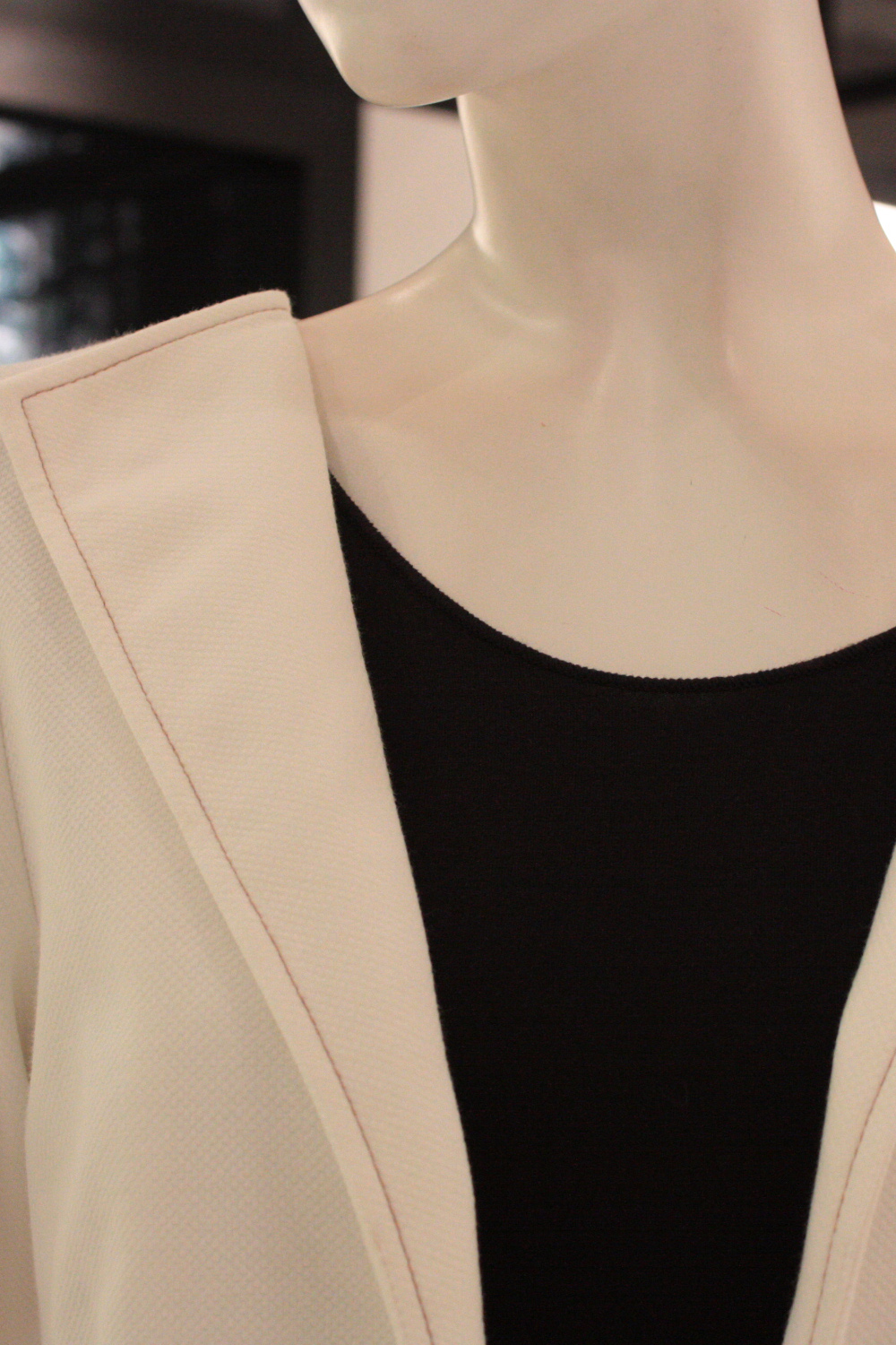 Long-sleeved open jacket with no closure The jacket is collarless but features vertical lapels Contrast stitching along the lapels, sleeves and hemline 2 vertical side pockets Fully lined with knit lining