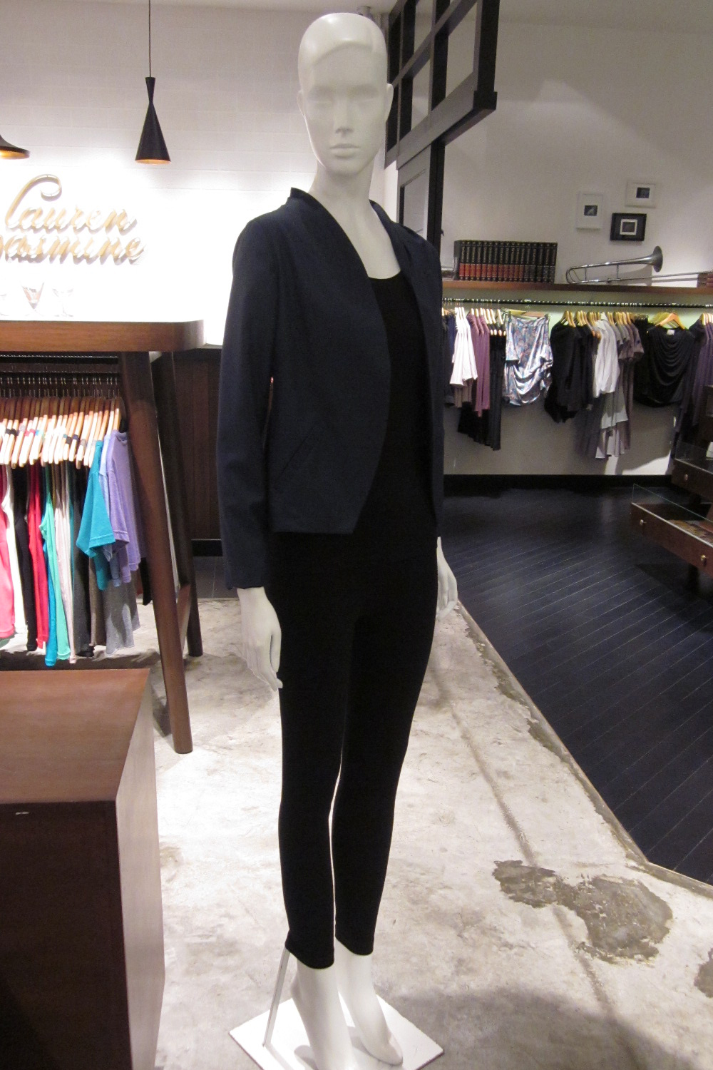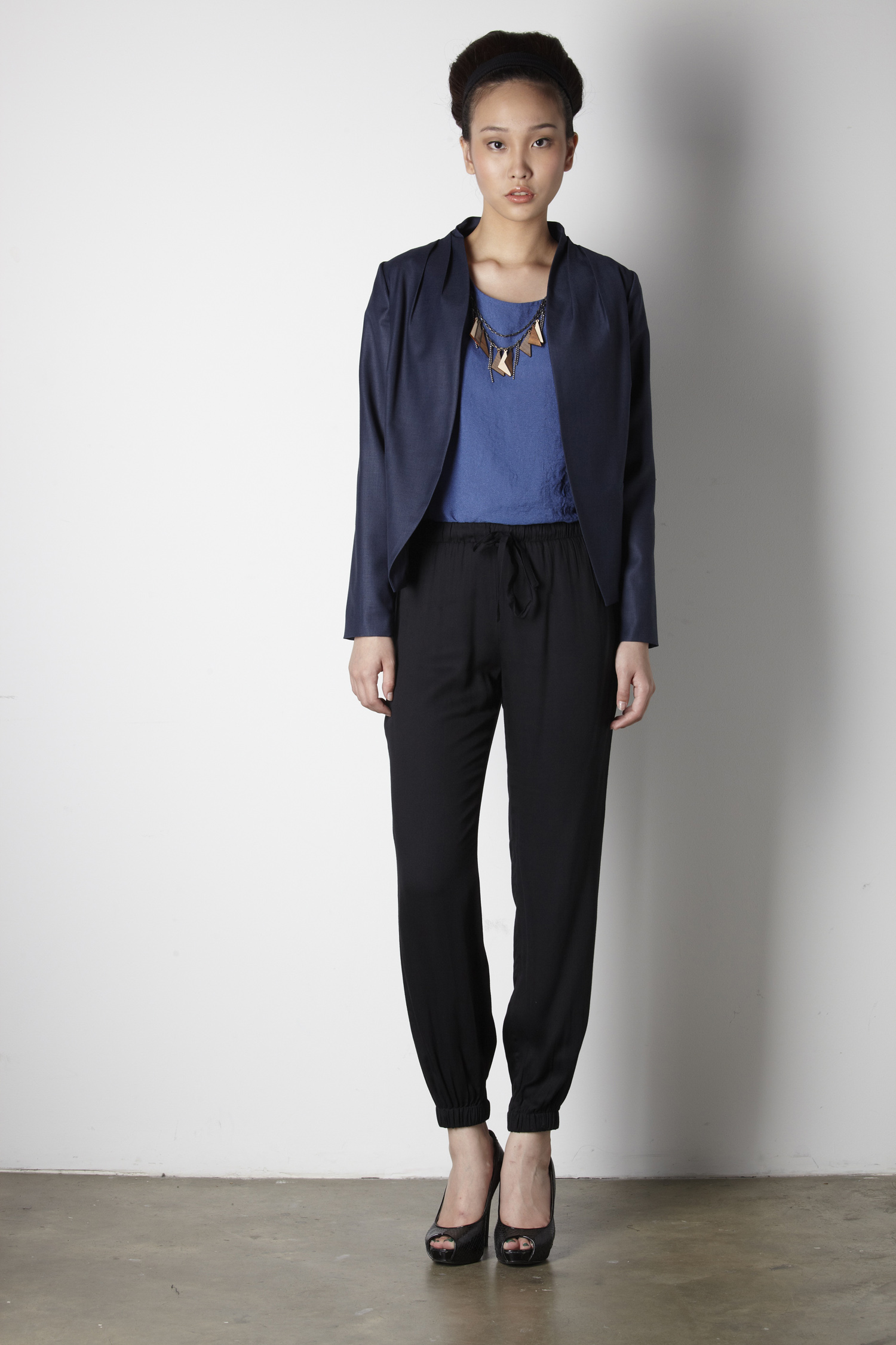 Curved open jacket 2 Diagonal side pockets 2 Pleats at the neckline Pleats at the centre back Fully Lined