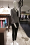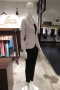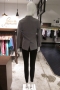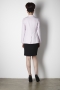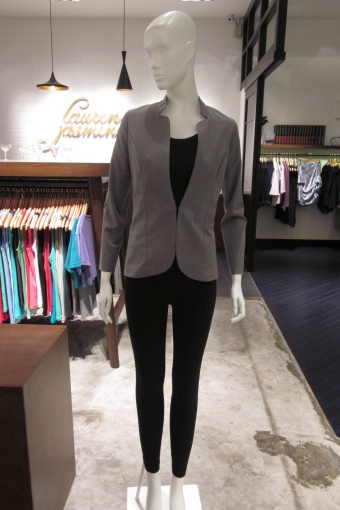 Long princess cut jacket Stand-up open mandarin collar Single hook and eye front closure Features a back slit and a curved bottom edge Lined