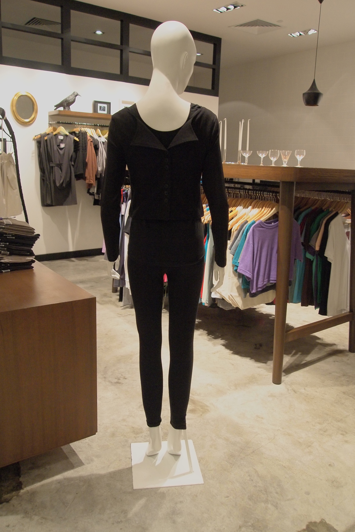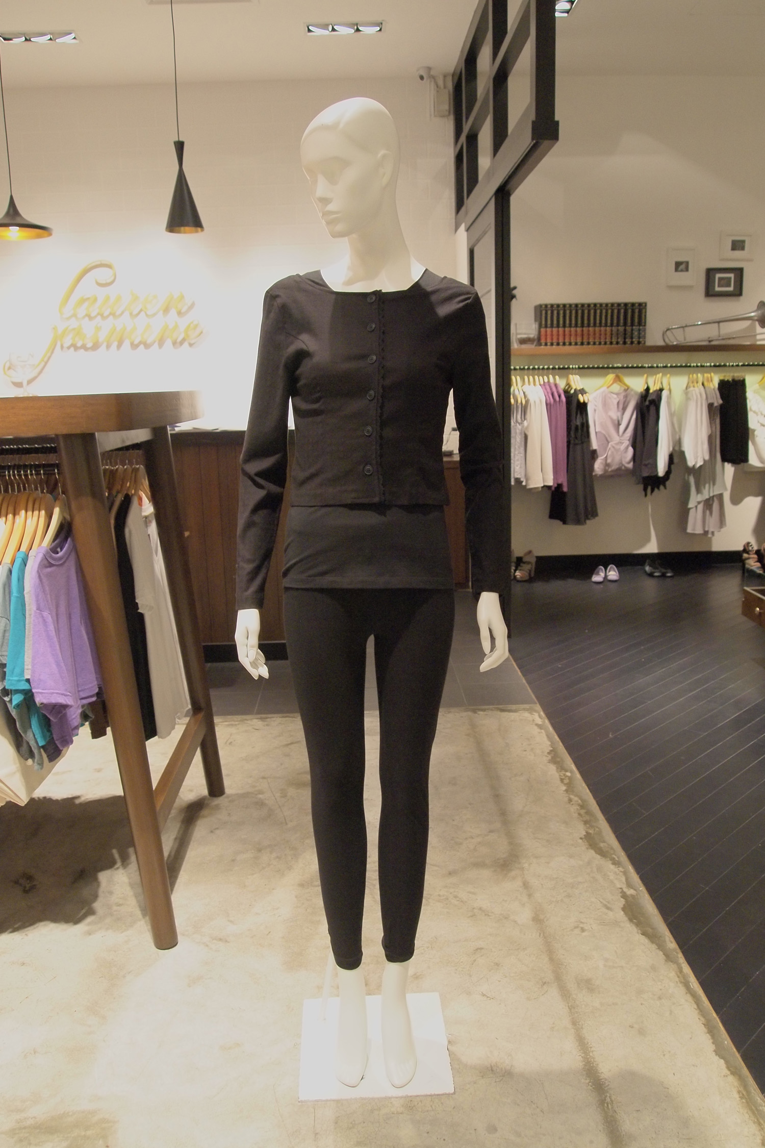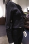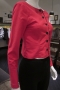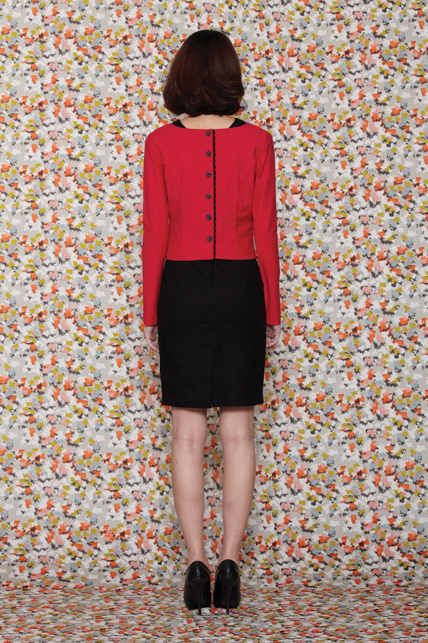 Long sleeved reversible jacket Can be worn front to back and back to front Front- round neckline with a 6-button closure and lace trim Back- open pointed collar with two clusters of three buttons Textured material with fancy buttons