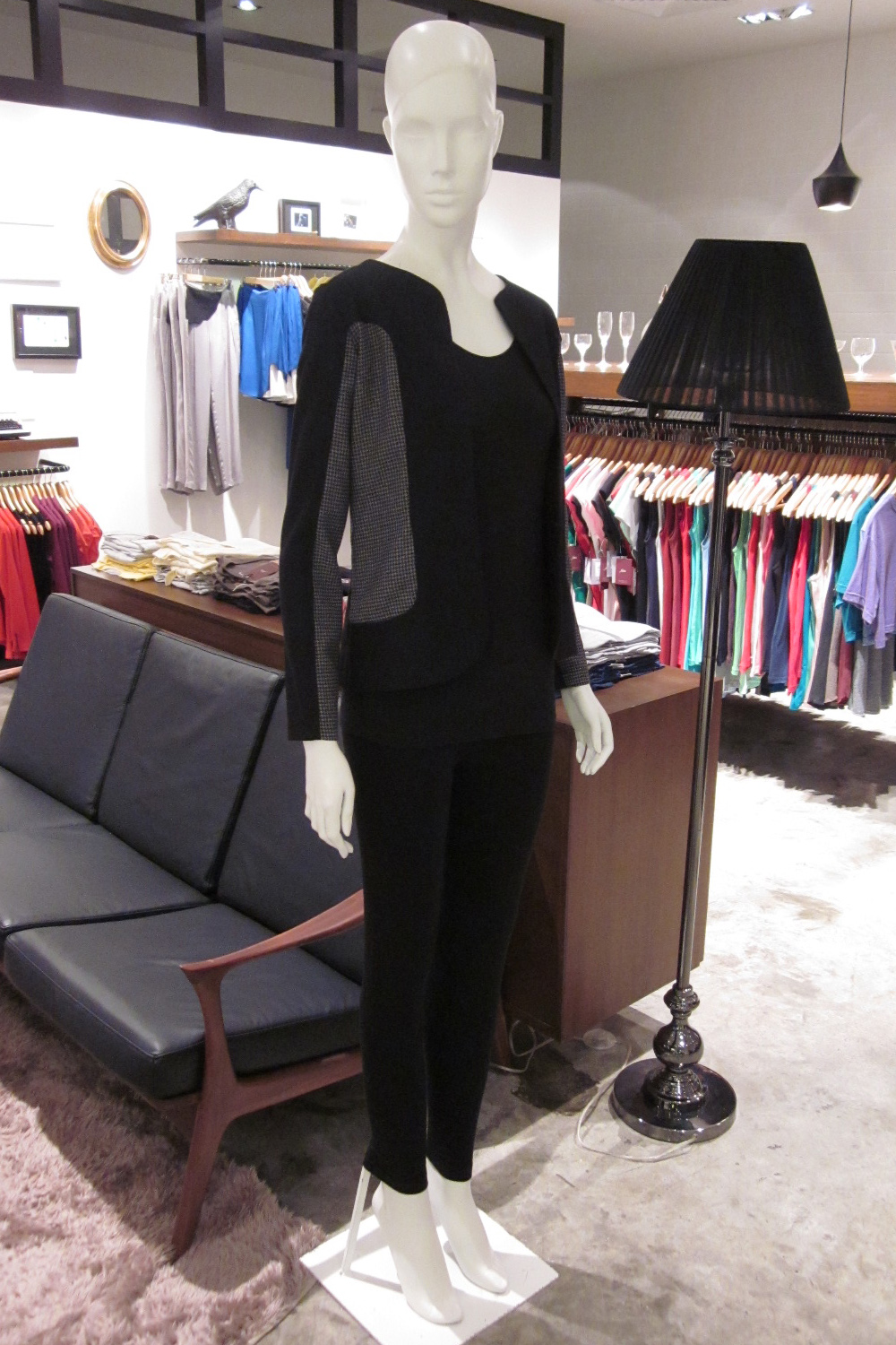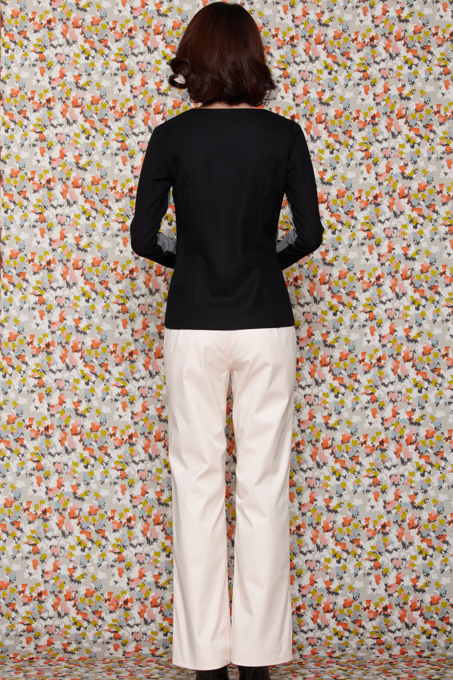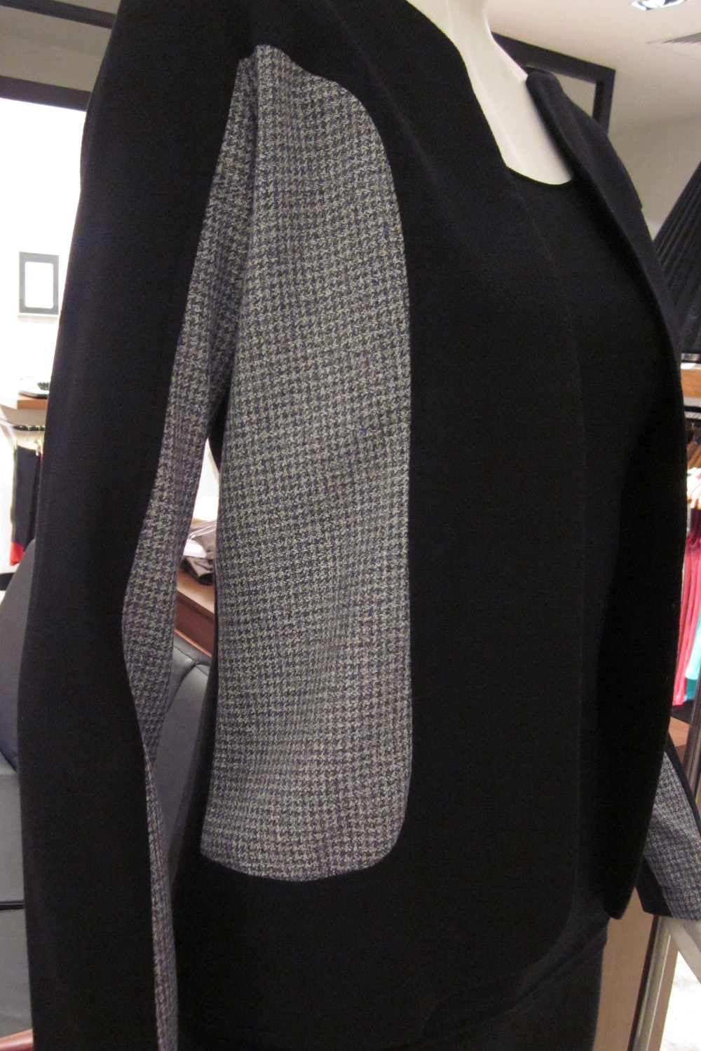 Houndstooth two toned jacket Contrast paneled detail at the sides and on the inner sleeves Double hook and eye closure at the front Collarless Body is lined with acetate lining