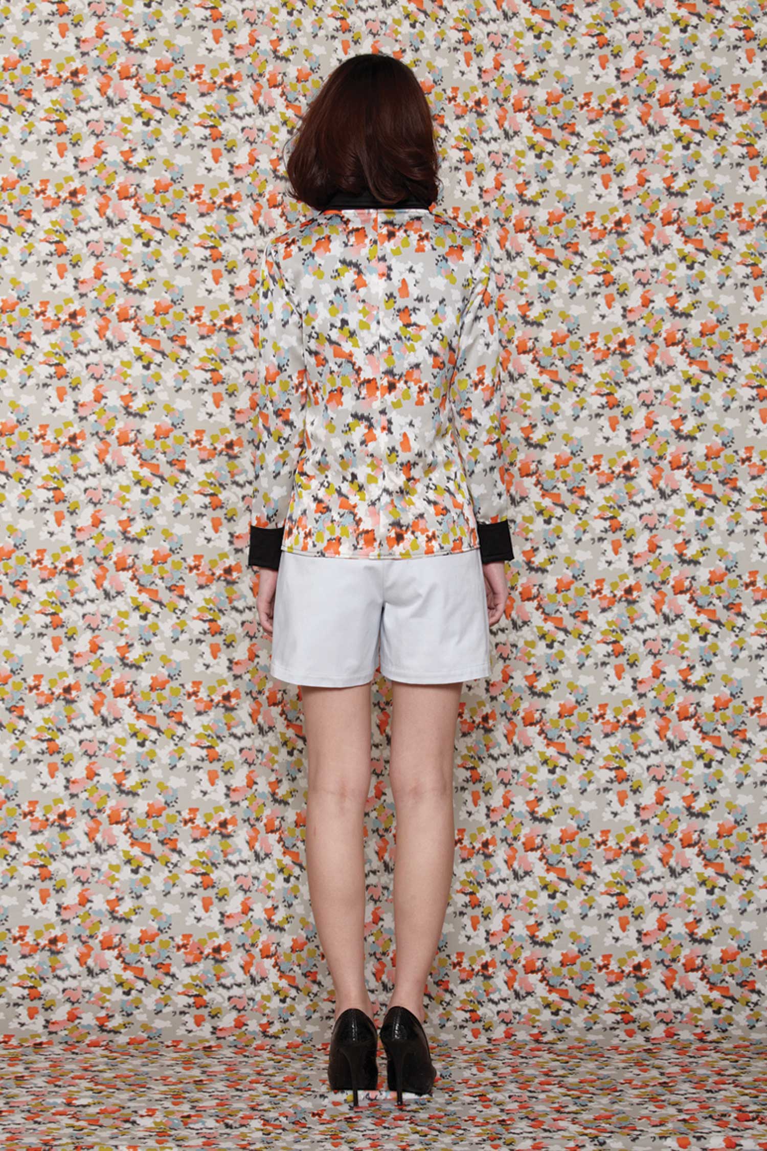 Printed reversible jacket One side: fully printed with a black collar and black cuffs One side: two toned, black and printed Single loop fabric button closure at the front Lined with self fabric