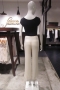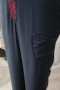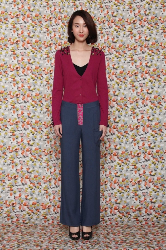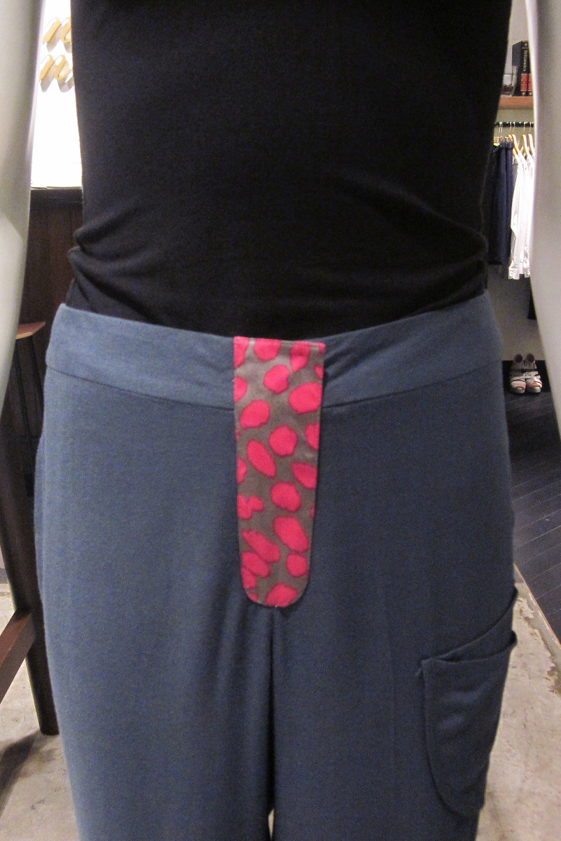 Wide leg flat front pants Concealed centre front zip beneath a contrast printed flap Contrast flap is fastened with a hook and eye on one edge Single pocket on one leg with a diagonal opening