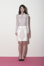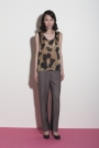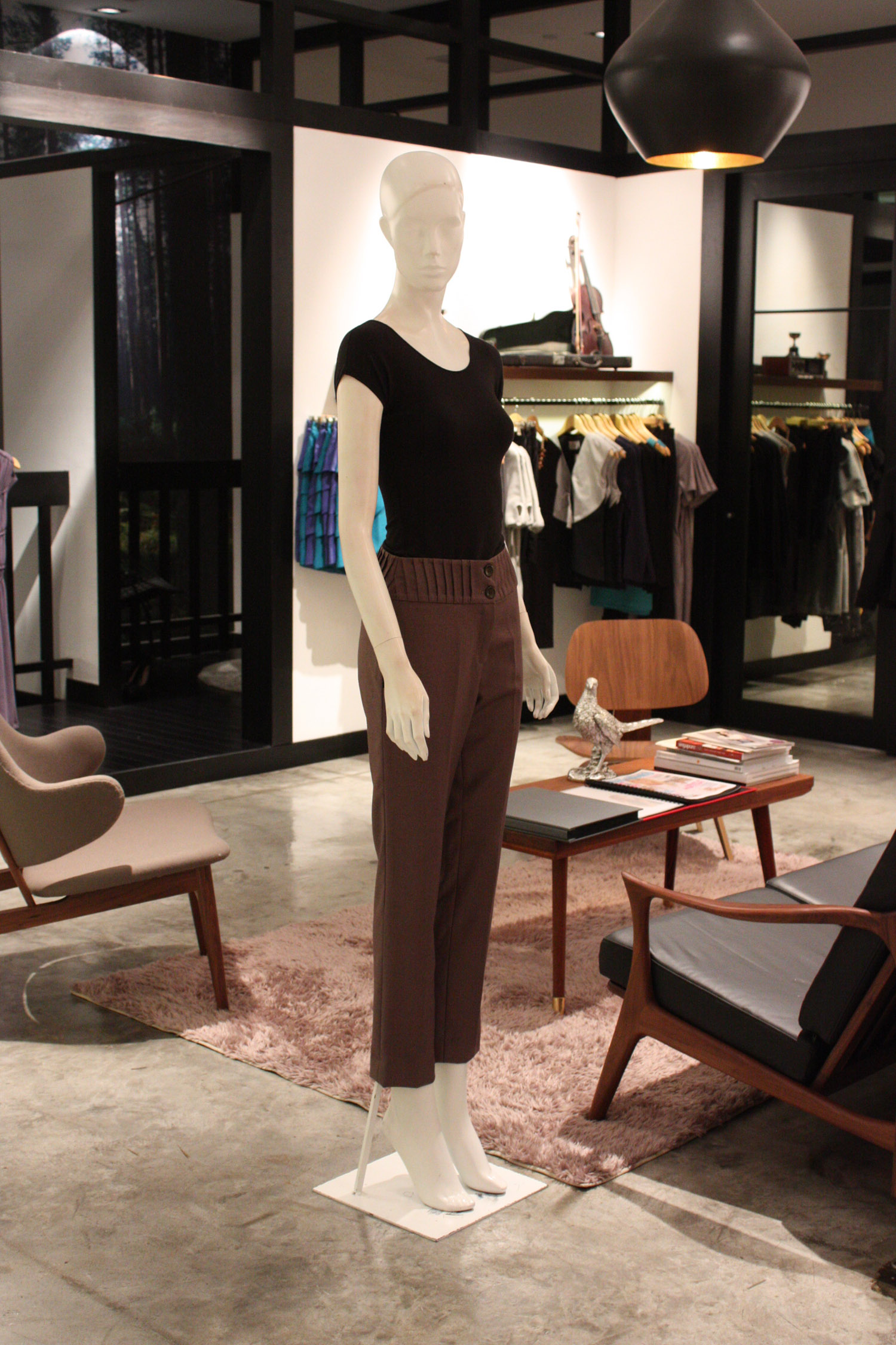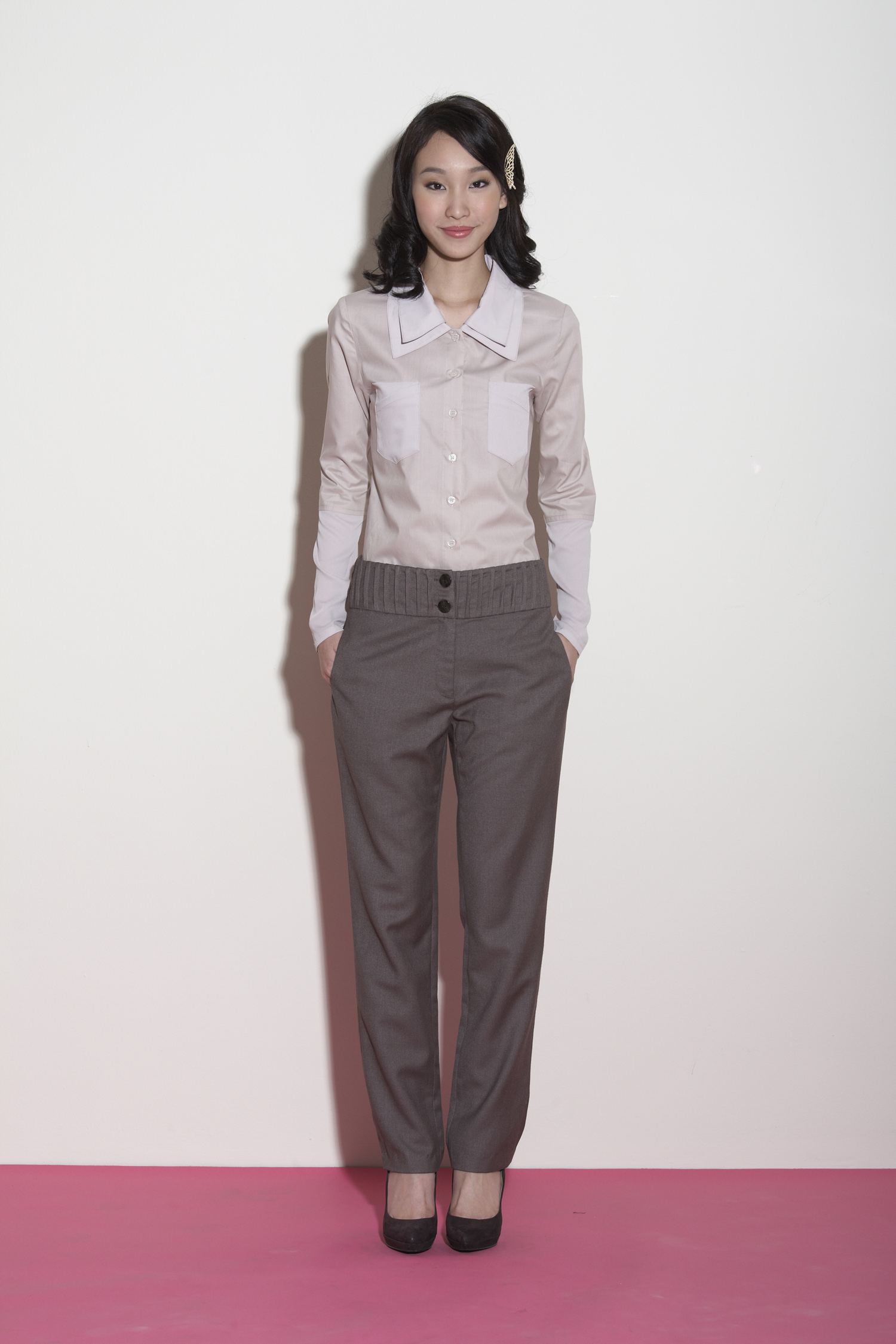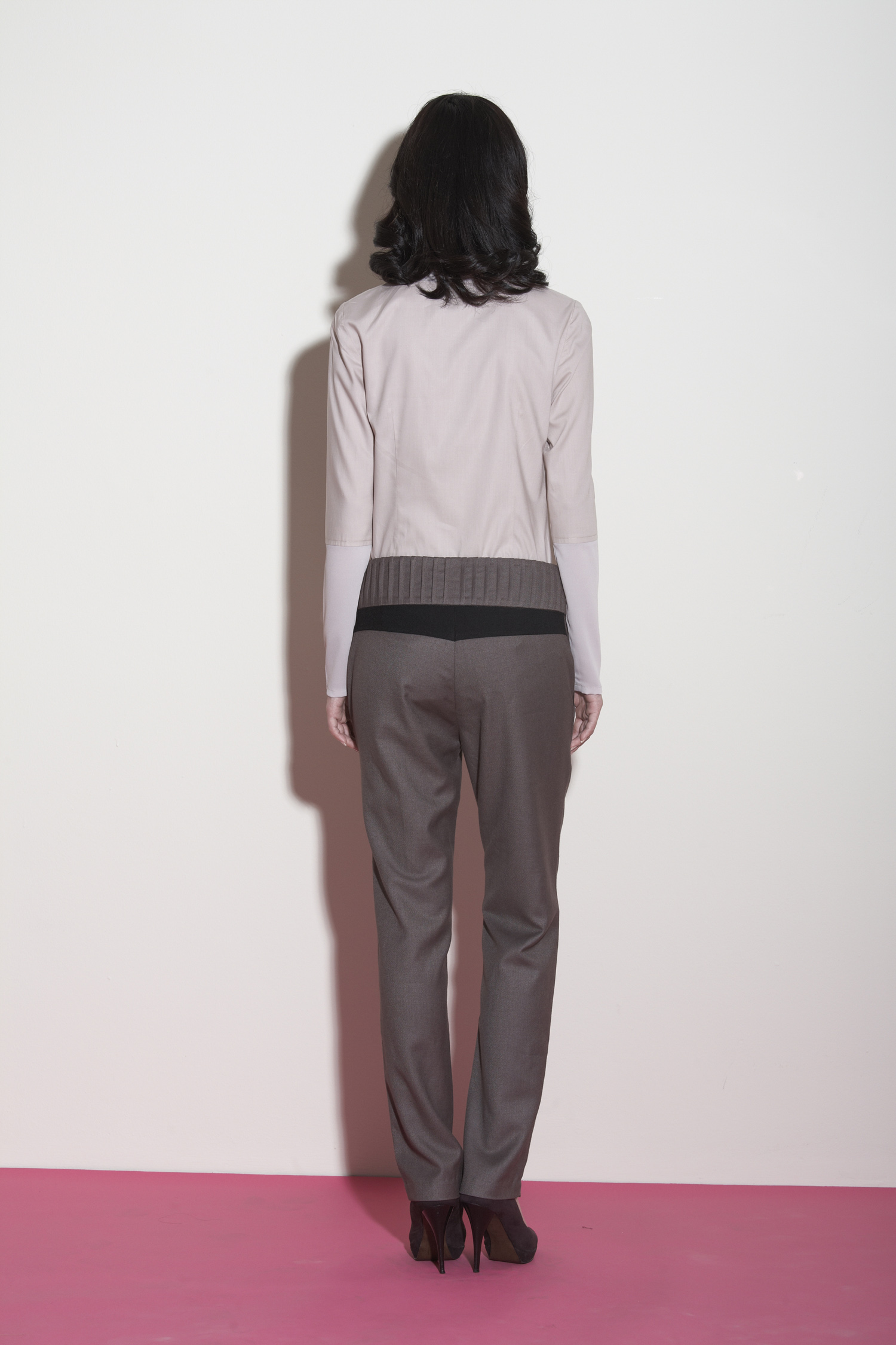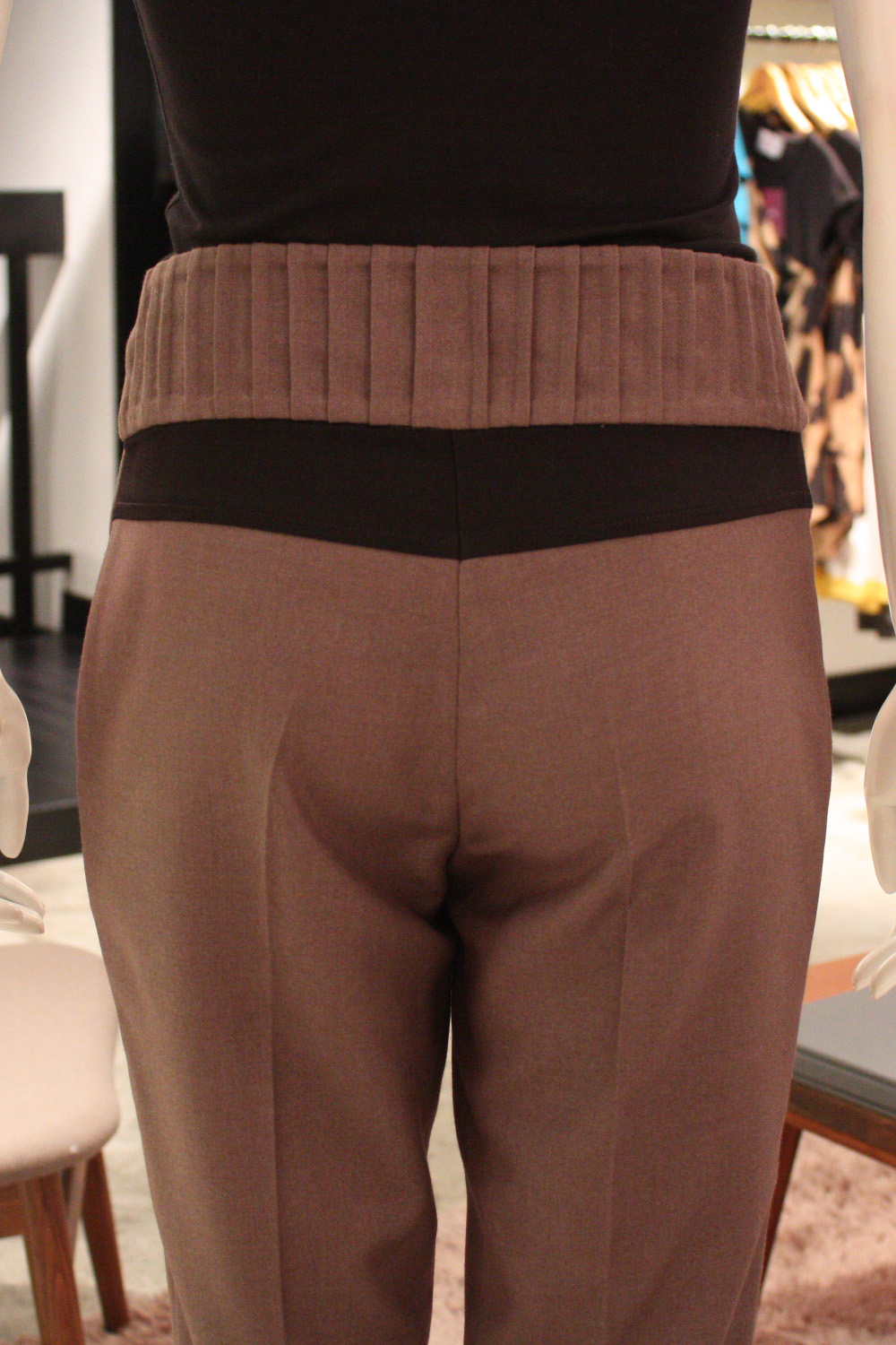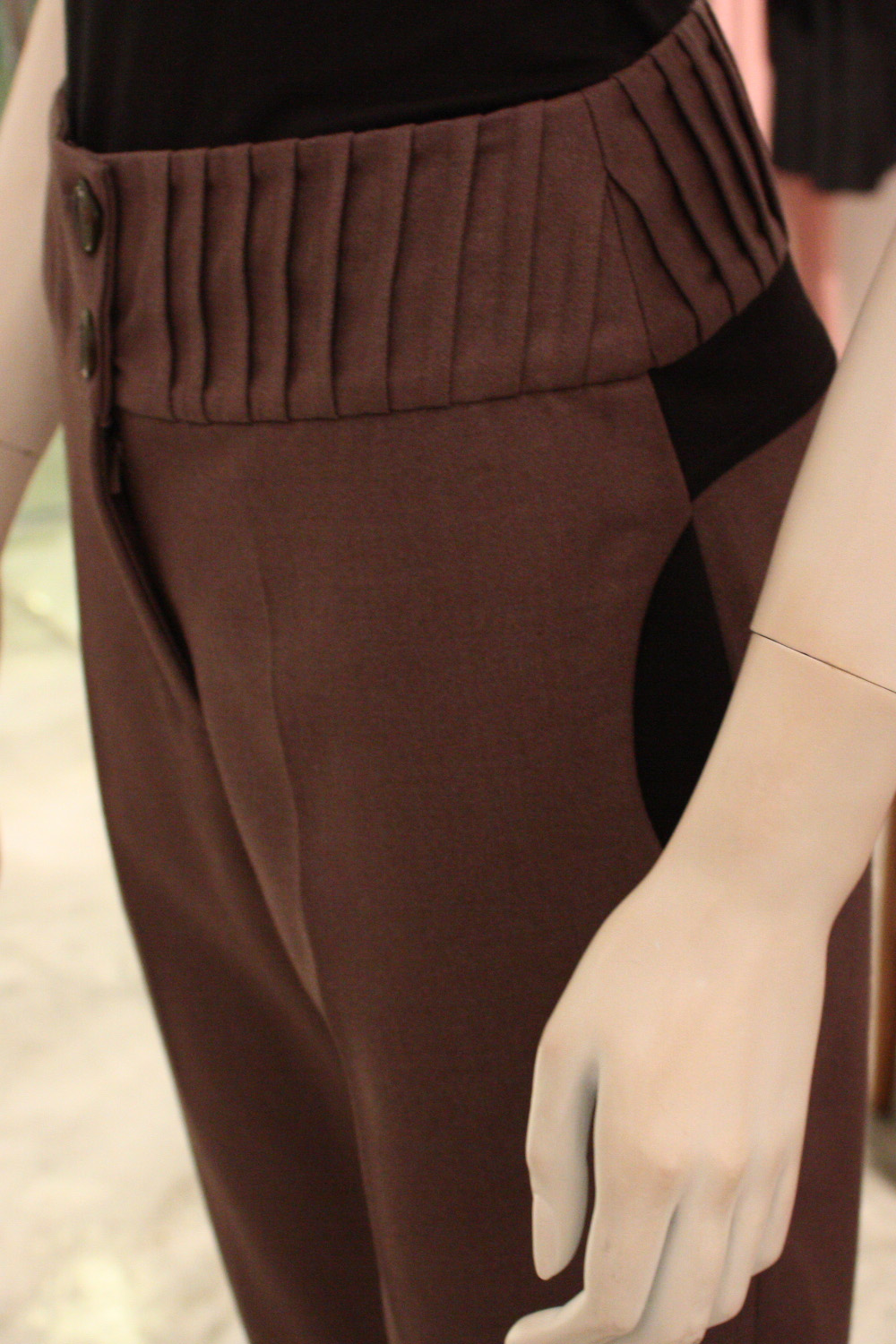 Two-tone straight leg flat-front pants Wide waistband featuring vertical pin tuck pleats throughout Contrast panel along the back below the waistband and at the opening of the pockets 2 Rounded side pockets 2 button closure with a zip at the front