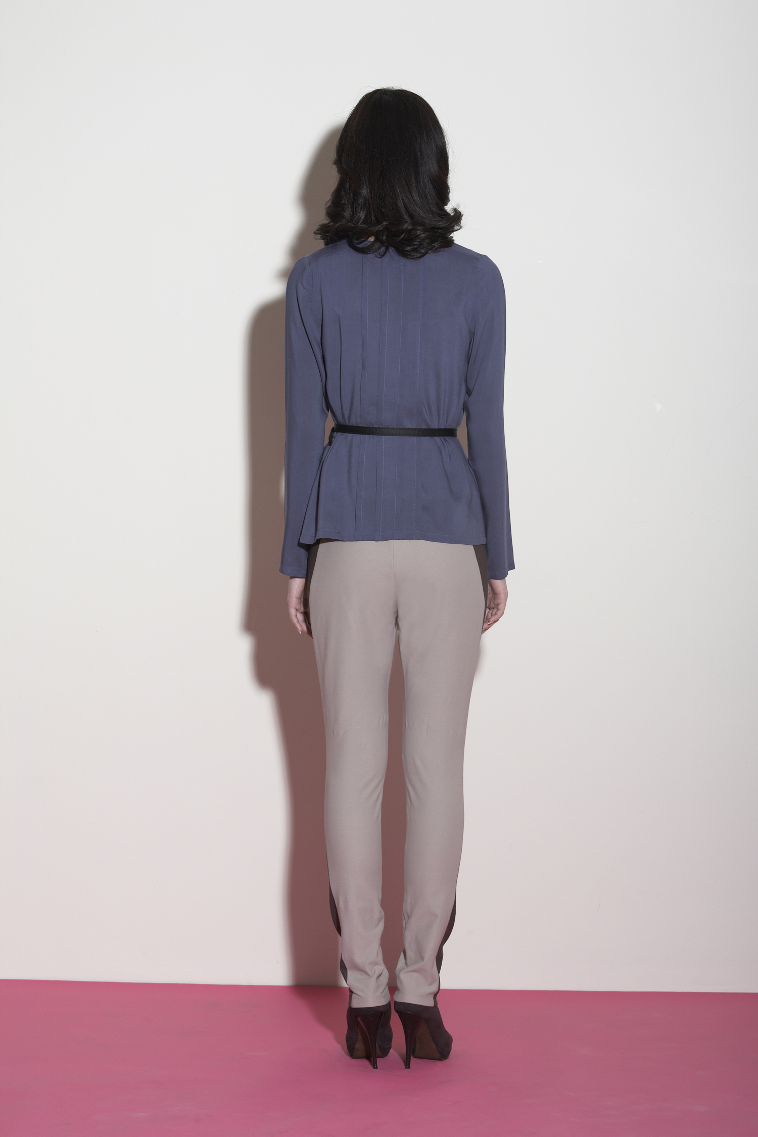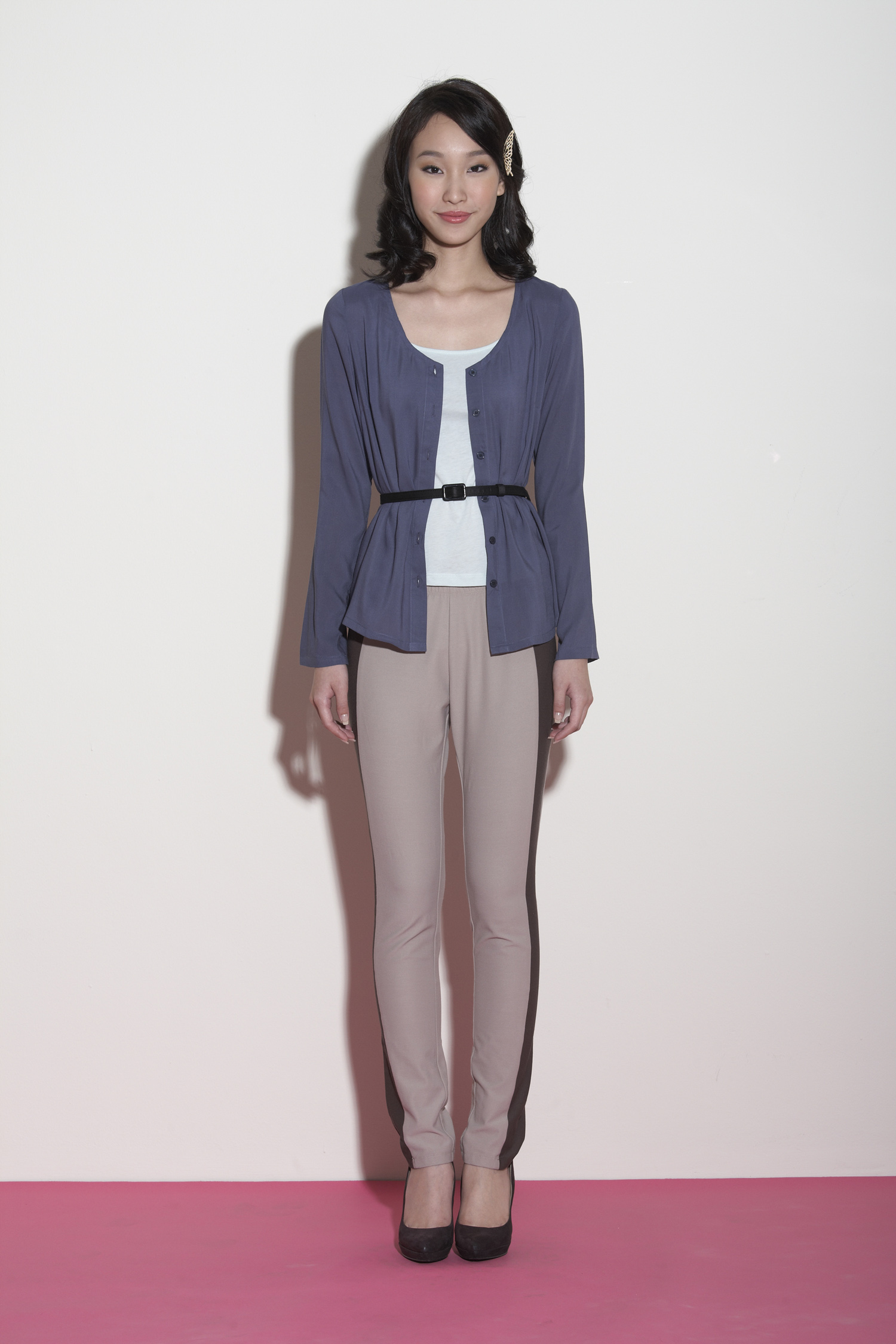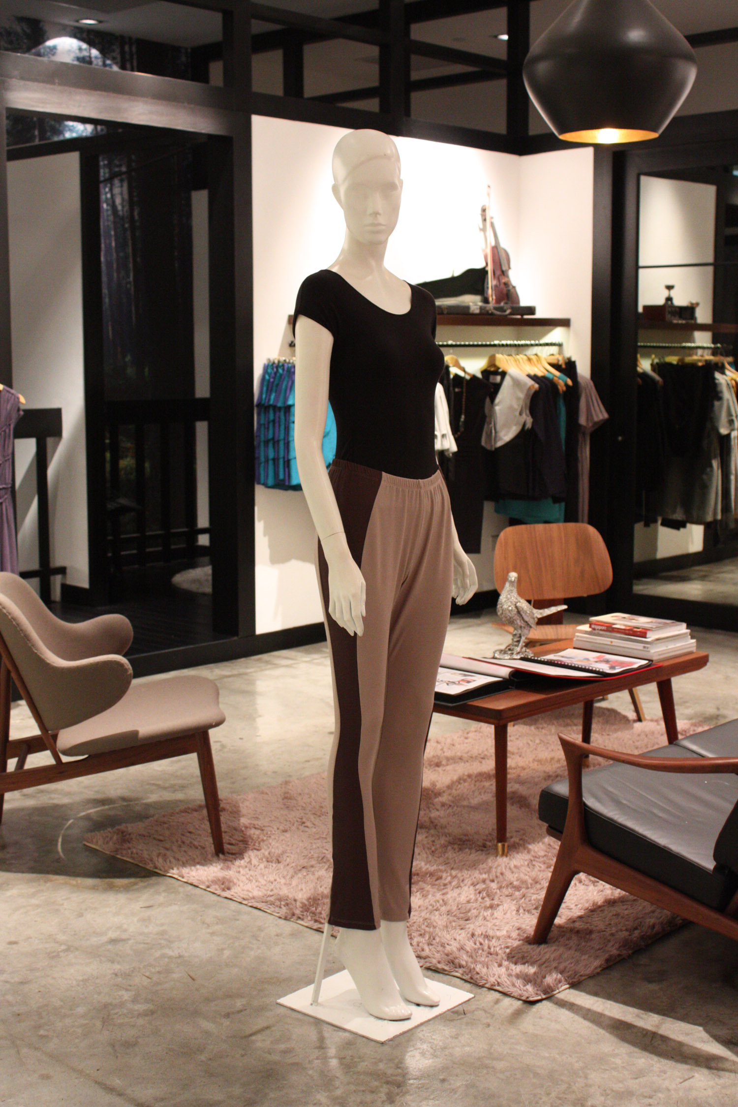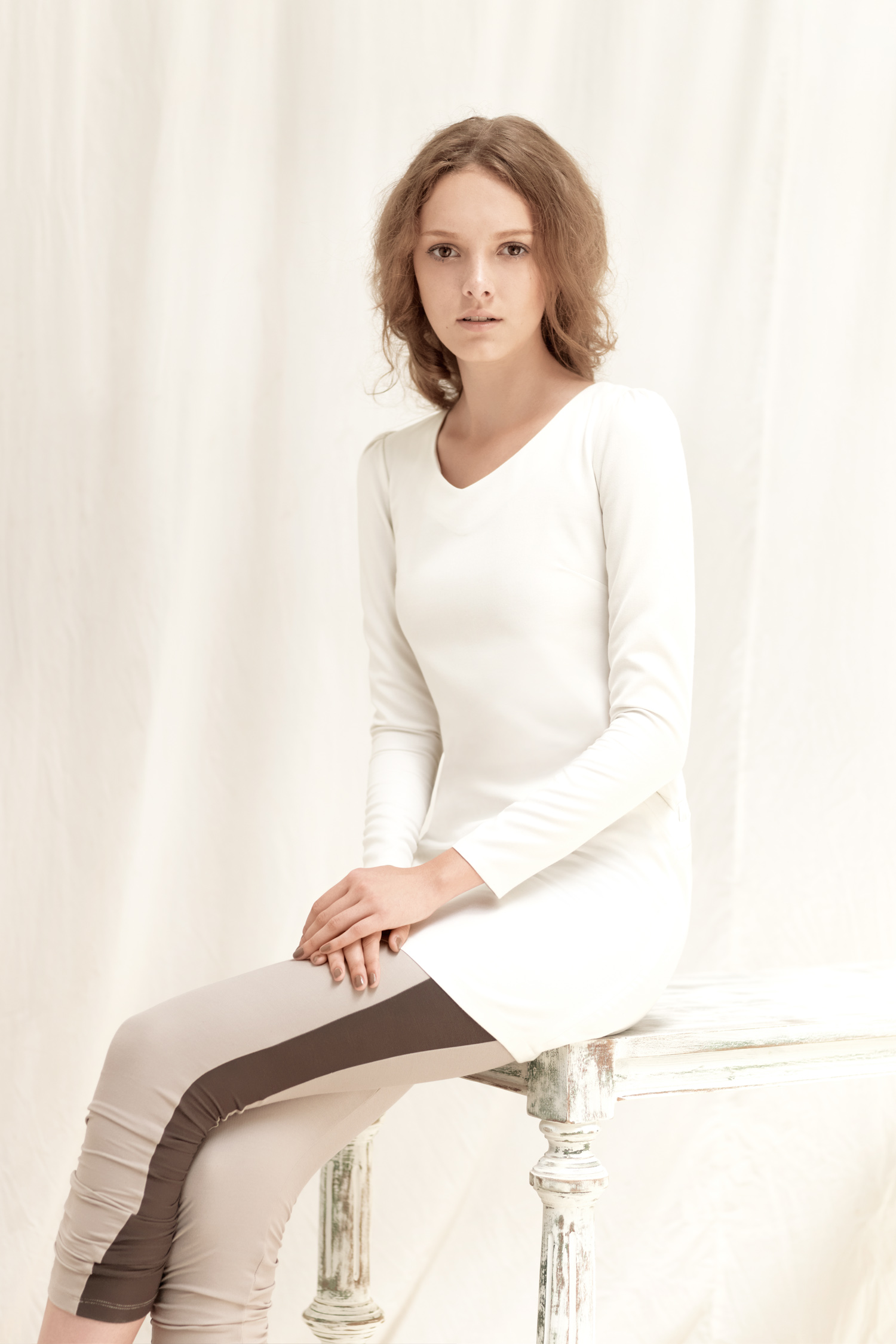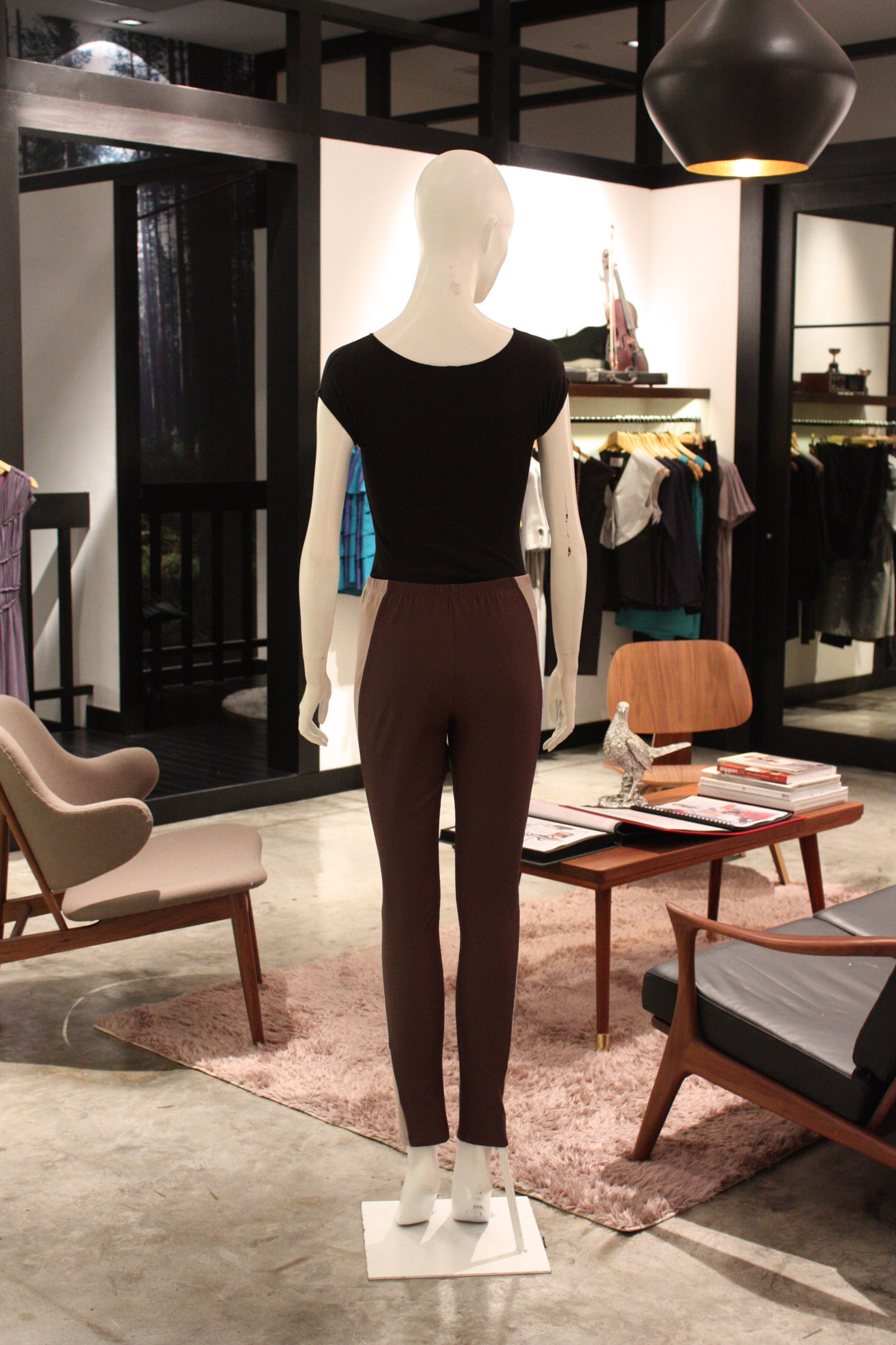 Two-tone low waisted leggings Contrast vertical panel along the sides The panel narrows halfway down the leggings and widens again towards the hem Elasticized narrow waistband