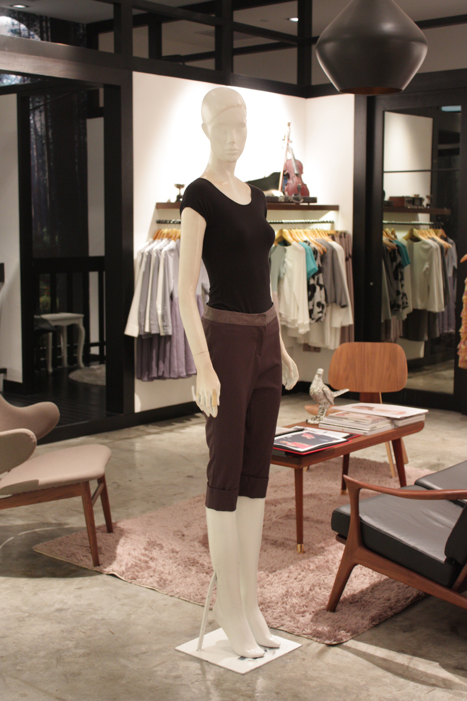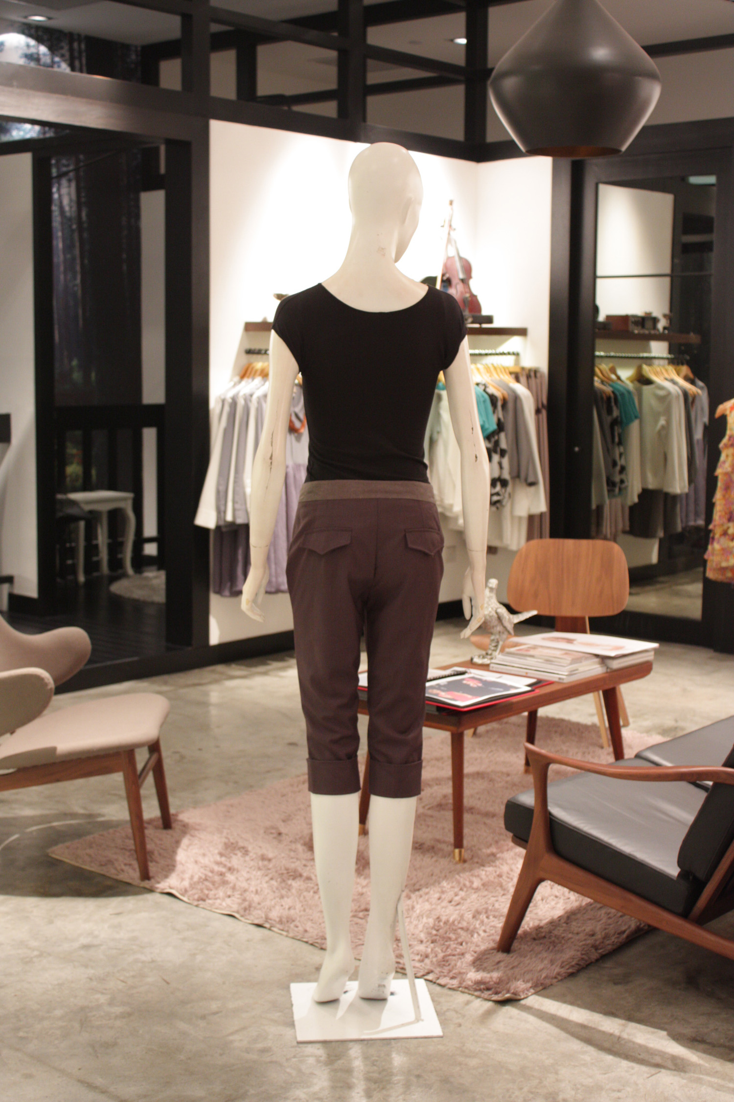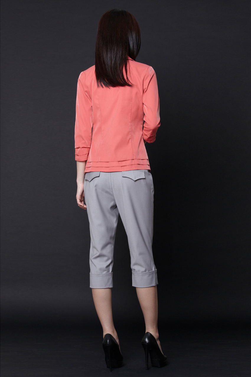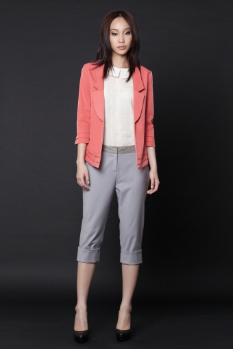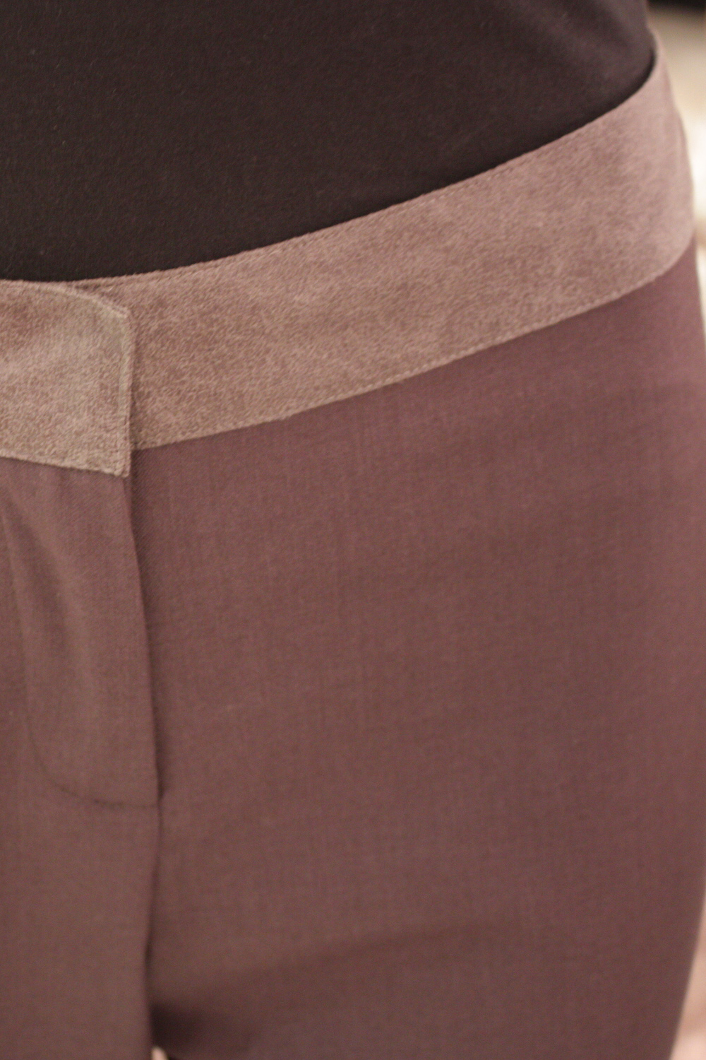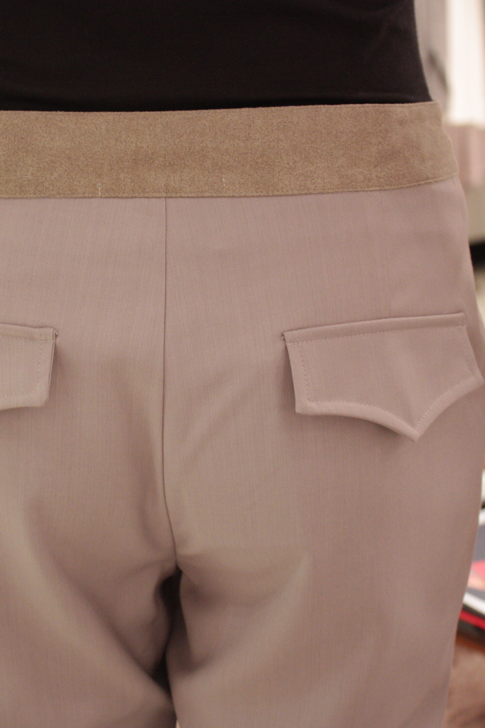 Flat front cropped pants Features a contrast waistband and cuffs on each leg 2 Faux flap pockets at the back Flaps have a curve pointed design Double concealed hook and eye closure with a zip at the front