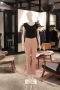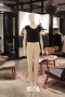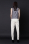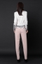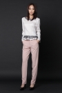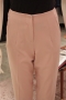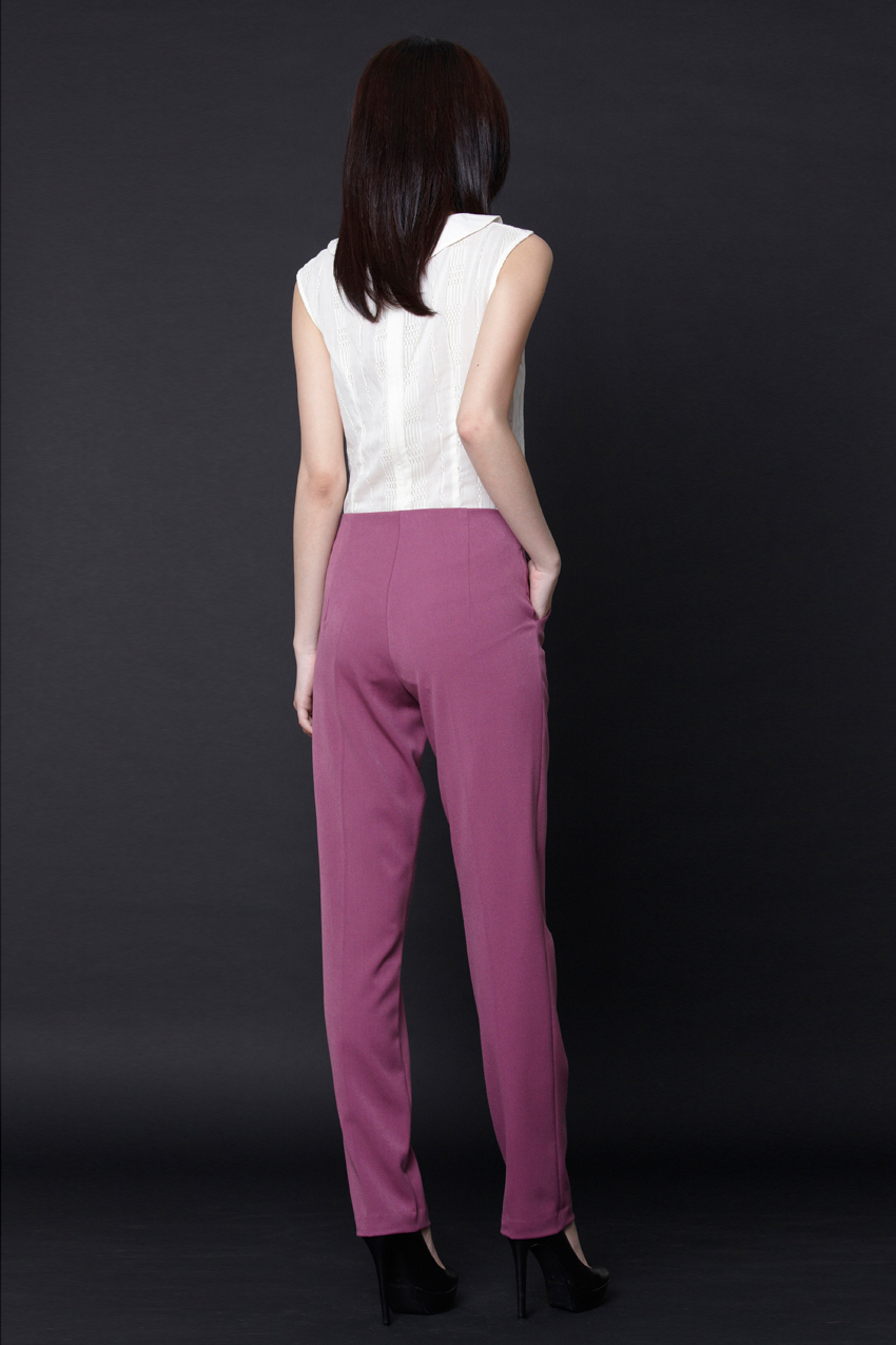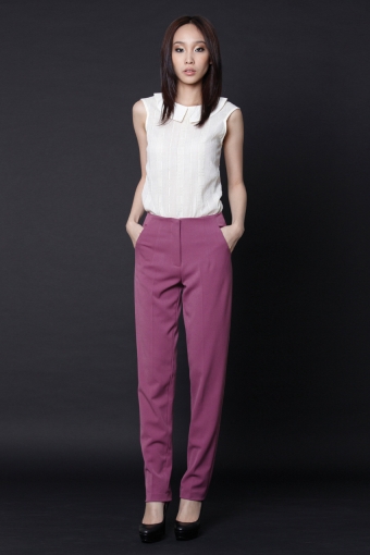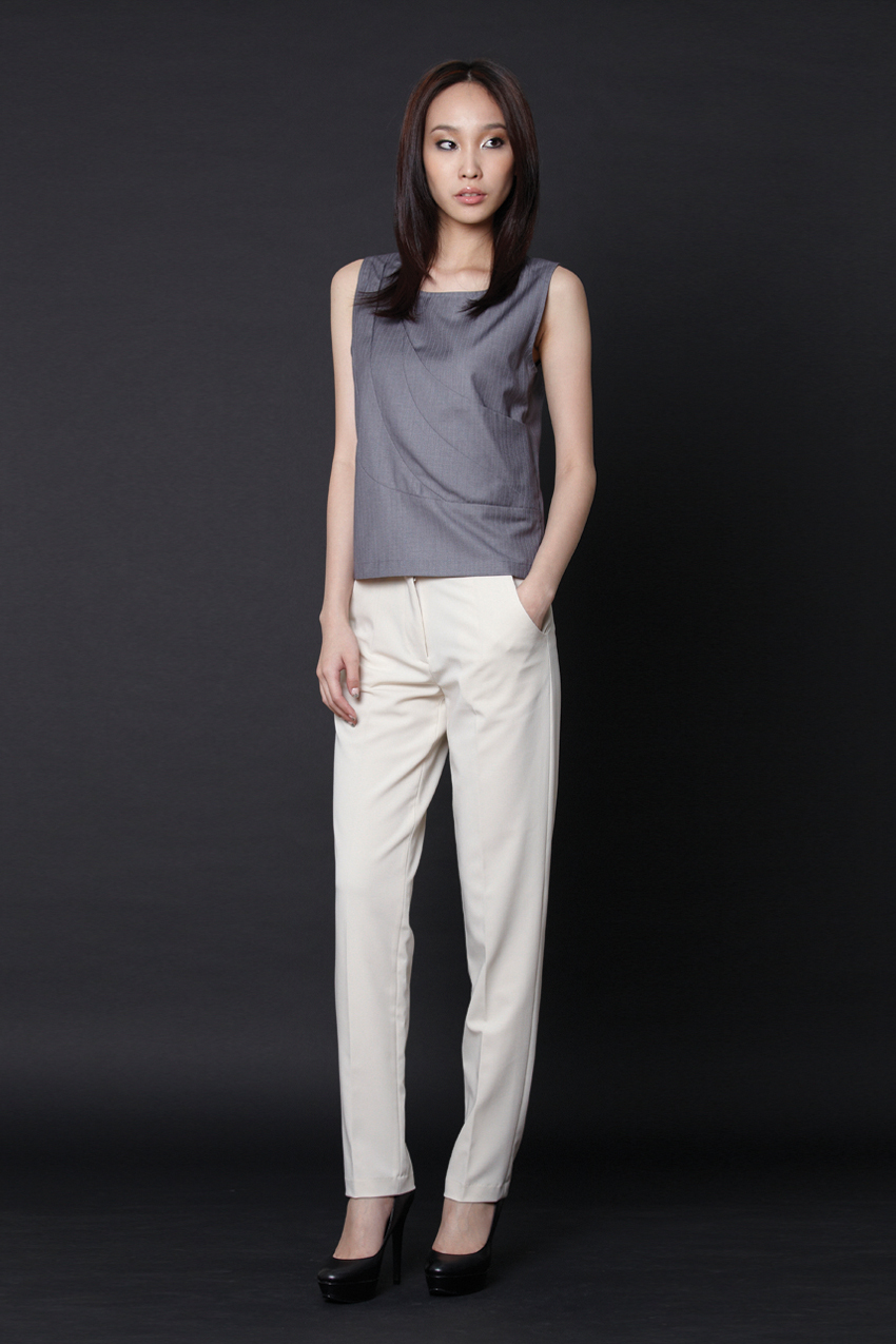 Flat front straight leg pants with darts at the waist Does not have a waistband Has 2 slanted hip pockets at the sides Single concealed hook and eye closure with a zip at the front