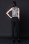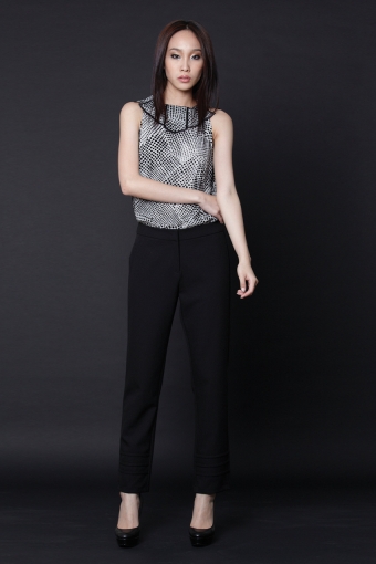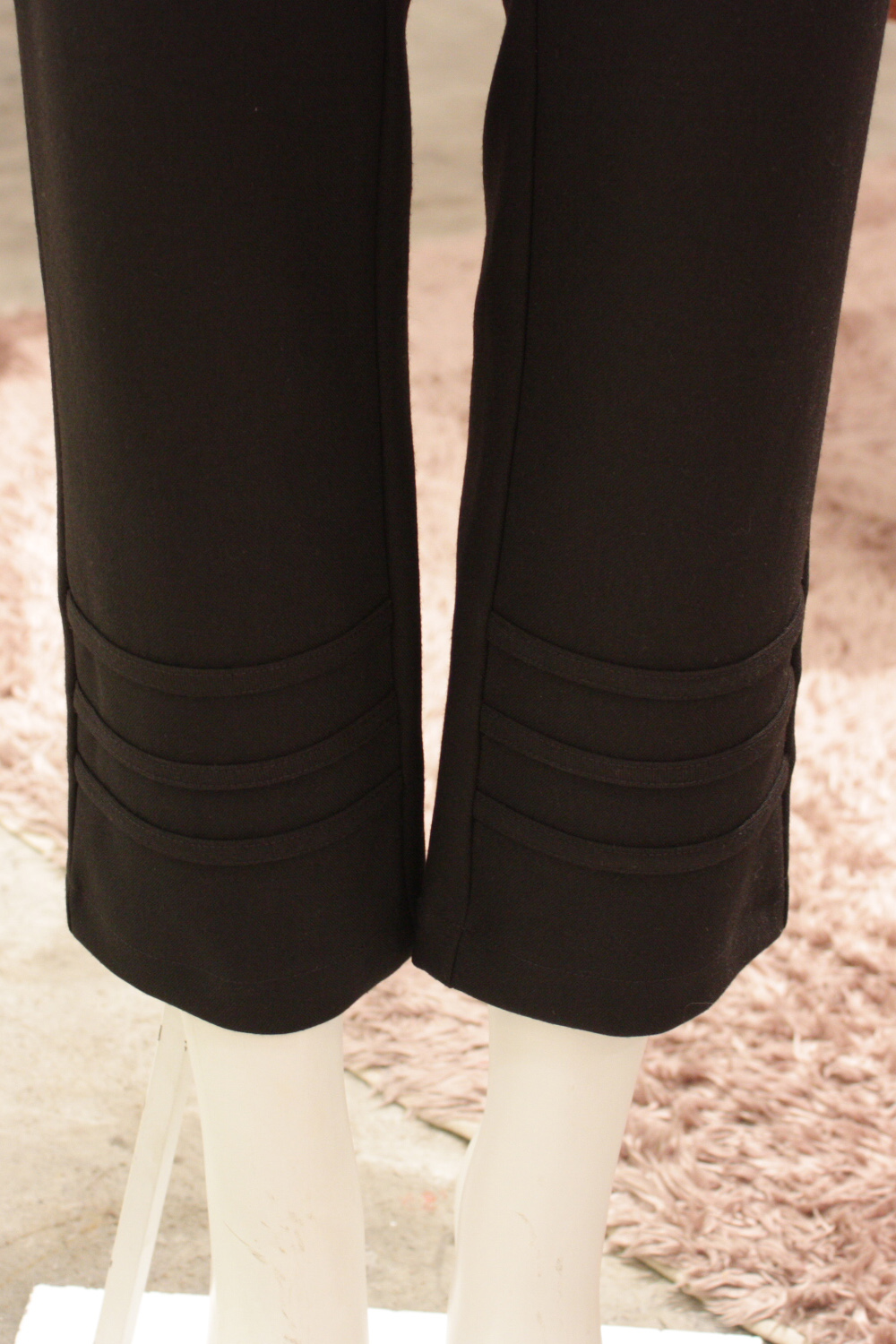 Flat front straight leg ankle pants Features 3 horizontal stripes at the front of each leg near the bottom Double concealed hook and eye closure with a zip at the front