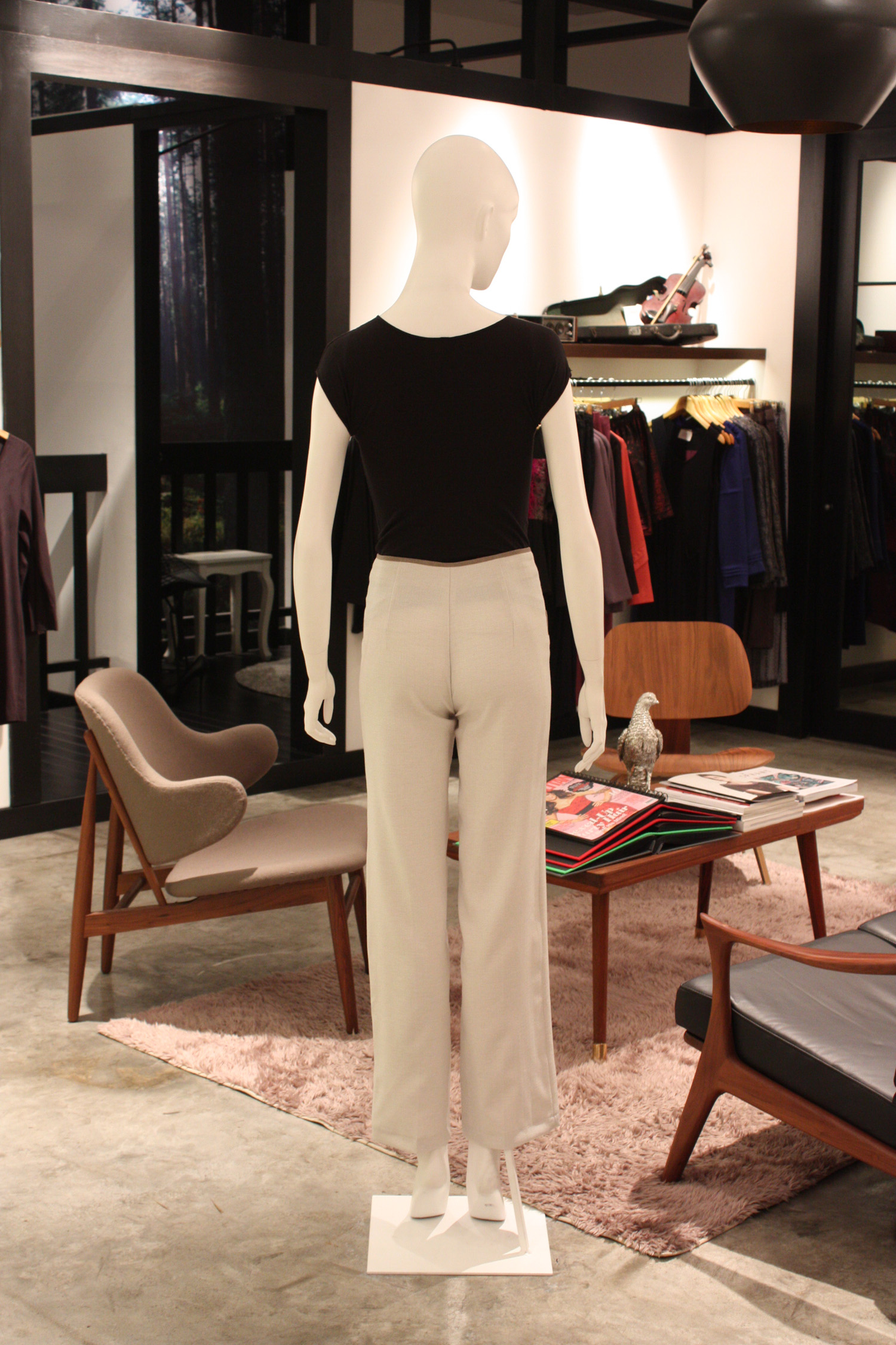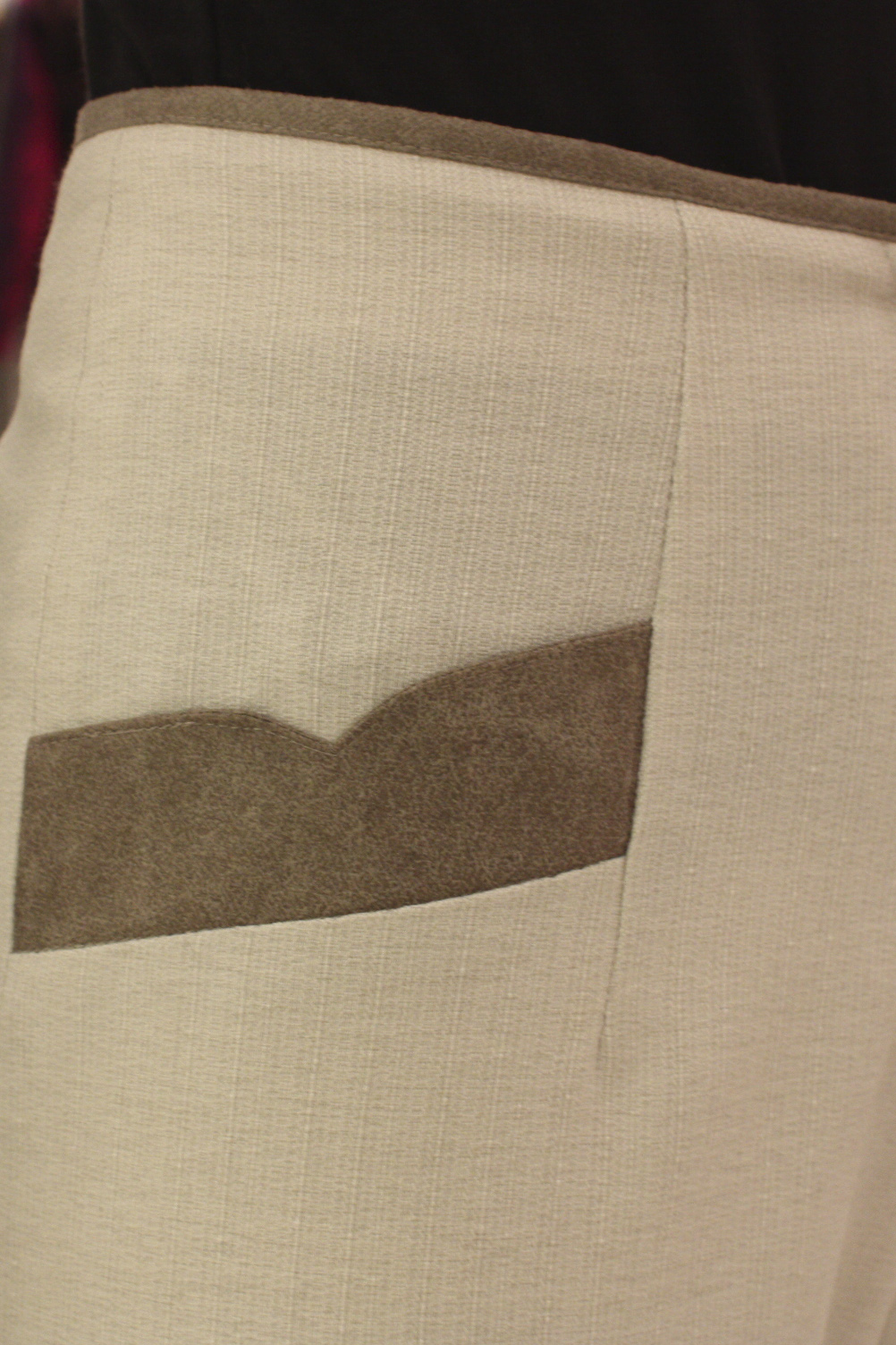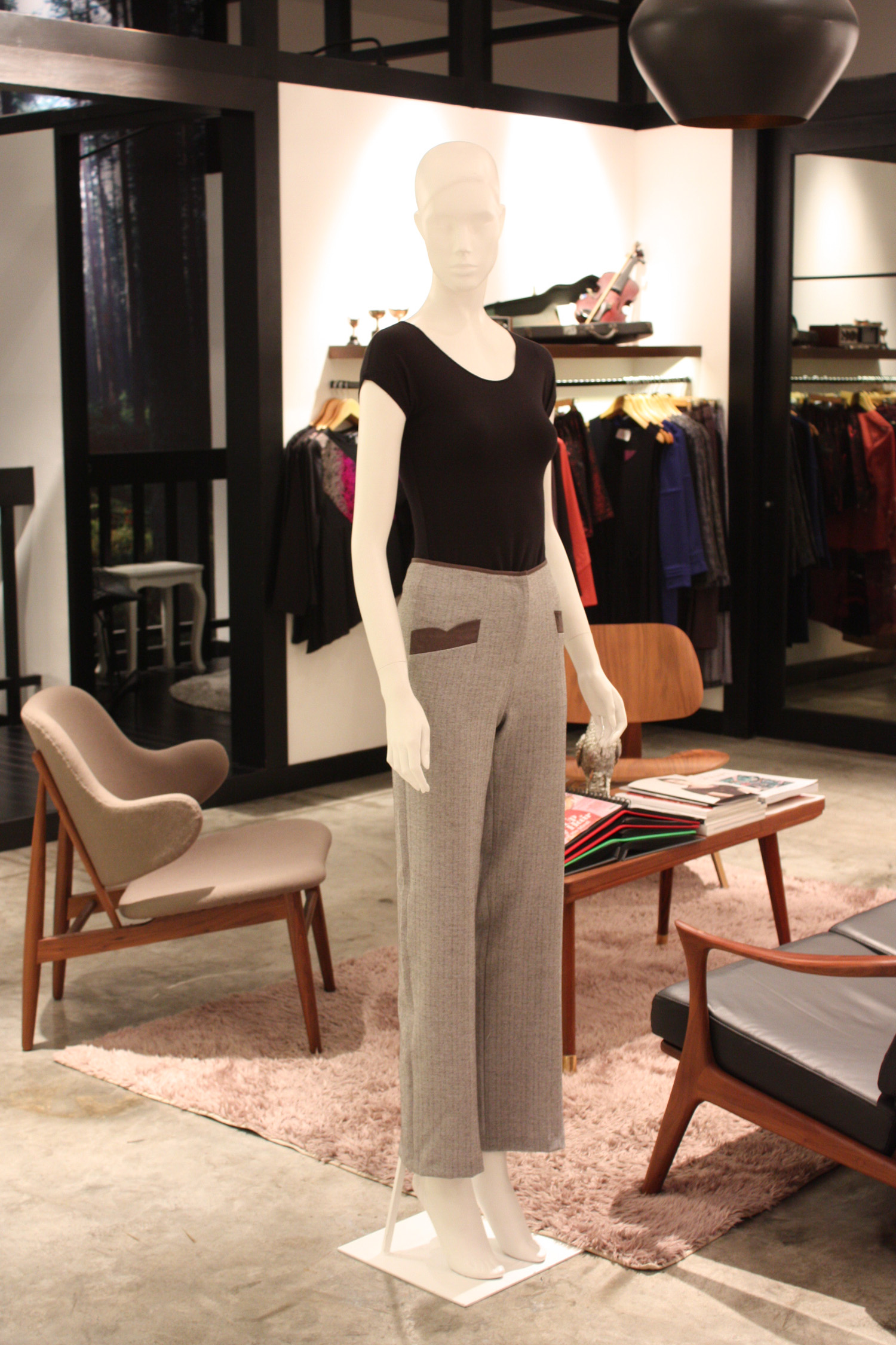 High waisted flat front straight leg pants Contrast binding at the waistline 2 Diagonal faux welt pockets with a unique notched design Double concealed hook and eye closure with a zip at the front
