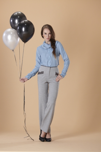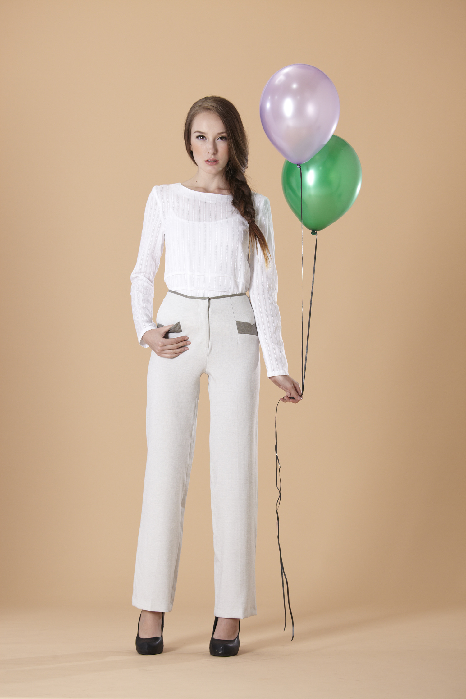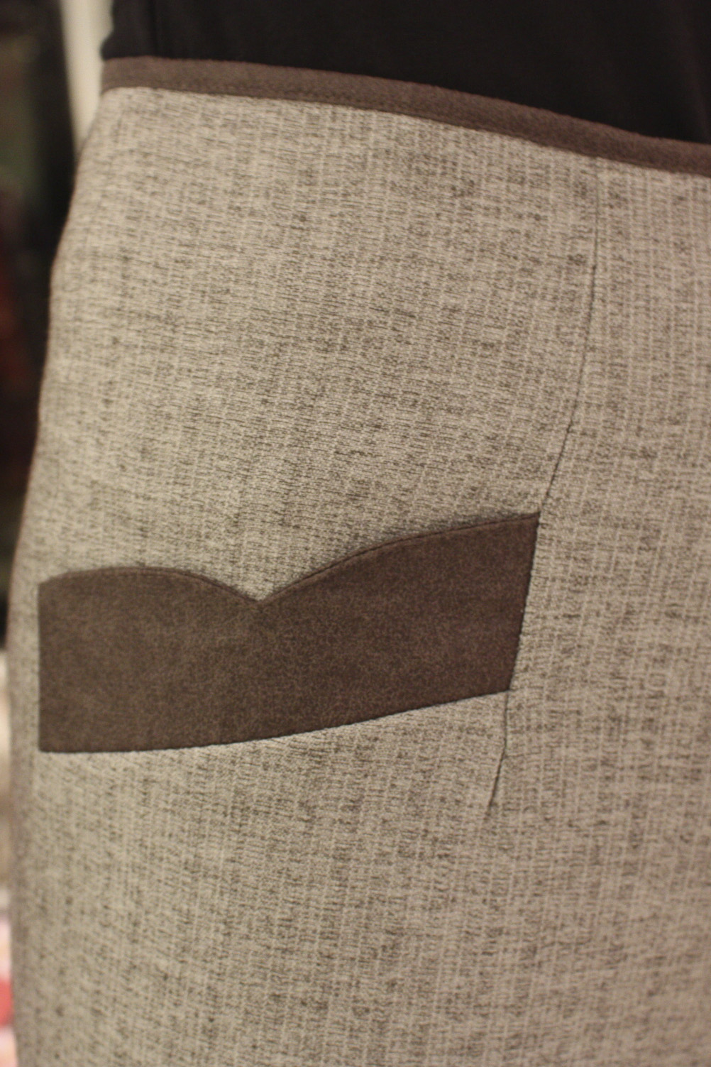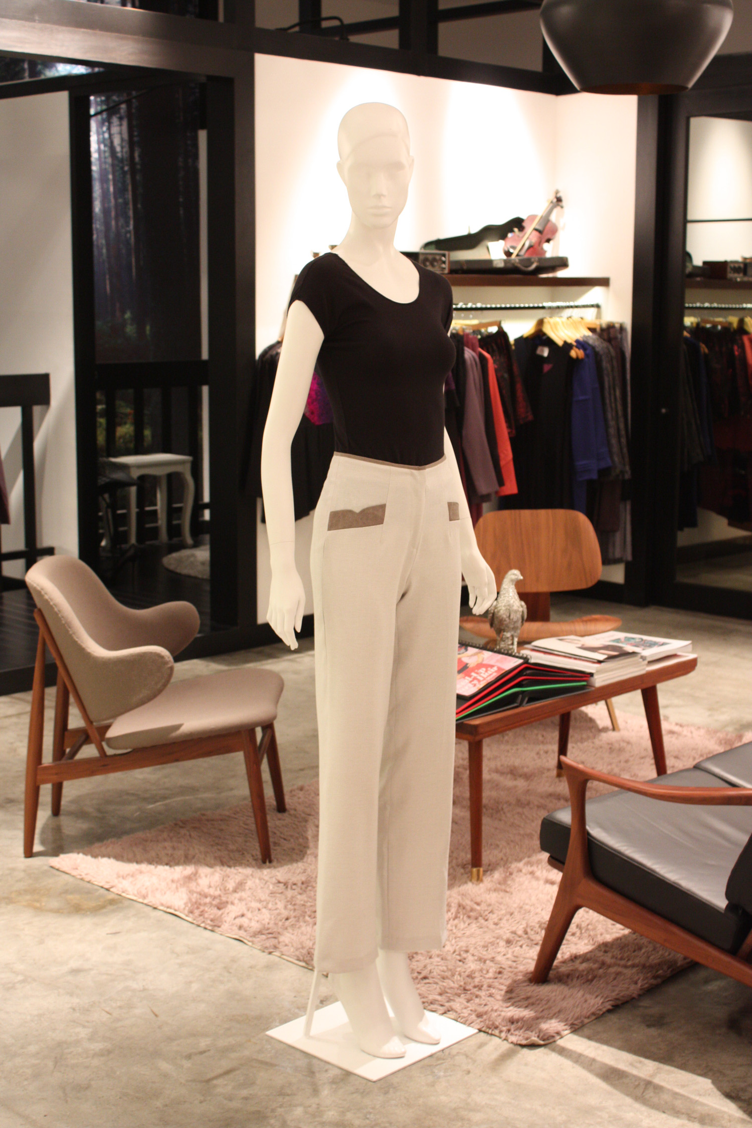 High waisted flat front straight leg pants Contrast binding at the waistline 2 Diagonal faux welt pockets with a unique notched design Double concealed hook and eye closure with a zip at the front