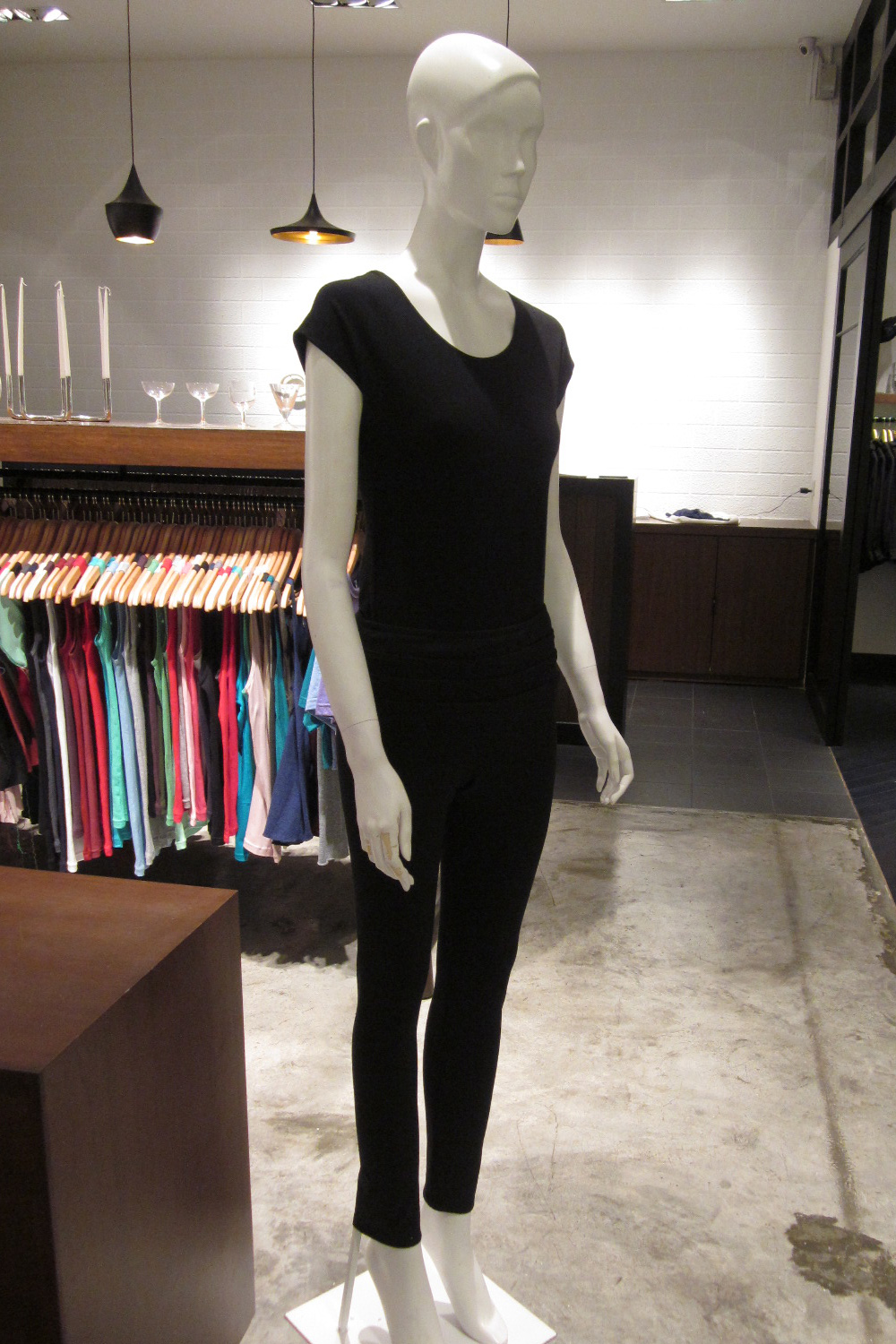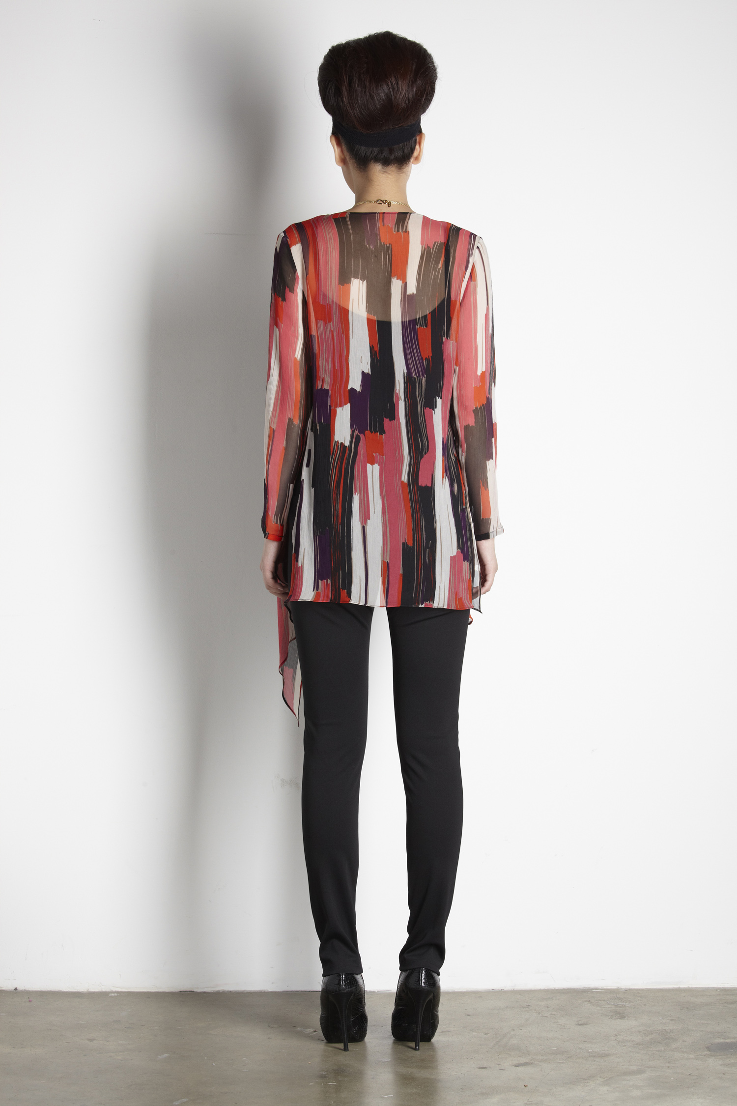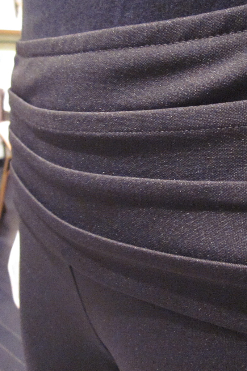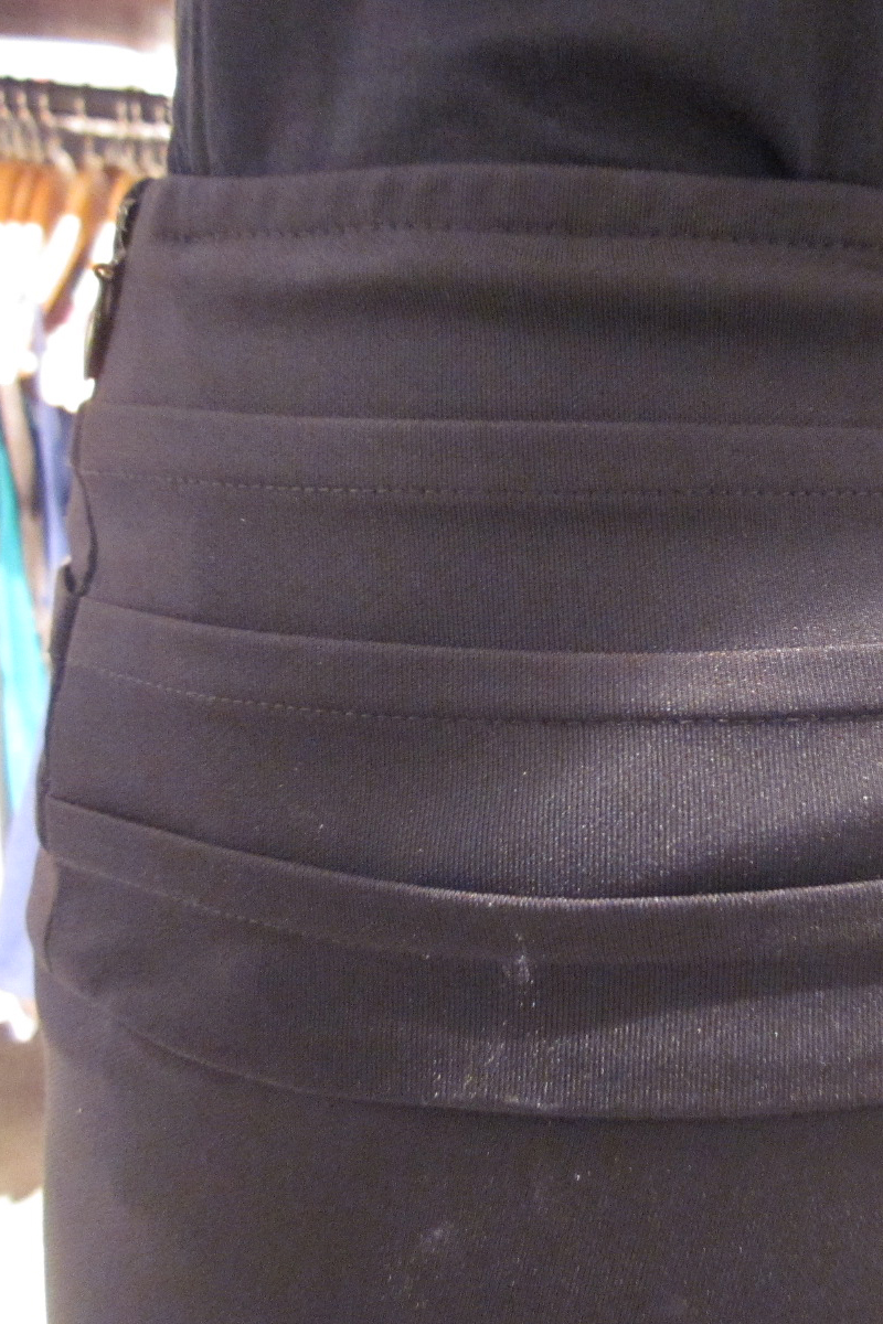 Skinny flat front pants Wide waist band with horizontal pleats running from the front to the back Concealed side zip with hook and eye Material is slightly stretchy
