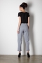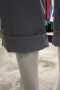 Overlap flap flat front pants Single button closure on the front flap with a pleat detail Hidden press stud to fasten the inner flap Zip with hook and bar closure at the centre front (below overlap) Cuffed hem on each leg