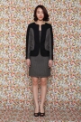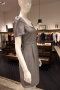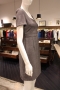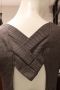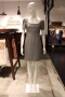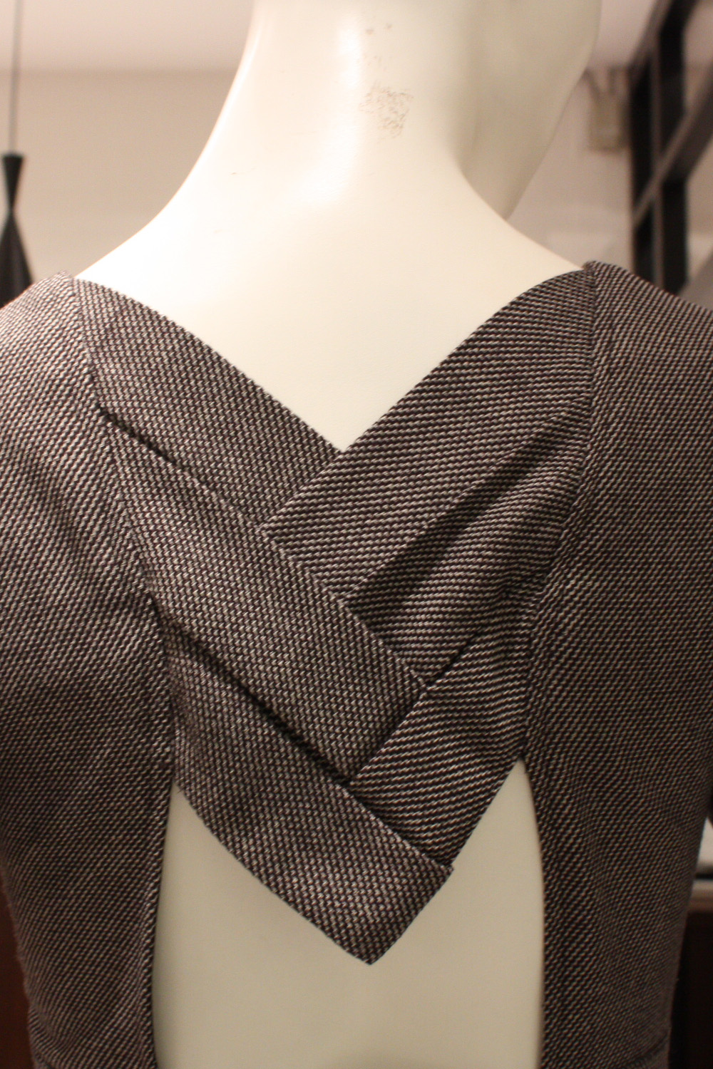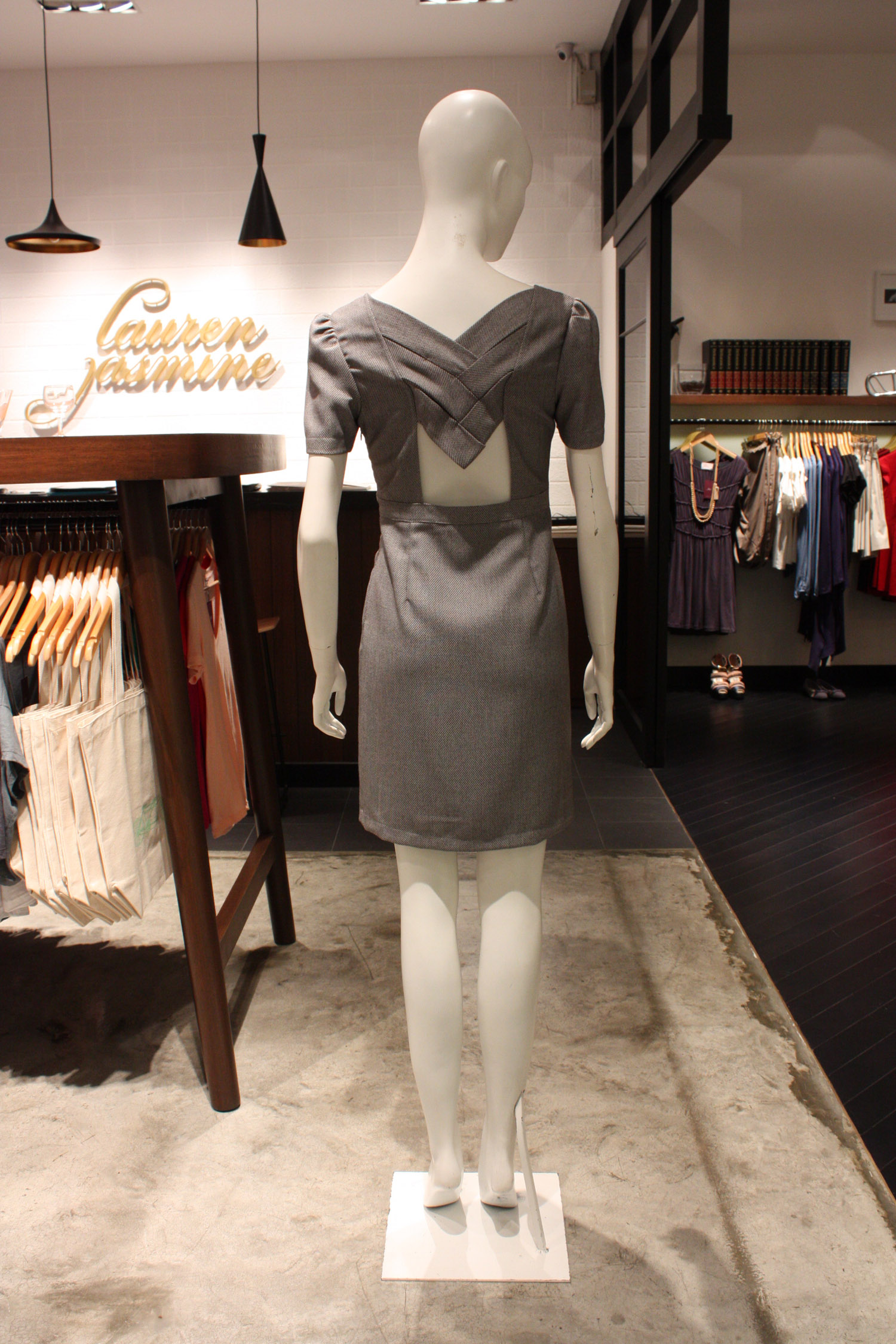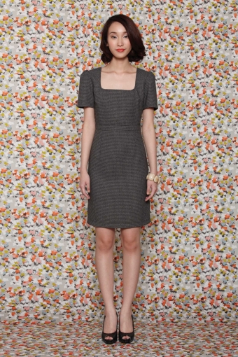 Short-sleeved waisted dress with a waistband Square neckline with ruching on the shoulders Has a cut-out feature at the back with a woven chevron detail above it Straight skirt Fully lined