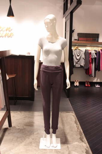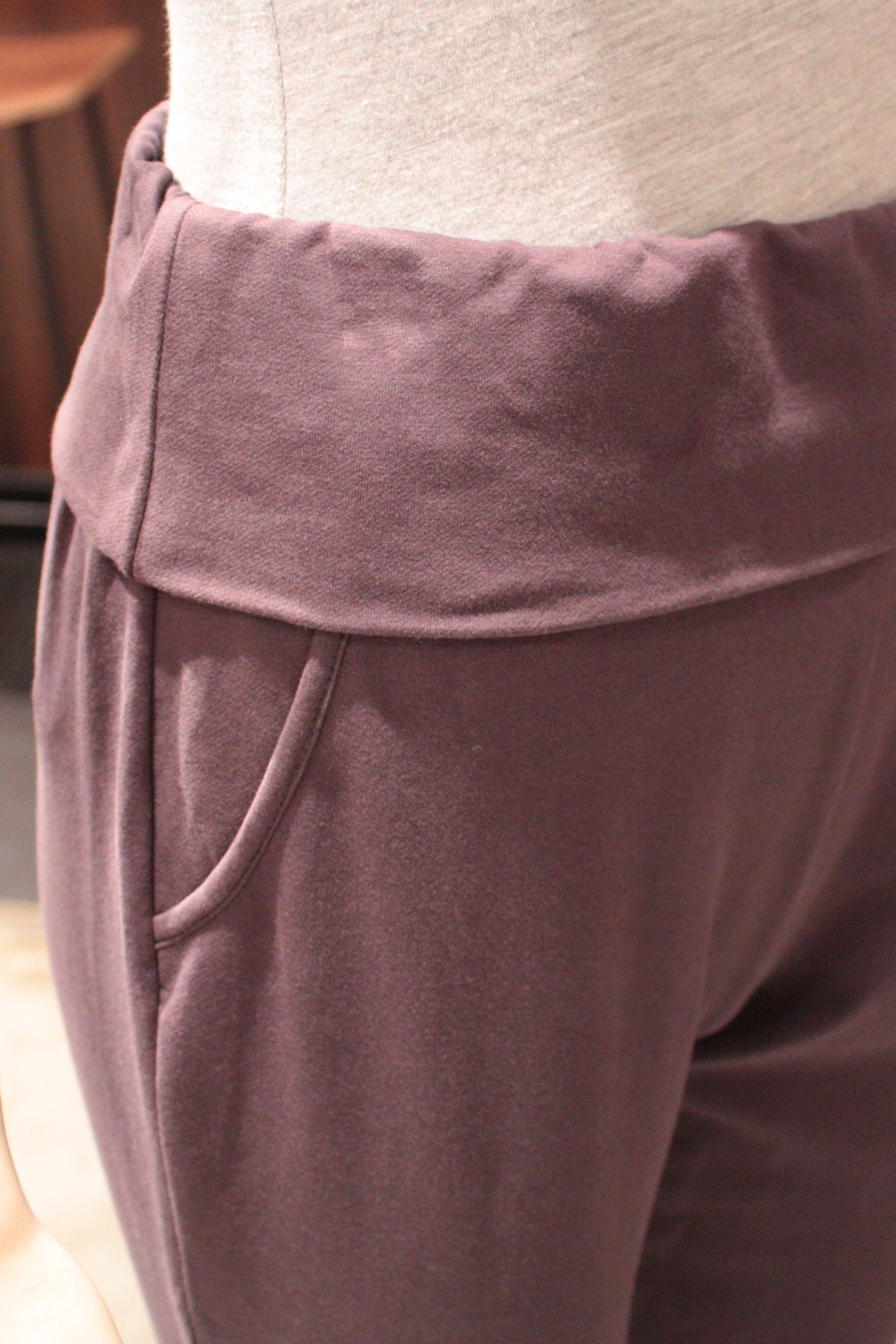 Straight-legged stretchy pants with cuffs on each leg Elasticized wide waistband Foldover detail that can be worn up or folded down 2 Faux side pockets Belt not included