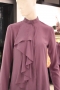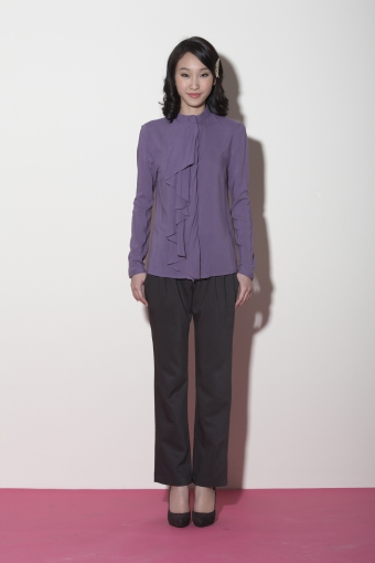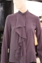 Long sleeved button down shirt with a mandarin collar Oversized ruffle at the front, from the collar to the hem Concealed closure with 7 inverted buttons running down the centre front Narrow cuffs with a keyhole and single button closure