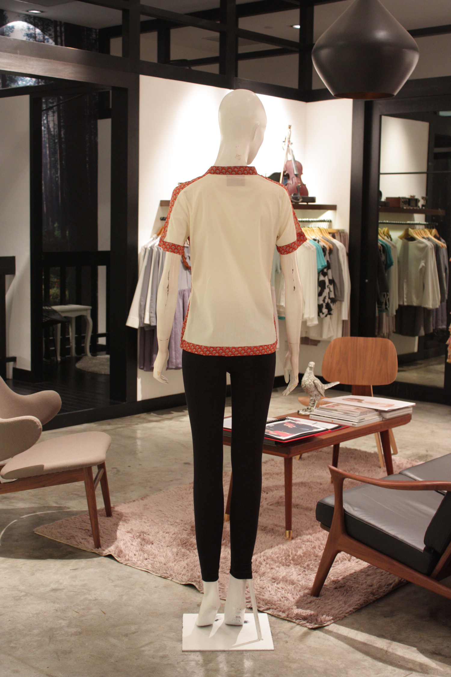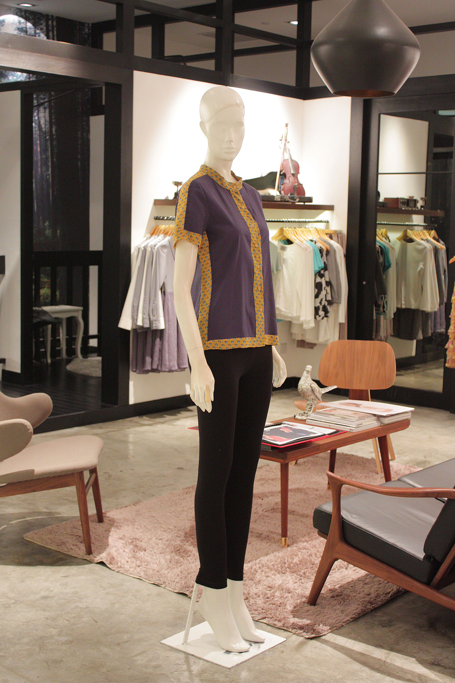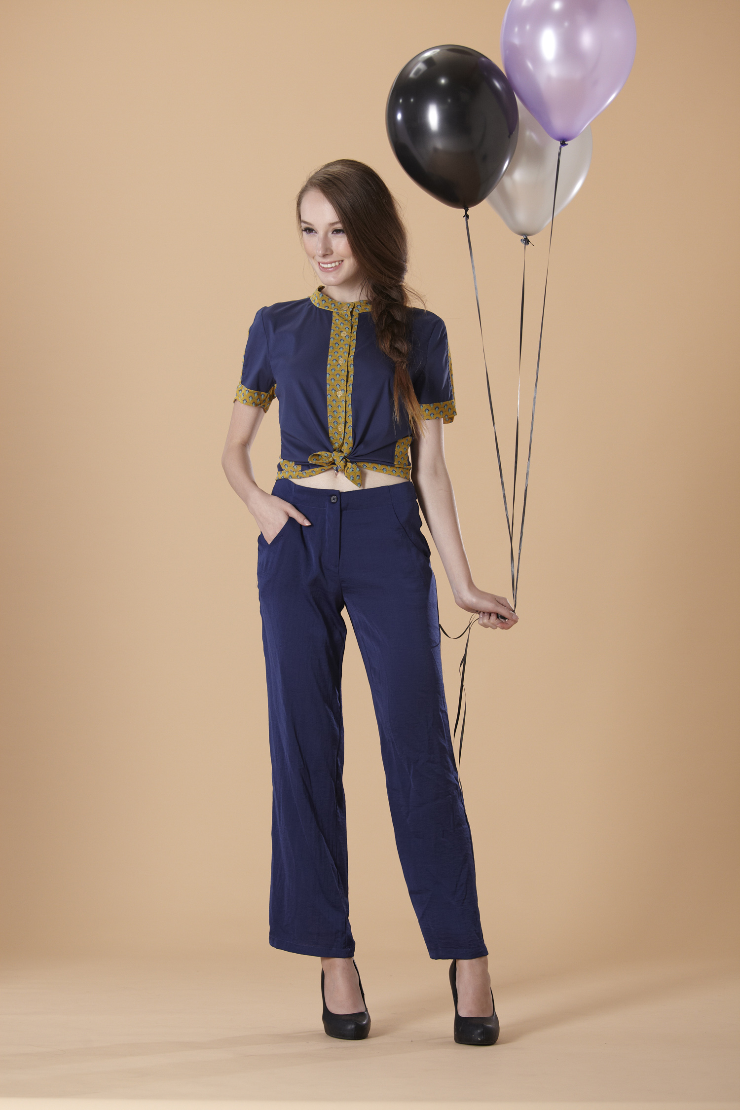 Short sleeved button down shirt Collarless with round contrast neckline Features contrast printed panels along the neckline, down the shoulders, placket, sides, hemline and at the cuffs 7-button closure down the centre front