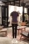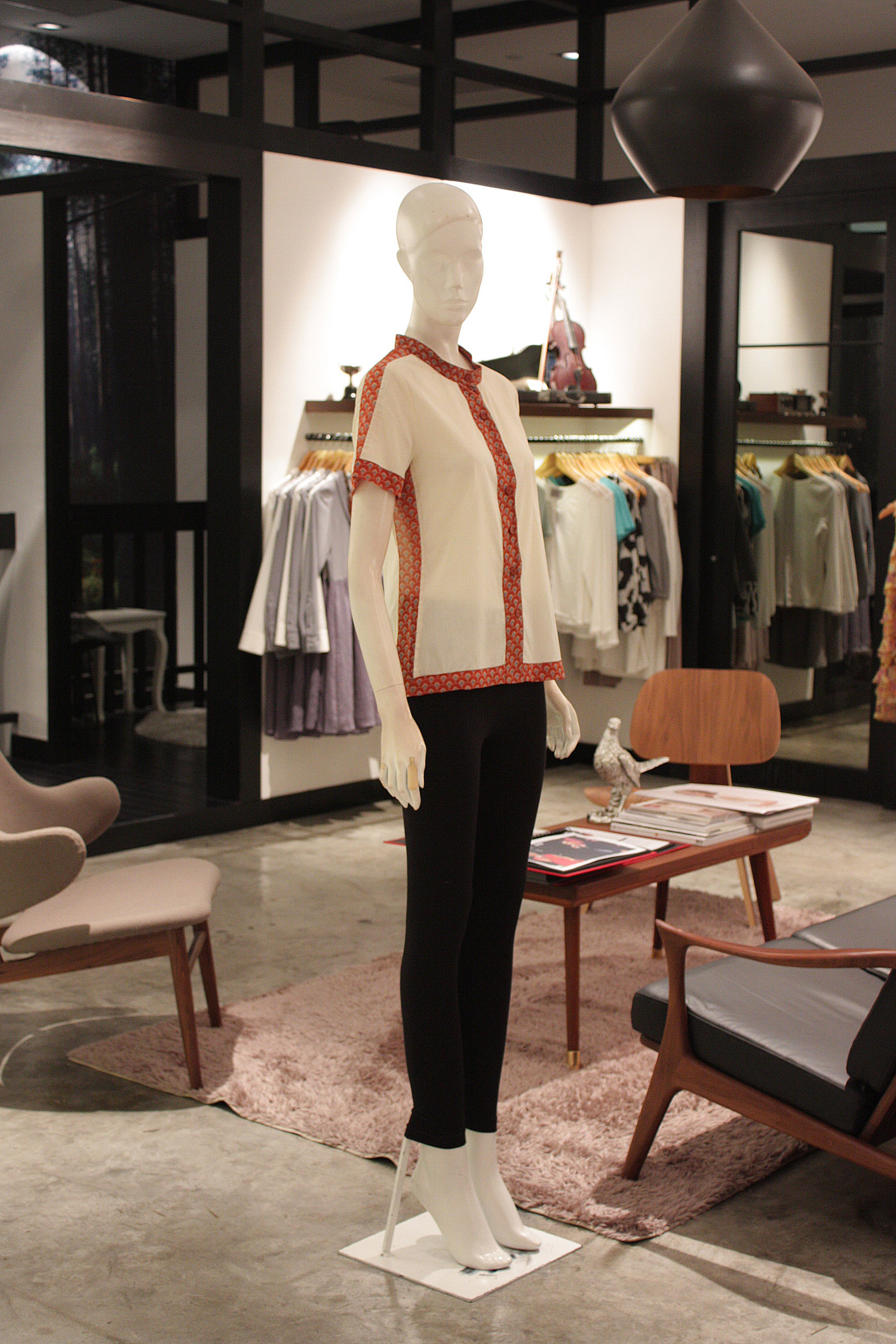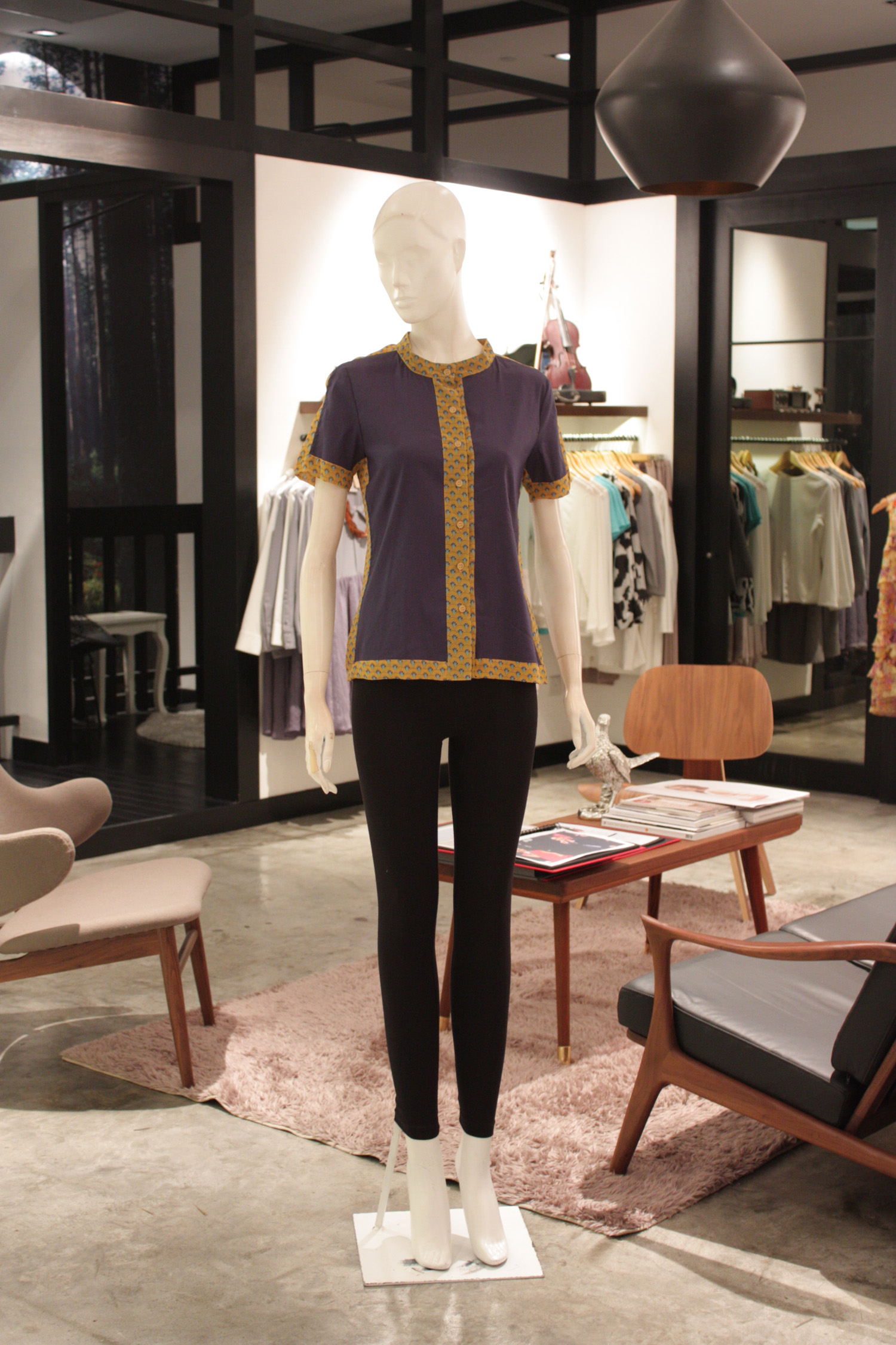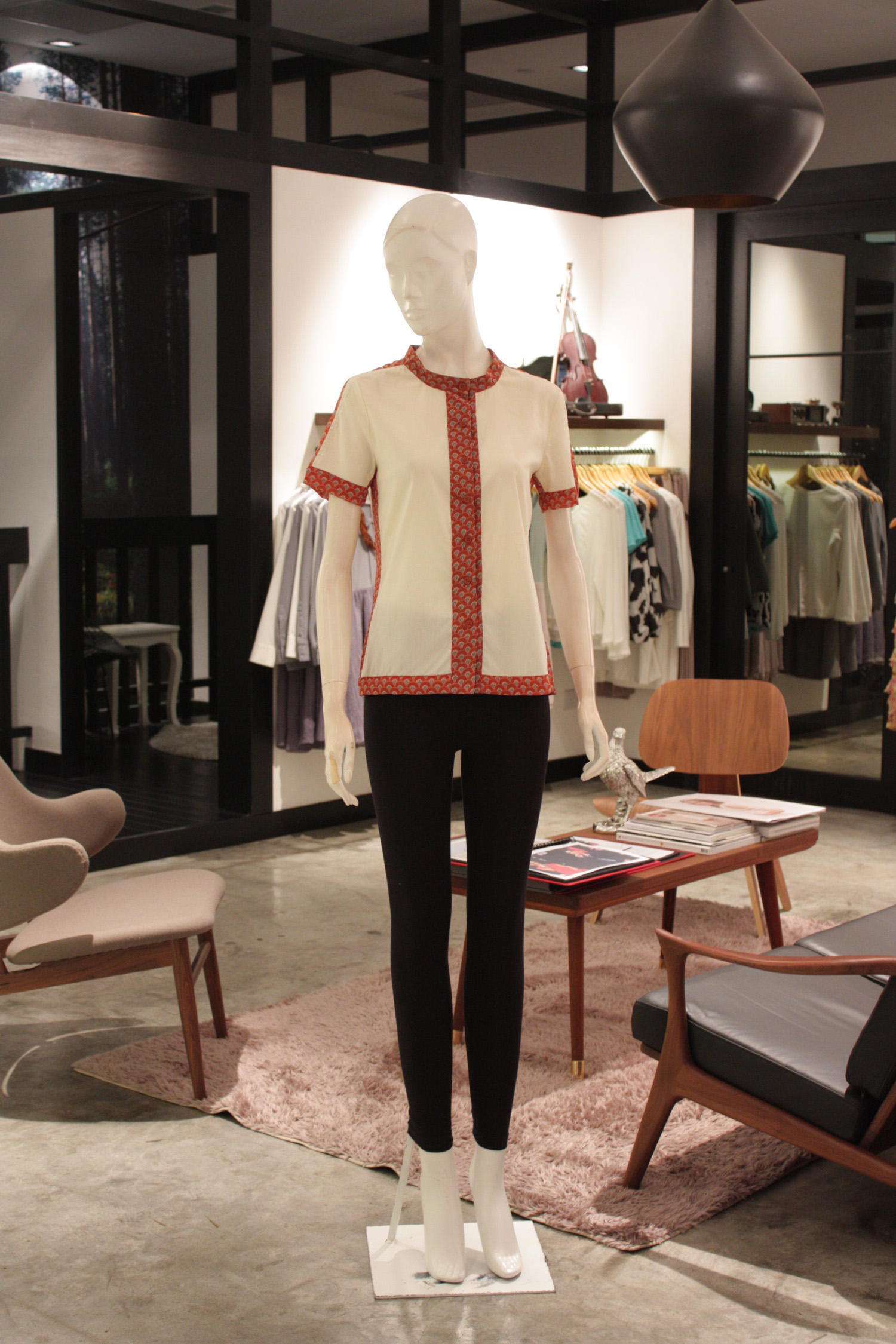 Short sleeved button down shirt Collarless with round contrast neckline Features contrast printed panels along the neckline, down the shoulders, placket, sides, hemline and at the cuffs 7-button closure down the centre front