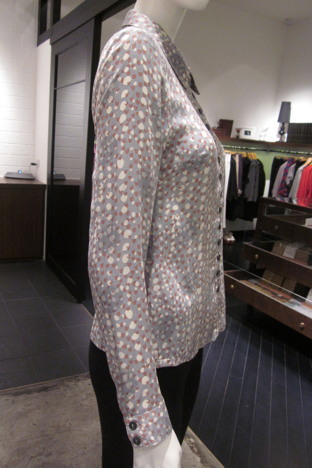 Button down shirt with a peter pan collar Printed fabric with mini hearts & irregular dots Long sleeves 14 Buttons running down the front 2 Buttons at each cuff