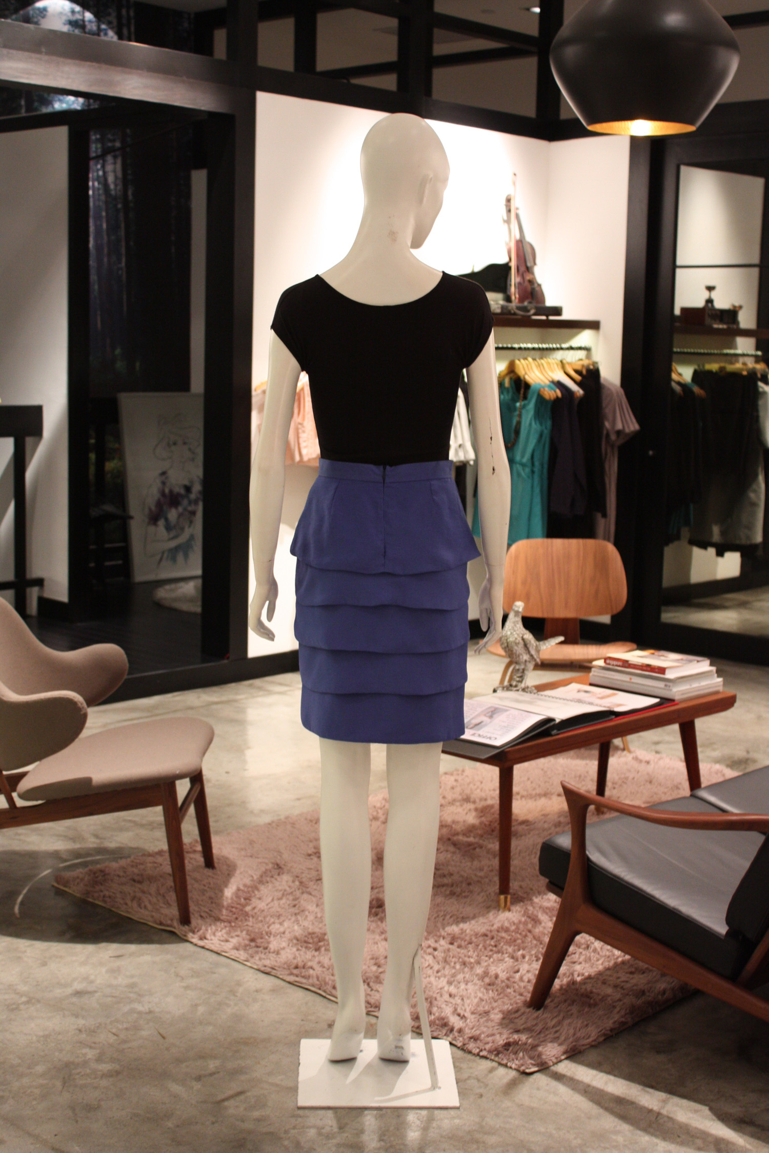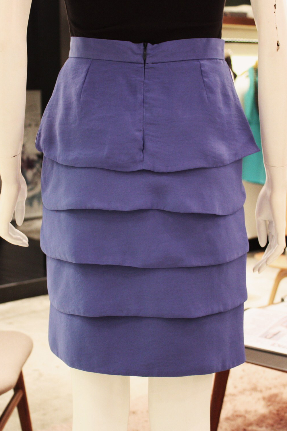 Tiered waisted tulip skirt 5 Wide tiers/layers Narrow waistband Concealed zip at the centre back with hook and eye Fully lined with acetate lining