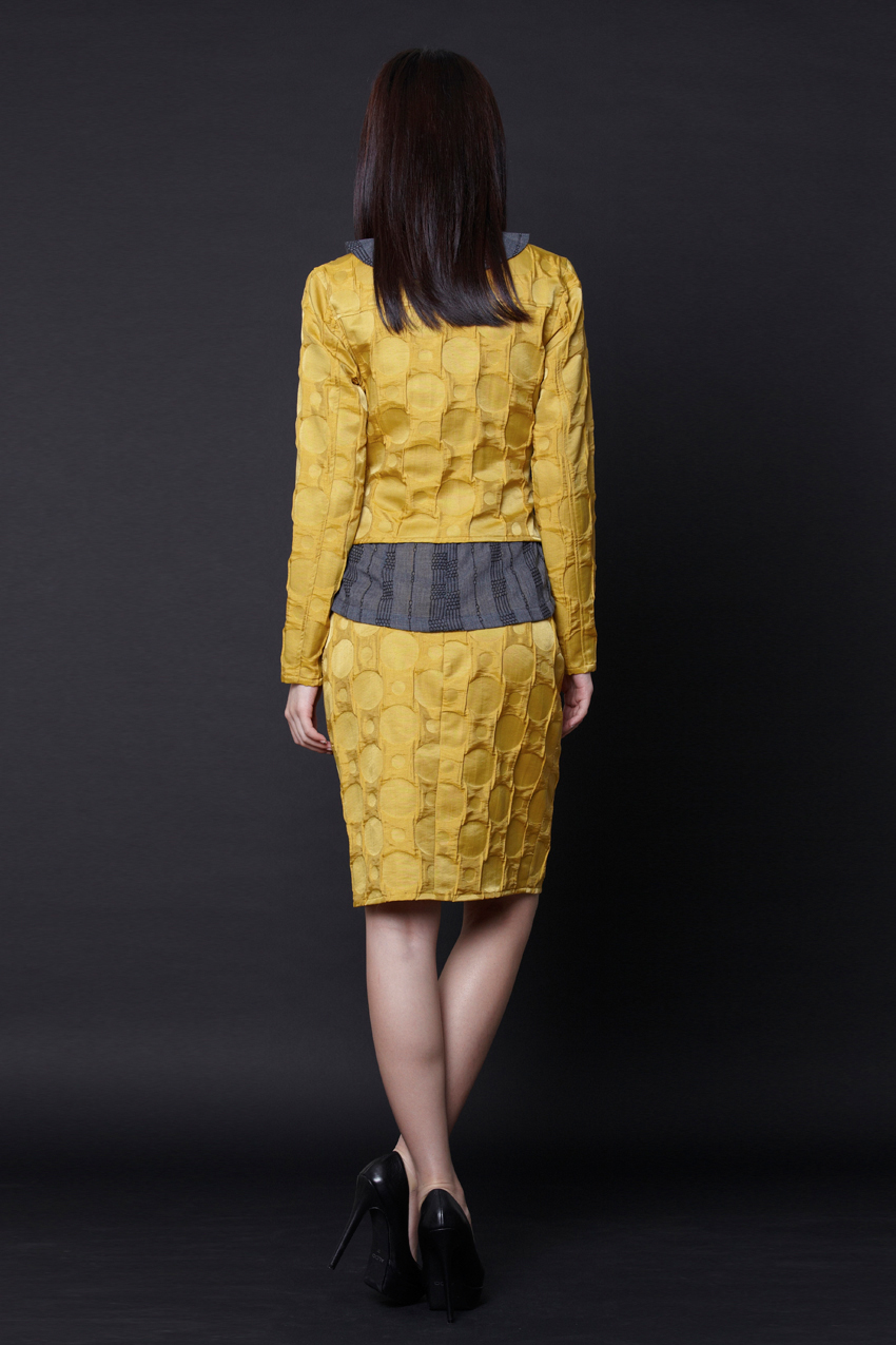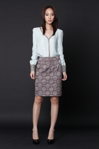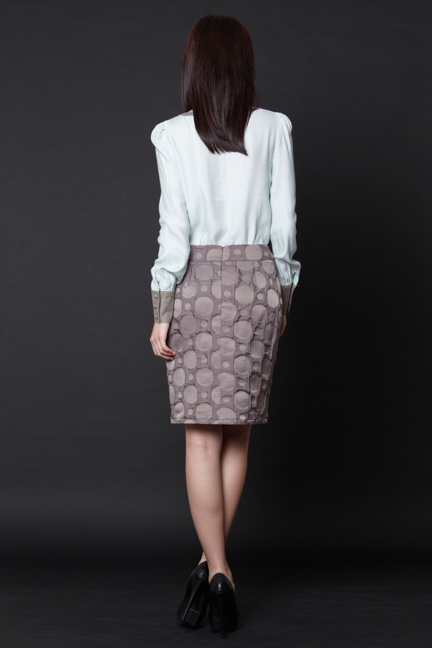 Pencil skirt Fabric is textured with embossed circles Features vertical creases throughout the fabric Concealed zip with hook and eye at the centre back Fully lined with acetate lining