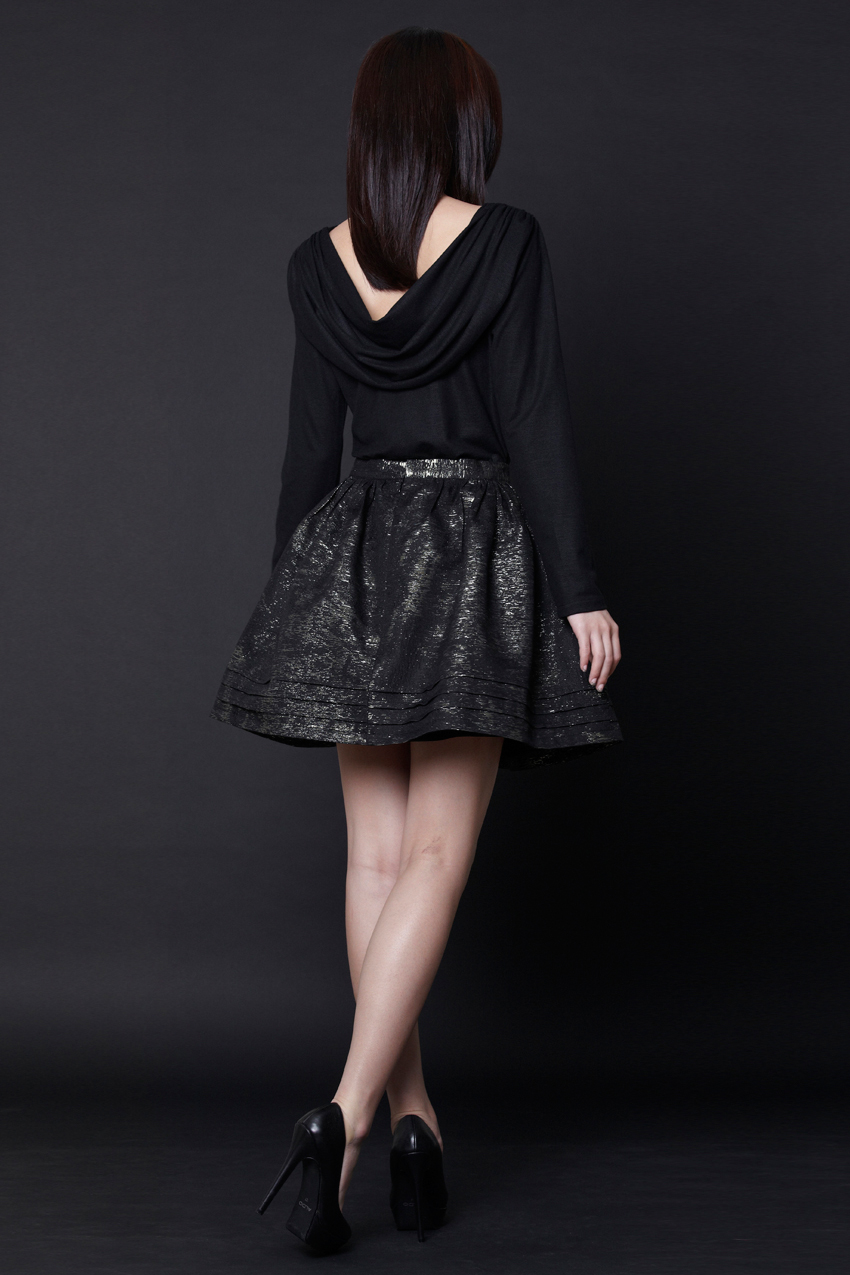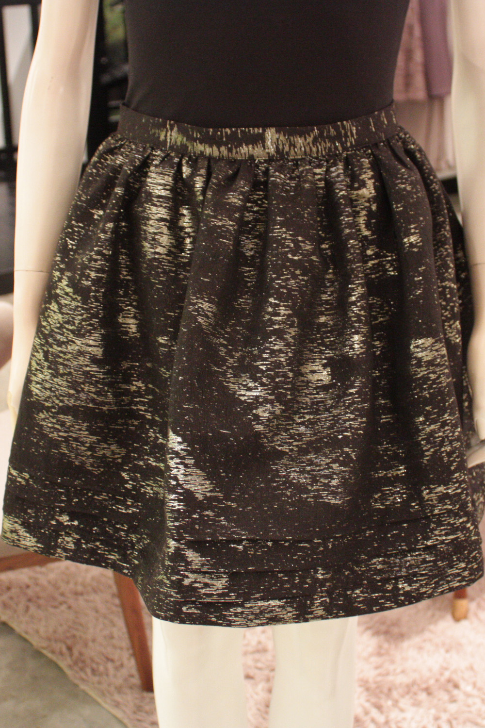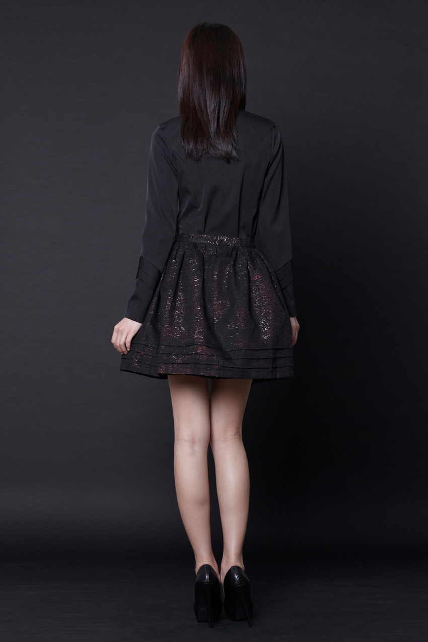 Waisted flared mini skirt Features ruching below the entire waistband Stiff textured metallic fabric with a duochrome effect Concealed zip with a hook and eye at the centre back Fully lined with acetate lining