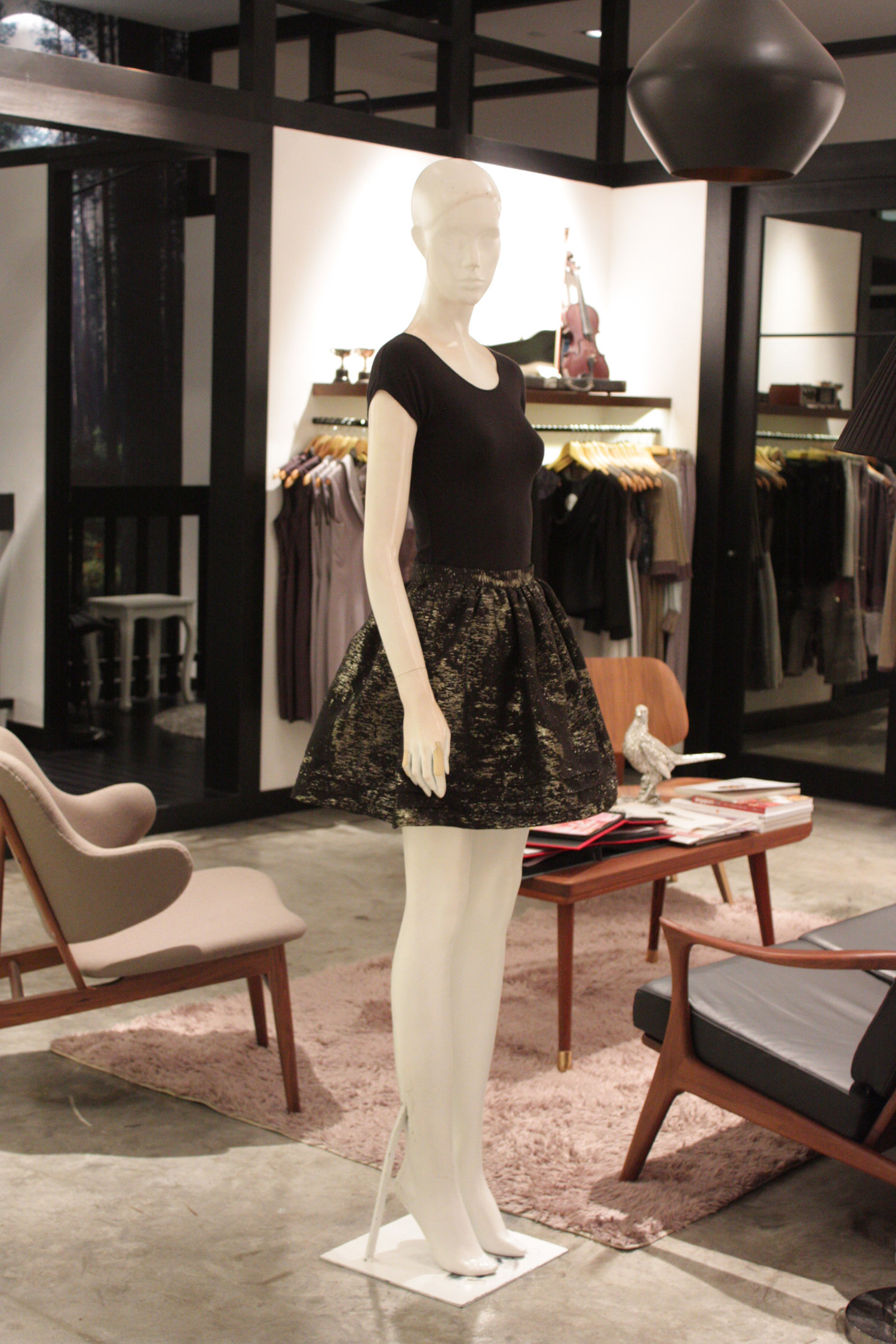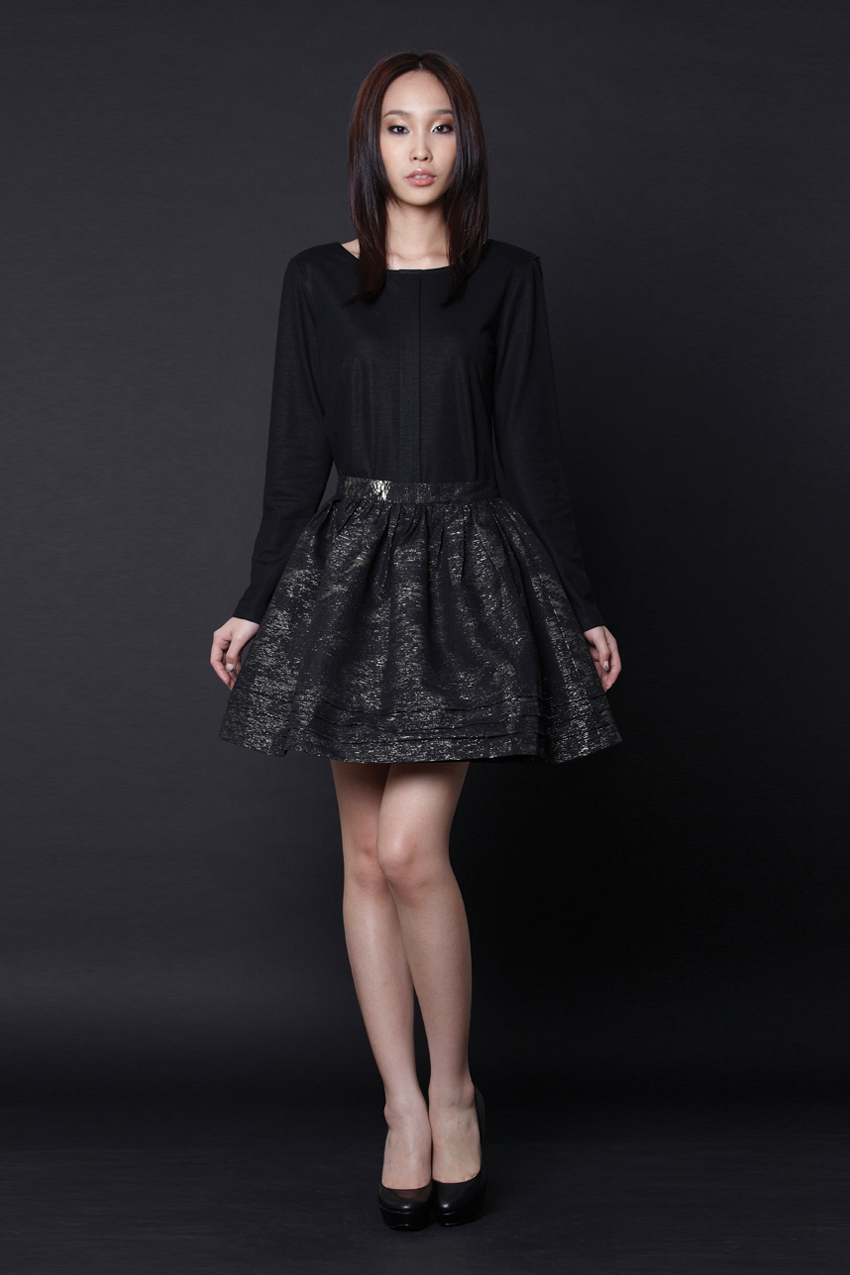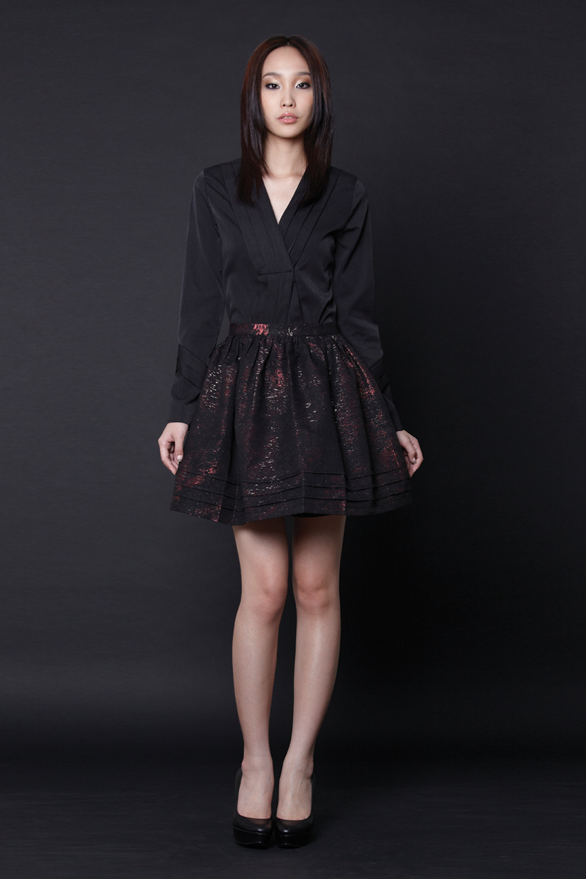 Waisted flared mini skirt Features ruching below the entire waistband Stiff textured metallic fabric with a duochrome effect Concealed zip with a hook and eye at the centre back Fully lined with acetate lining