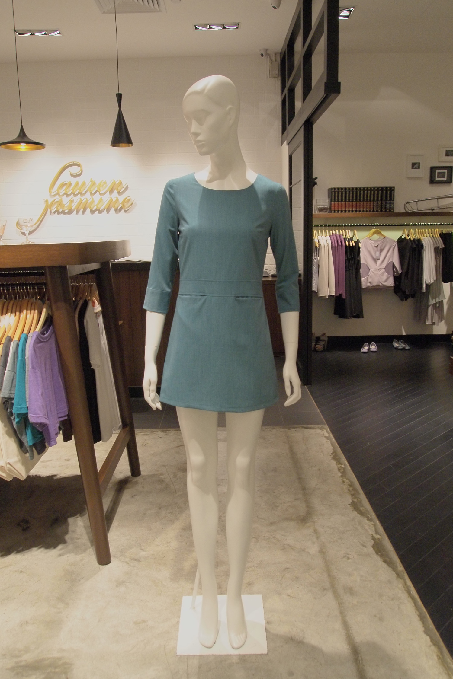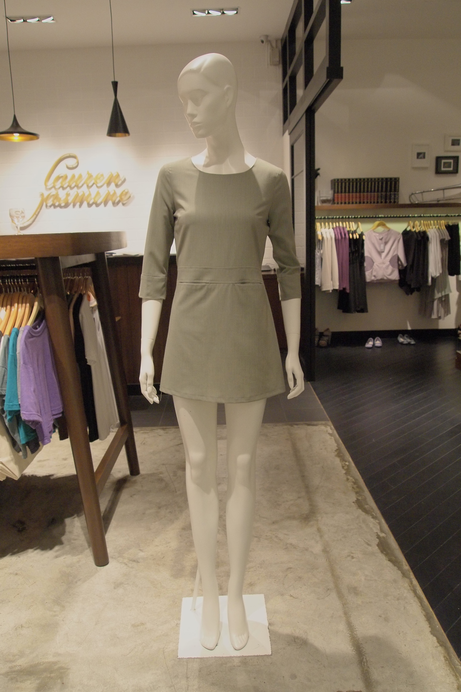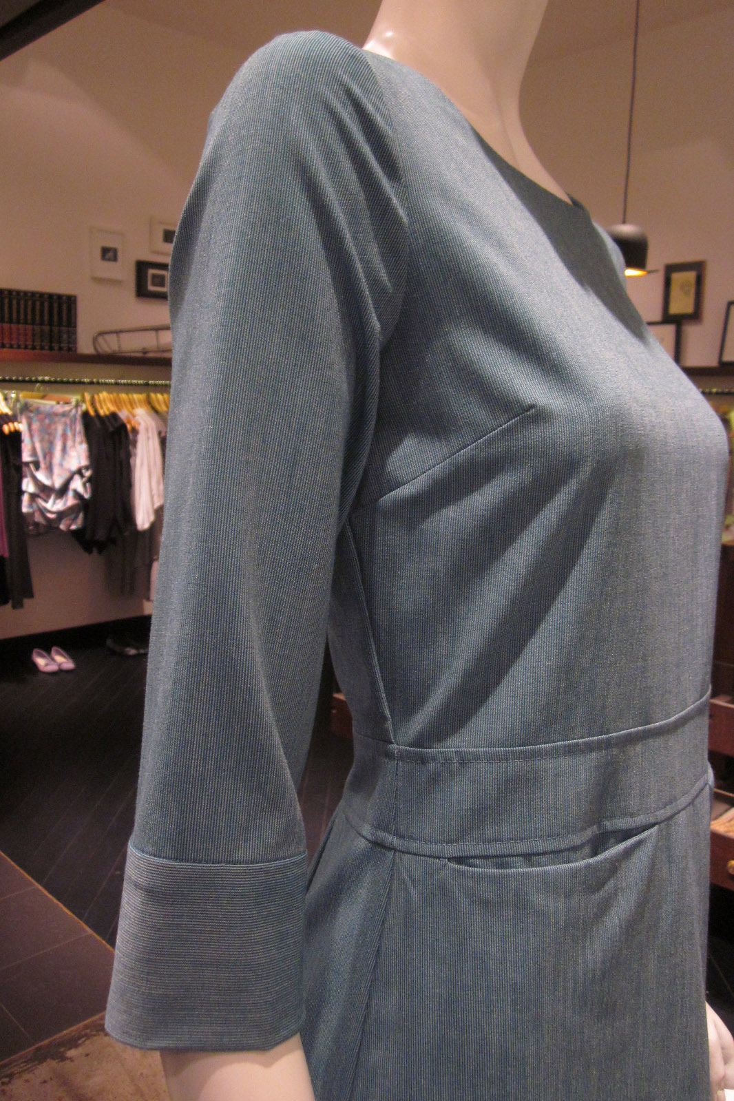 Striped waisted tunic 3/4 Length sleeves 2 Horizontal front pockets below the waistband Concealed centre back zip with hook and eye