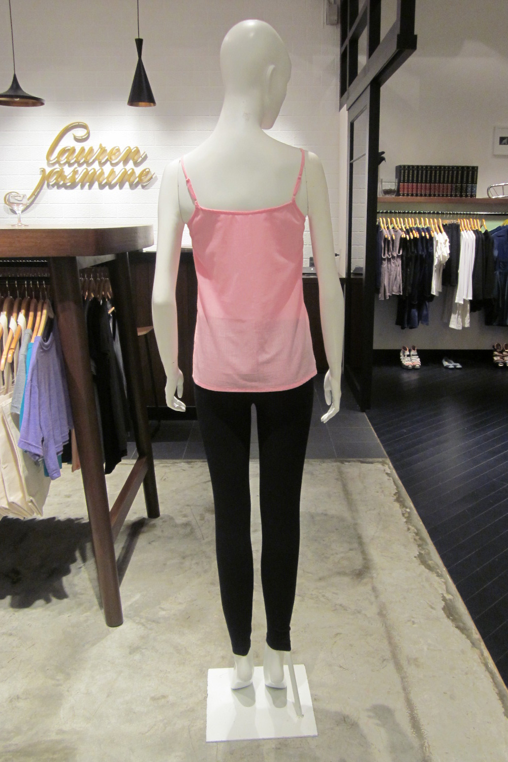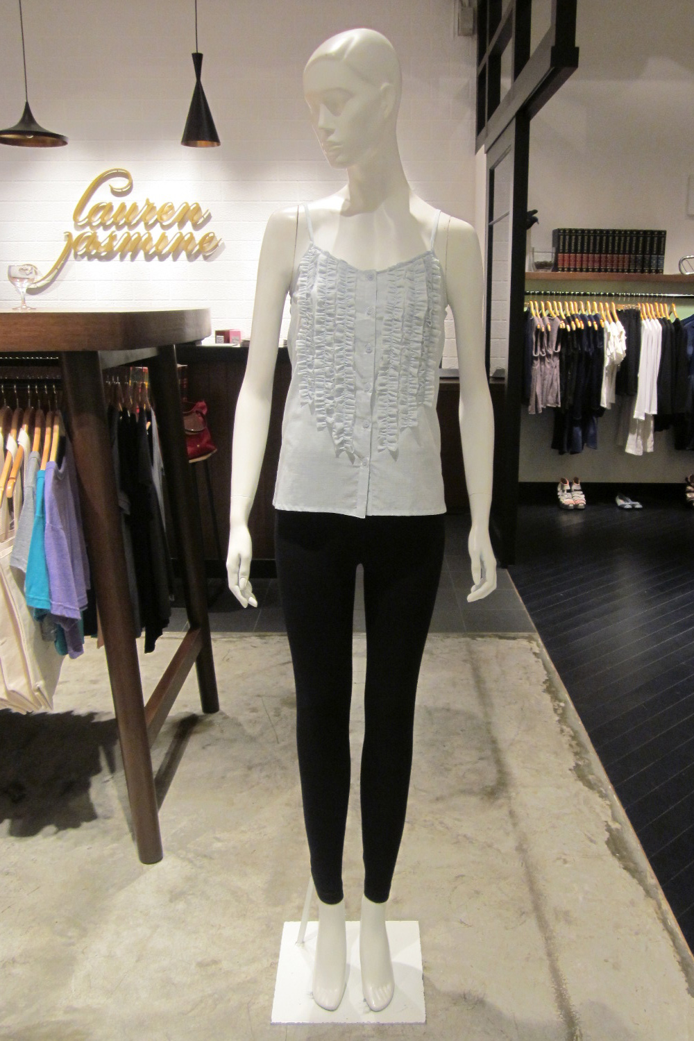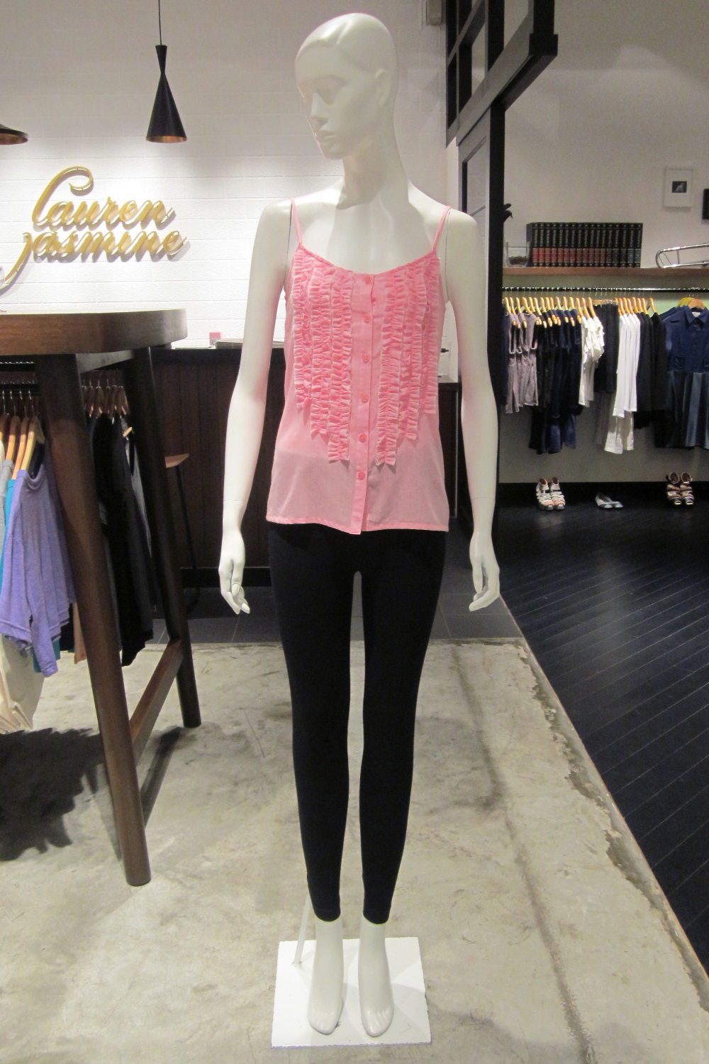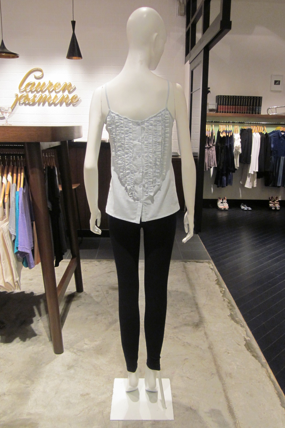 Reversible camisole with adjustable straps Can be worn front to back or back to front One side: 6-button closure running down the front flanked by 3 rows of ruffles on both sides Other side: simple gradual round neckline