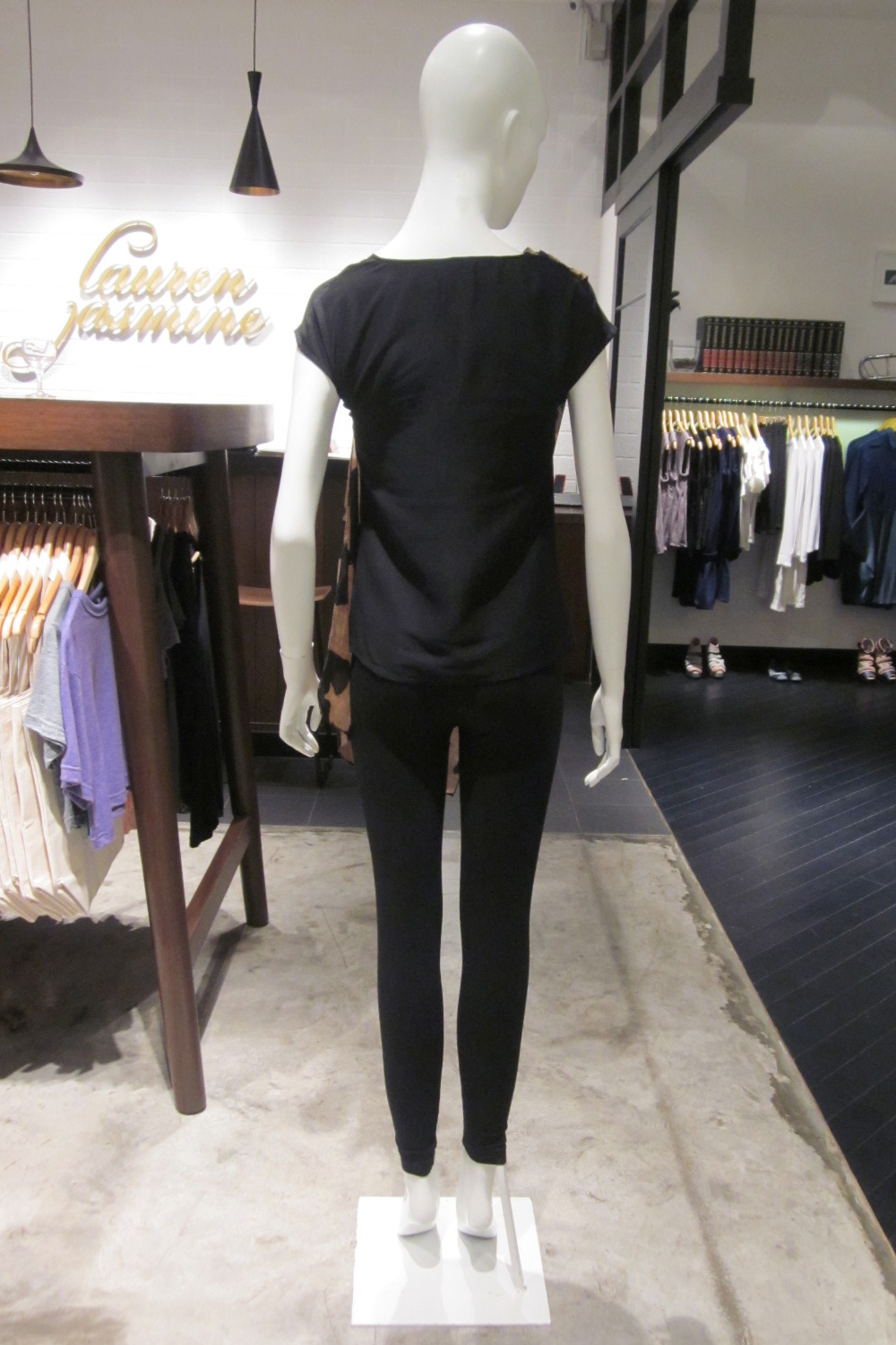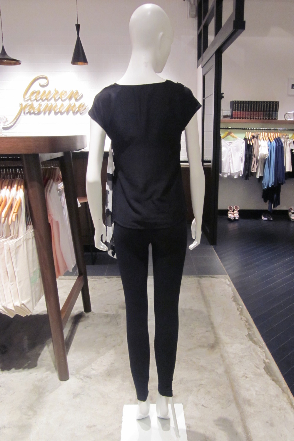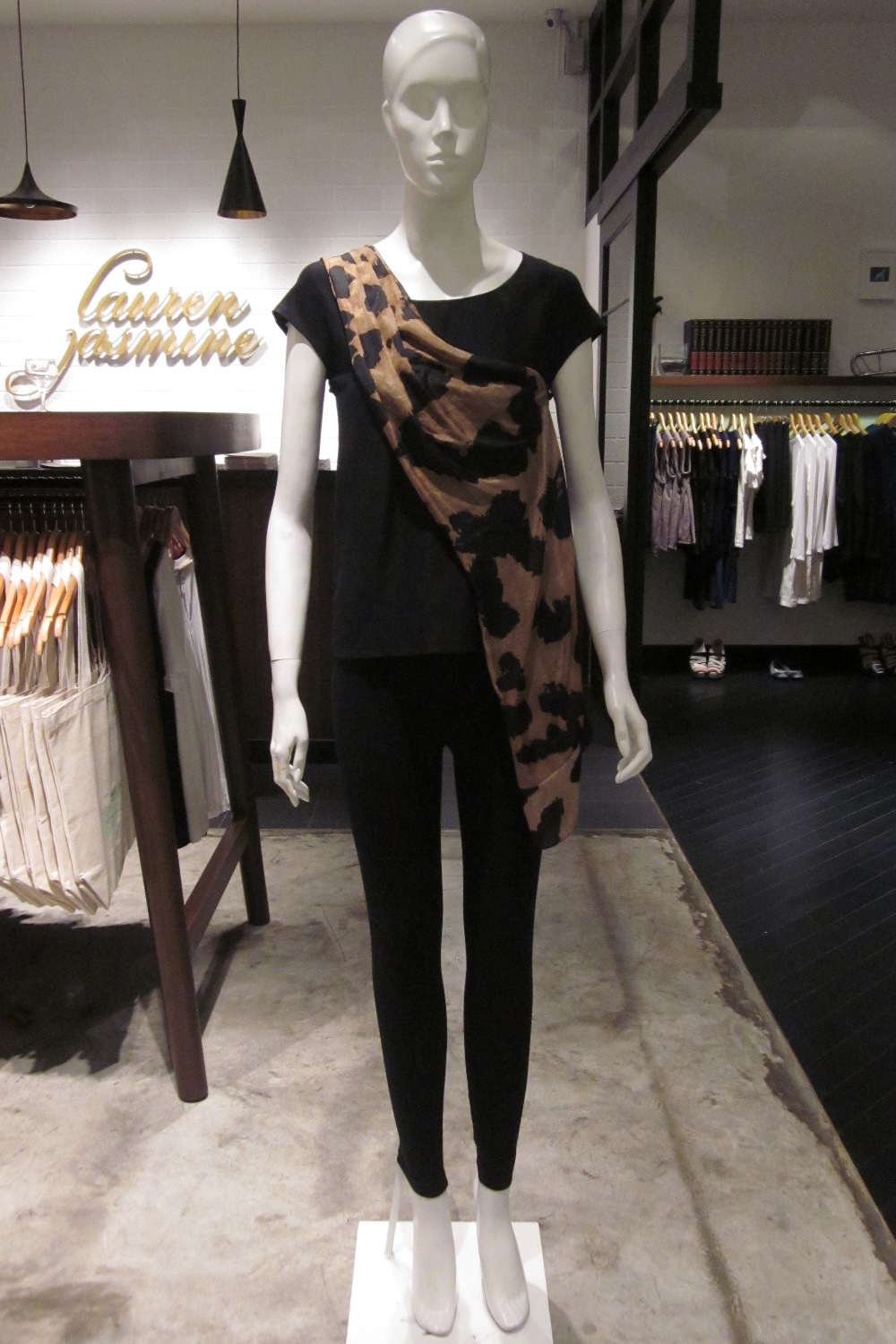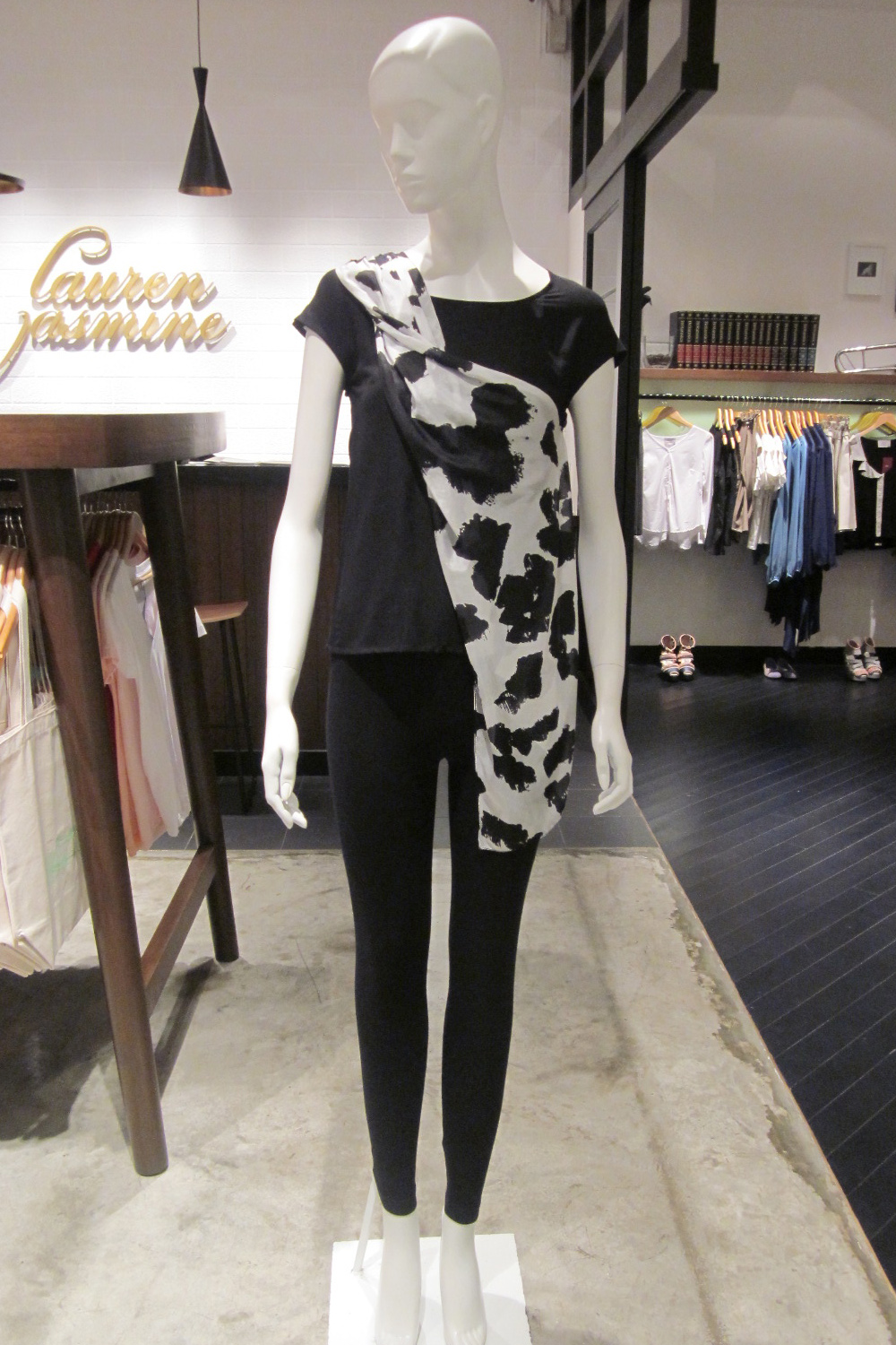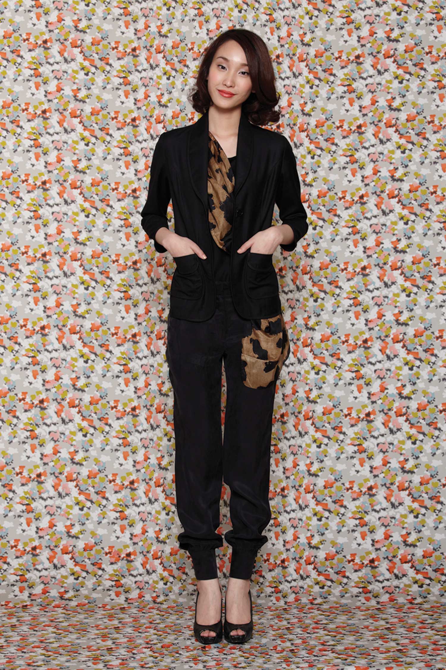 Extended cap sleeves with no armhole seams Features a printed sash secured with pleats along the right shoulder Sash can be worn loosely draped or wrap around as a scarf Can also be twisted and attached to the side with two loop buttons Concealed side zip