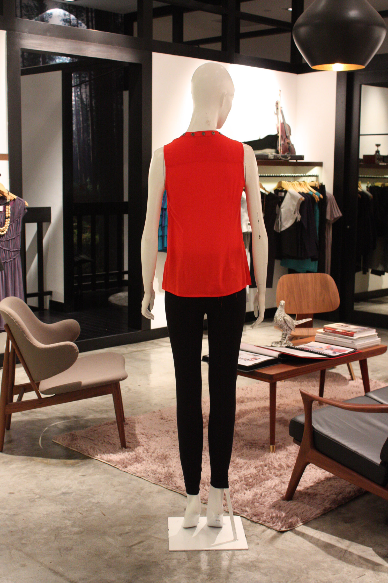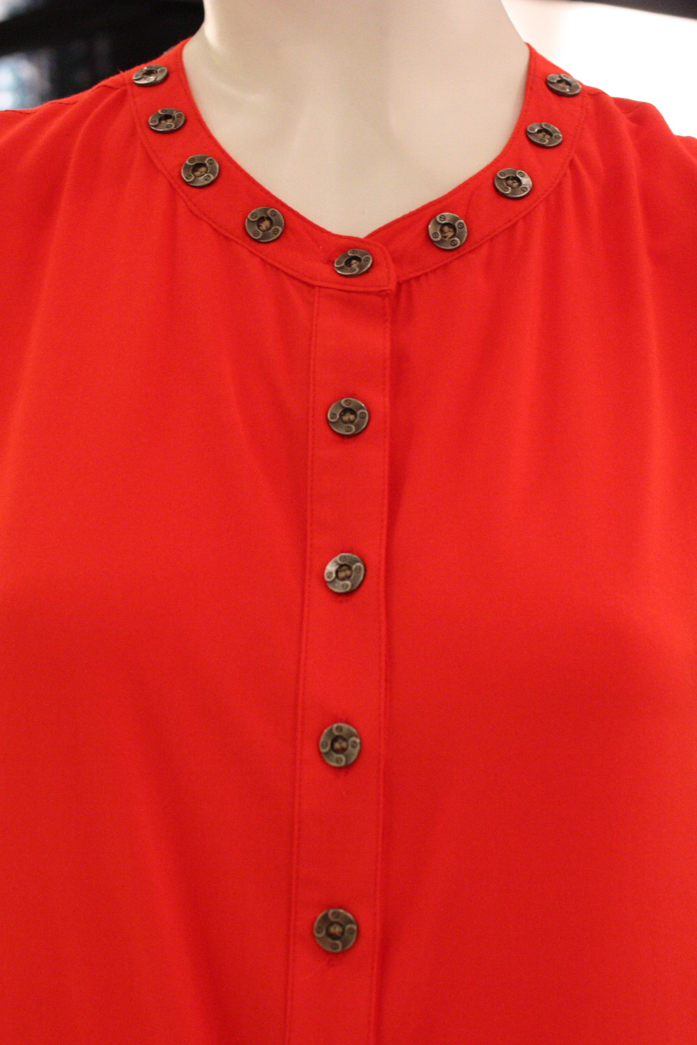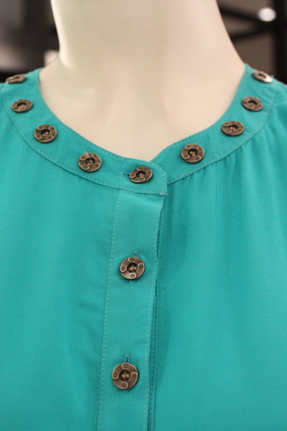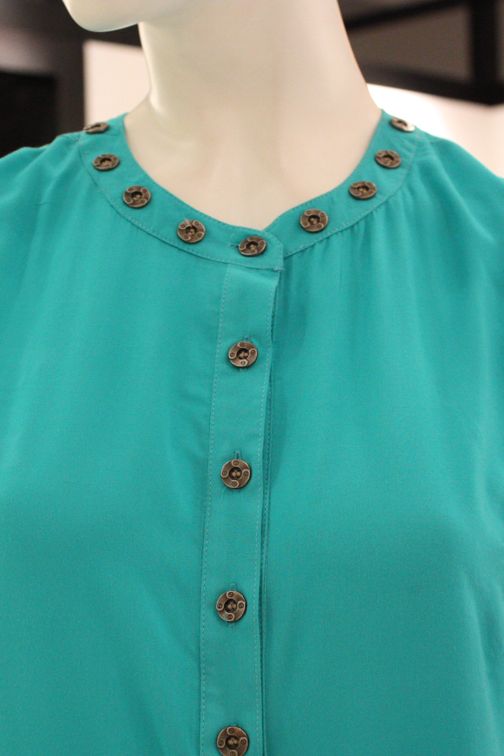 Sleeveless button down top Decorative buttons along the entire collar 9-Button closure at the centre front Loose fit