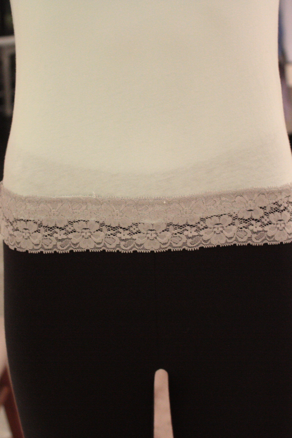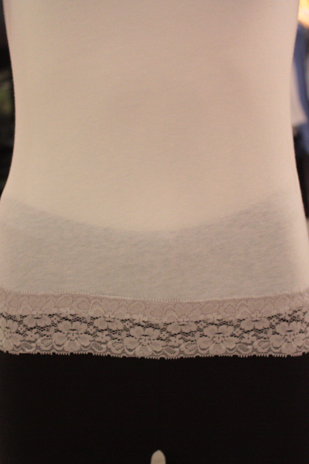 Spaghetti strap camisole top with a round neckline Features a 2" lace trim along the bottom hemline Adjustable straps Fabric is stretchy