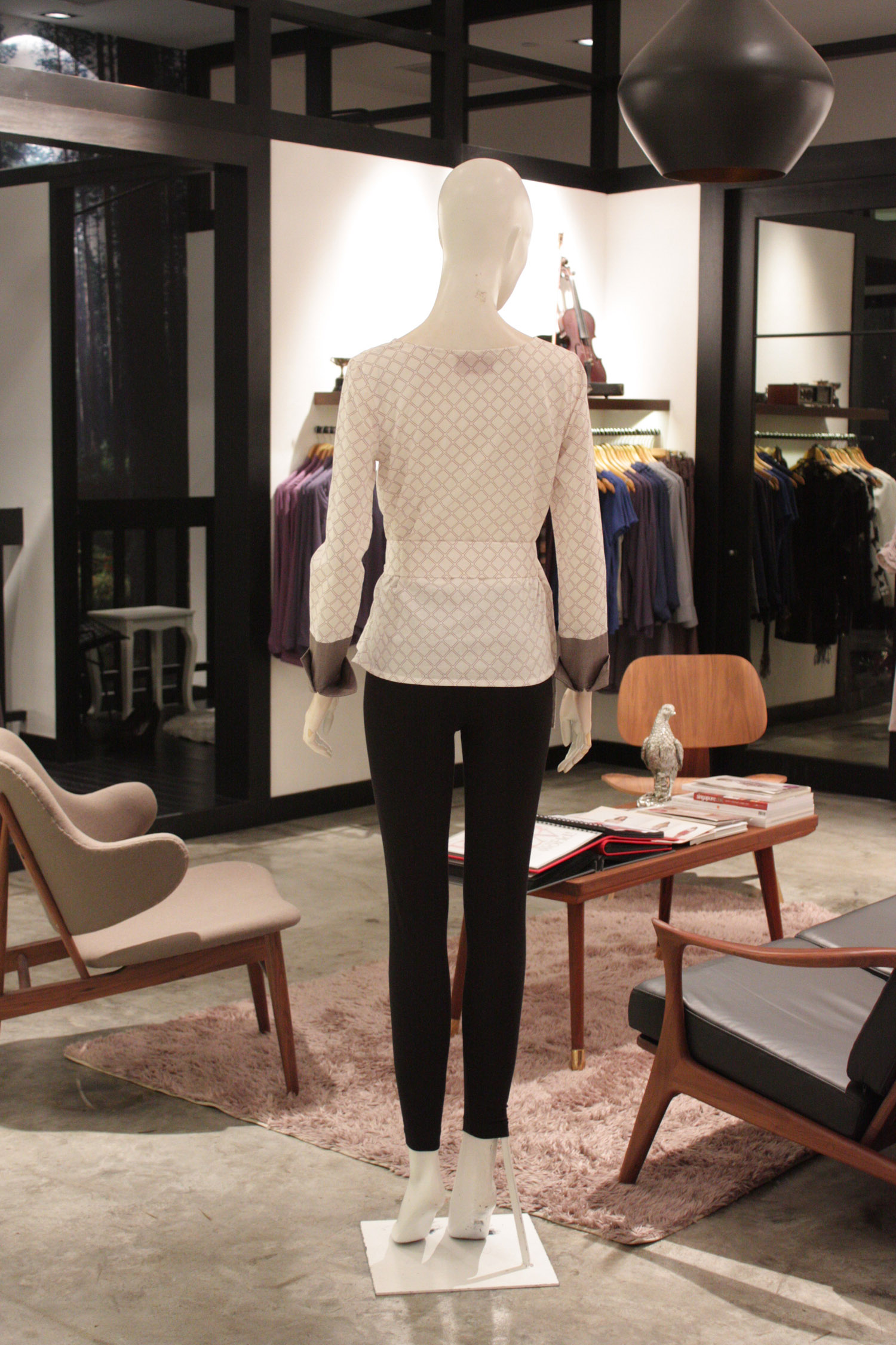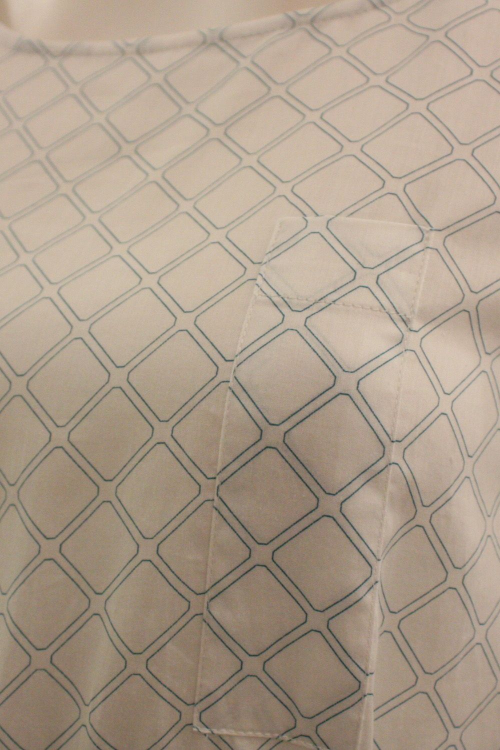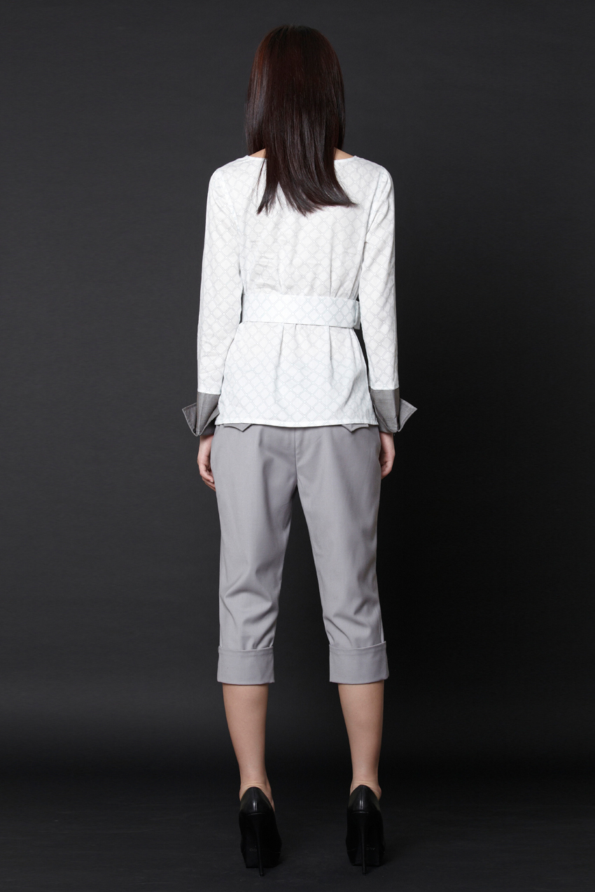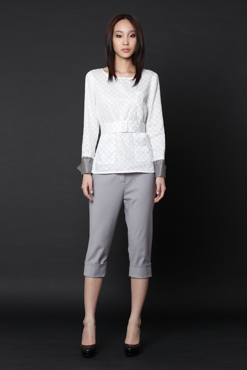 Boat neck long-sleeved top 2 Wide contrast cuffs on each sleeve which can be worn folded or unfolded like a French cuff It has a detachable fabric belt and an adjustable buckle Features 2 pockets at the front and a long vertical pocket on the left chest