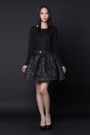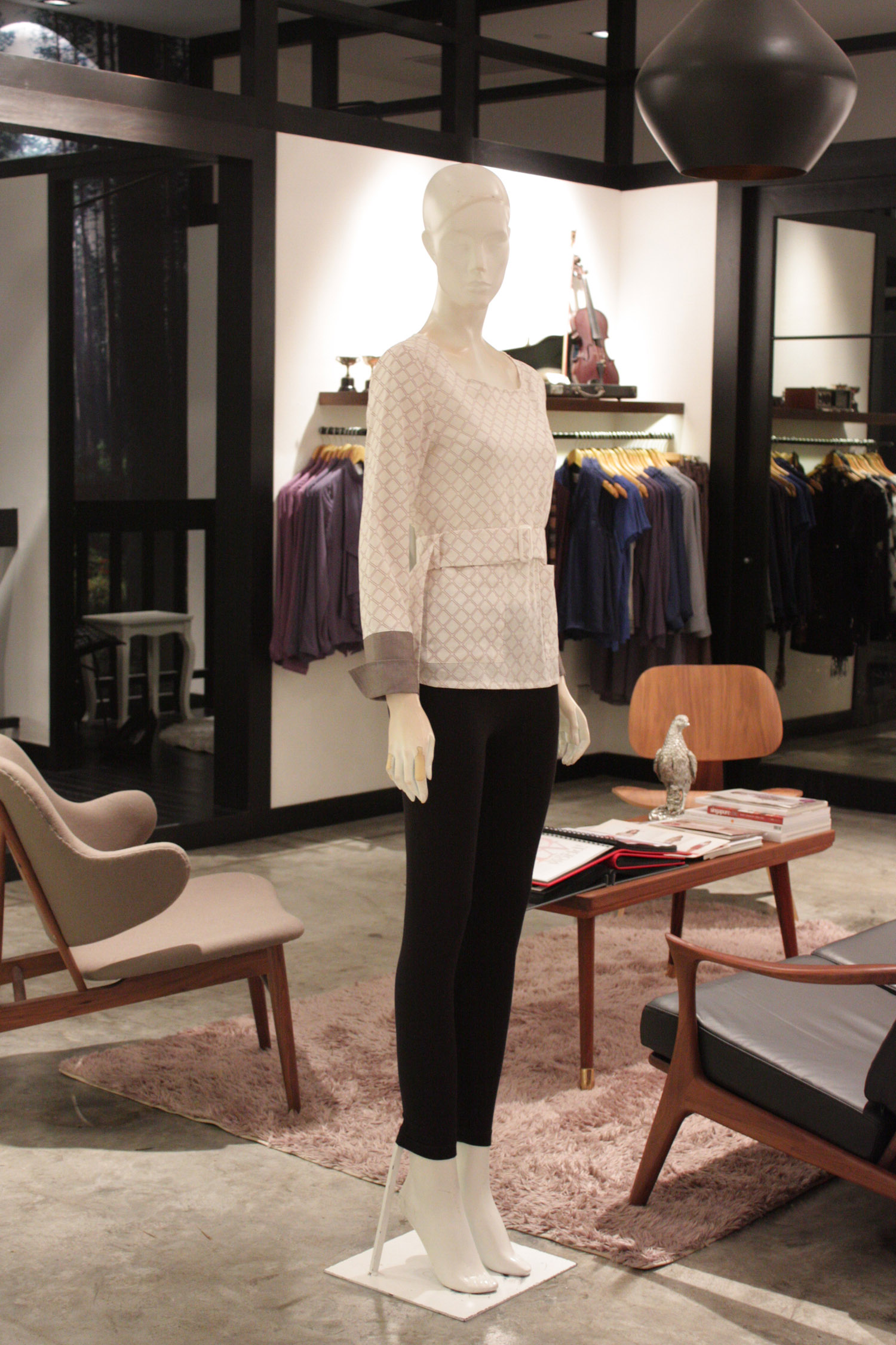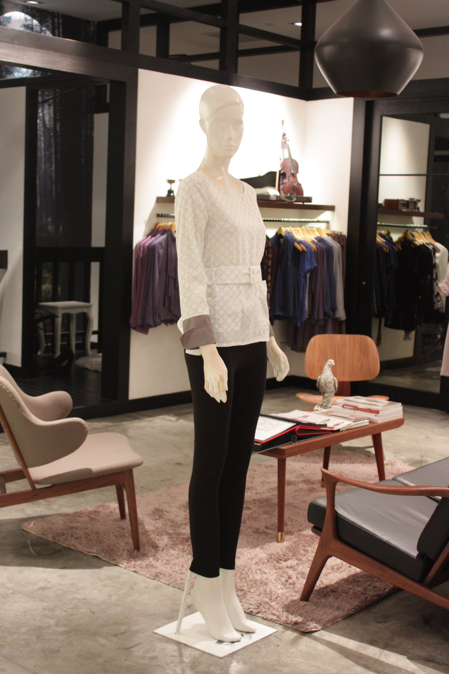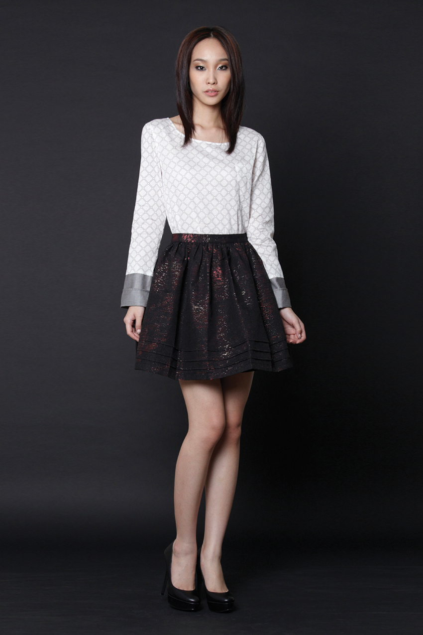 Boat neck long-sleeved top 2 Wide contrast cuffs on each sleeve which can be worn folded or unfolded like a French cuff It has a detachable fabric belt and an adjustable buckle Features 2 pockets at the front and a long vertical pocket on the left chest