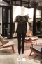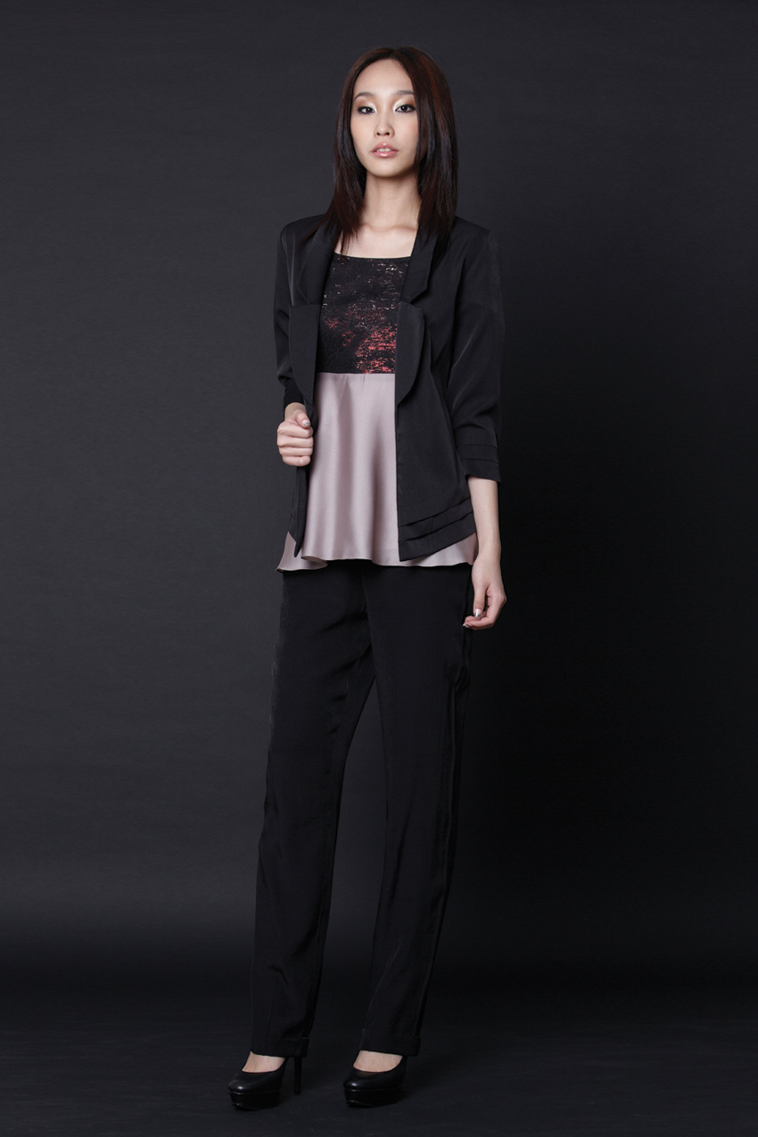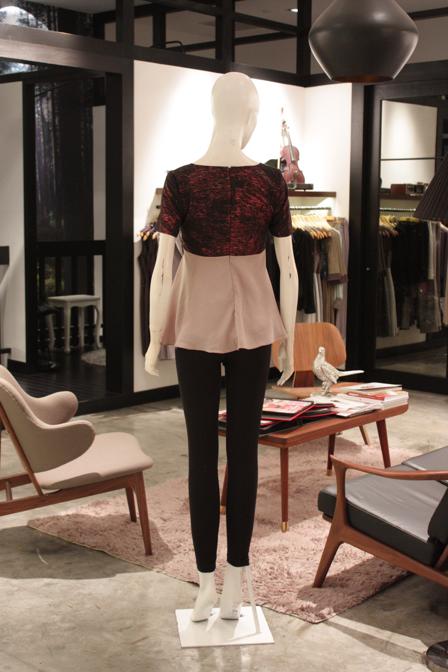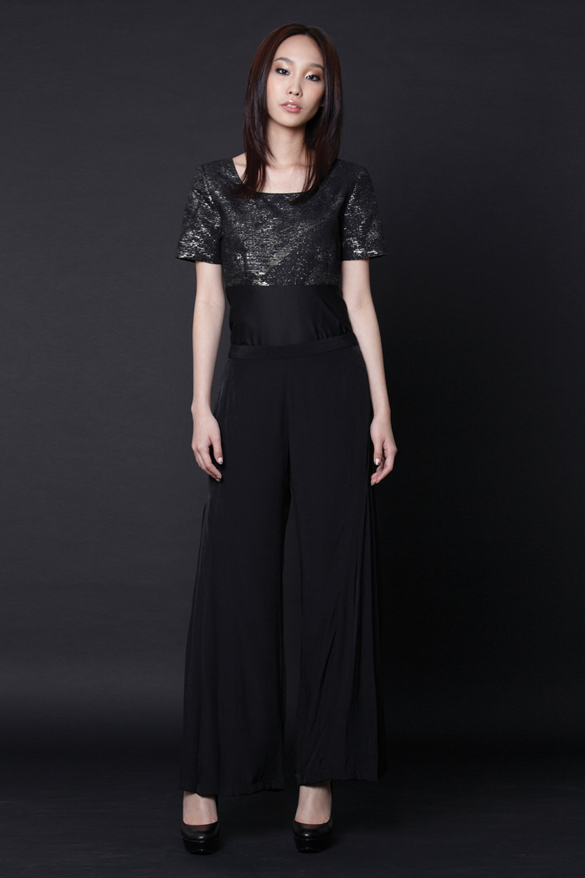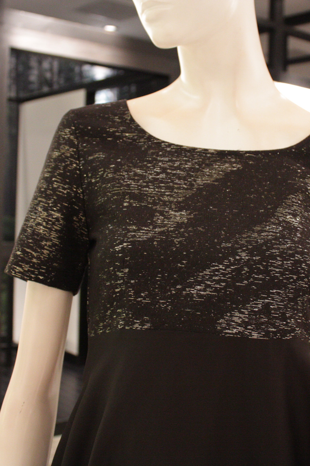 The fabric on the upper body is a stiff textured metallic fabric with a duochrome effect