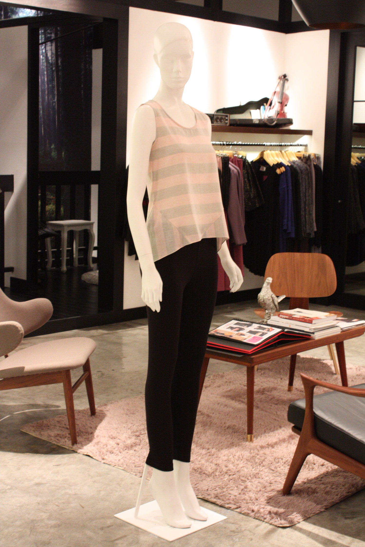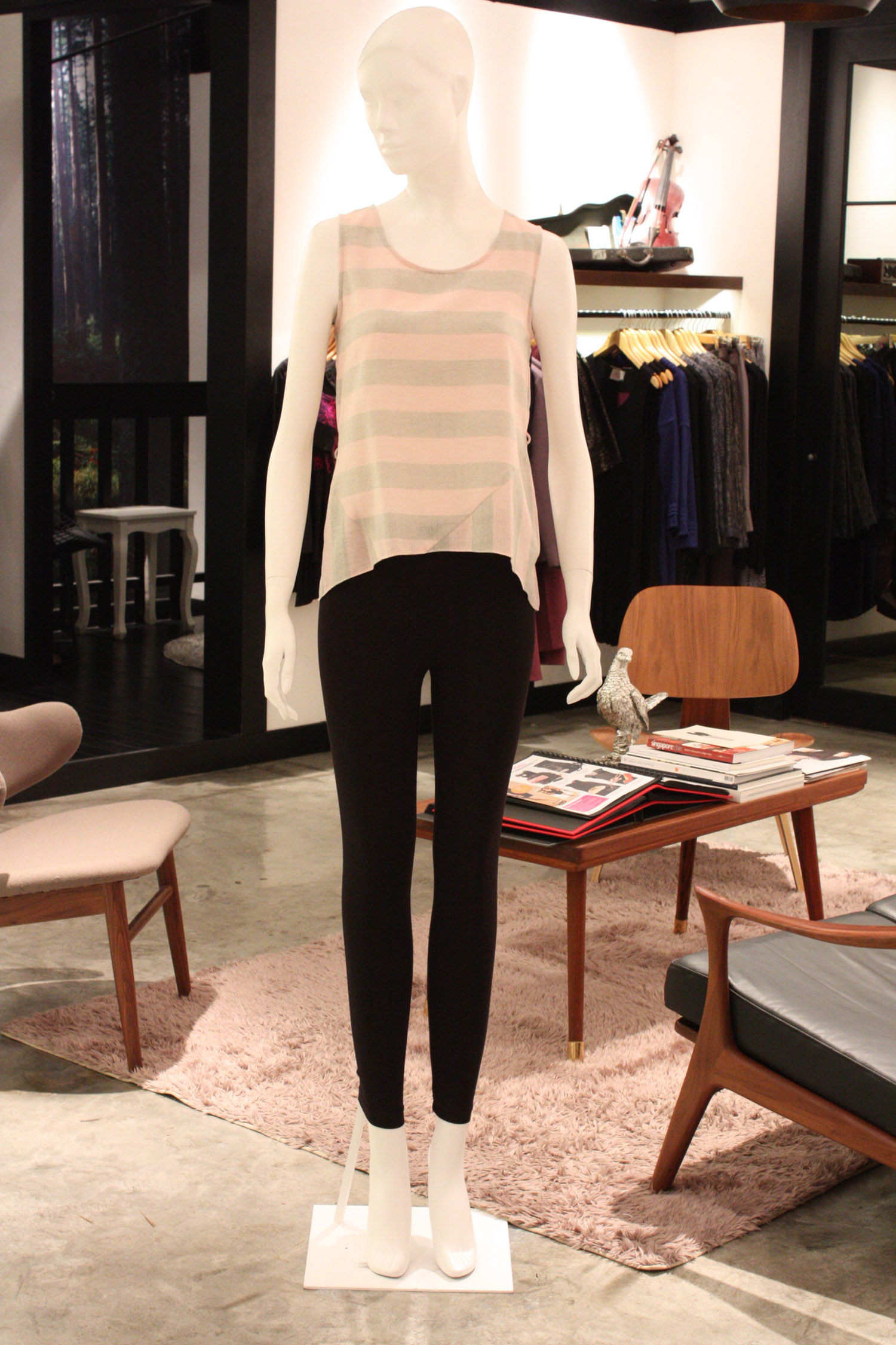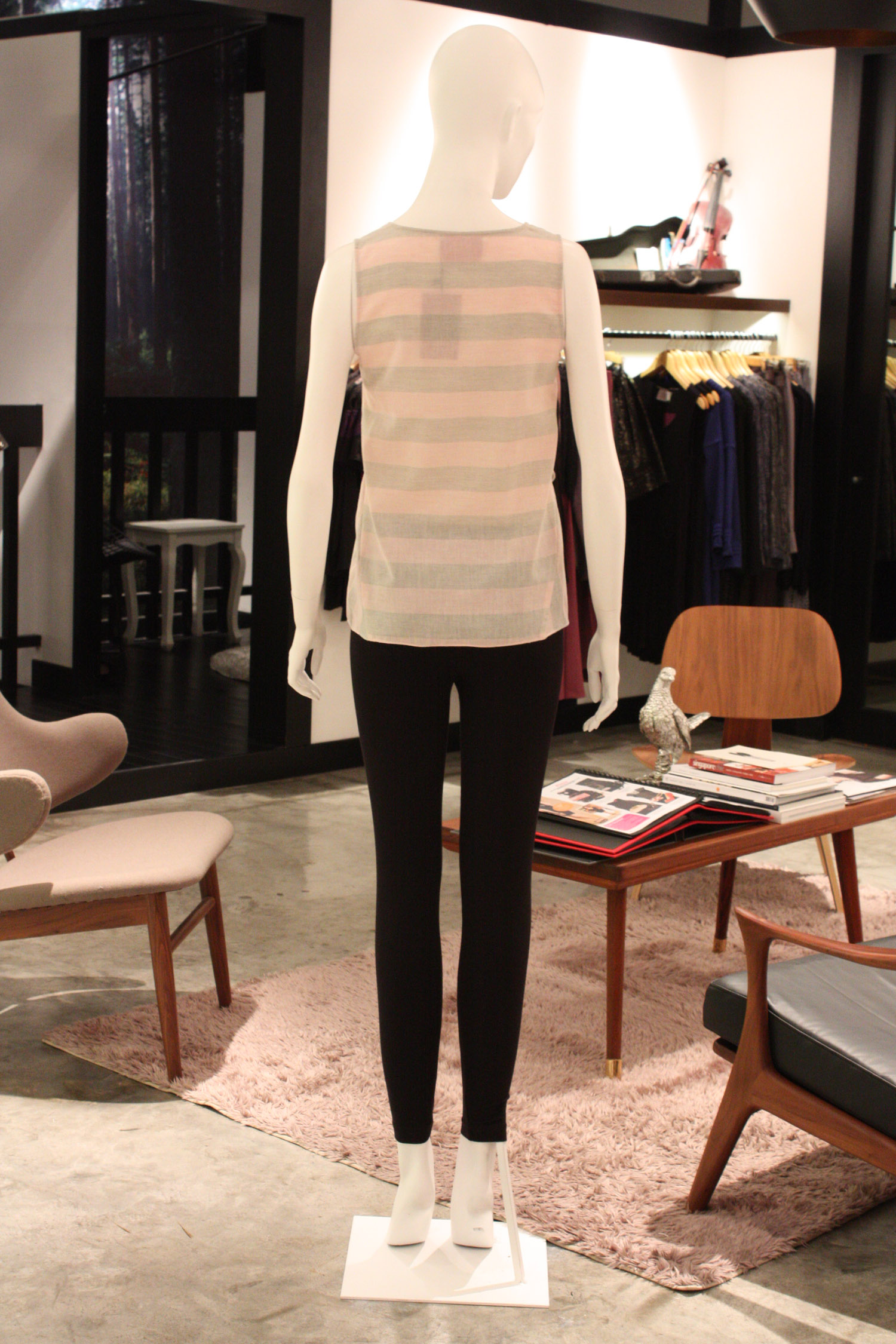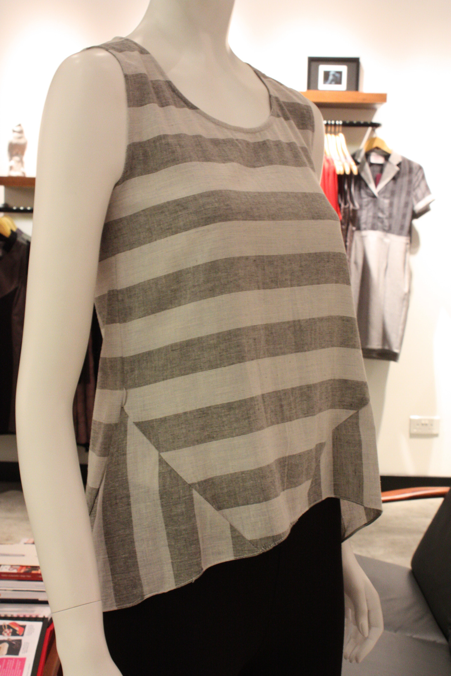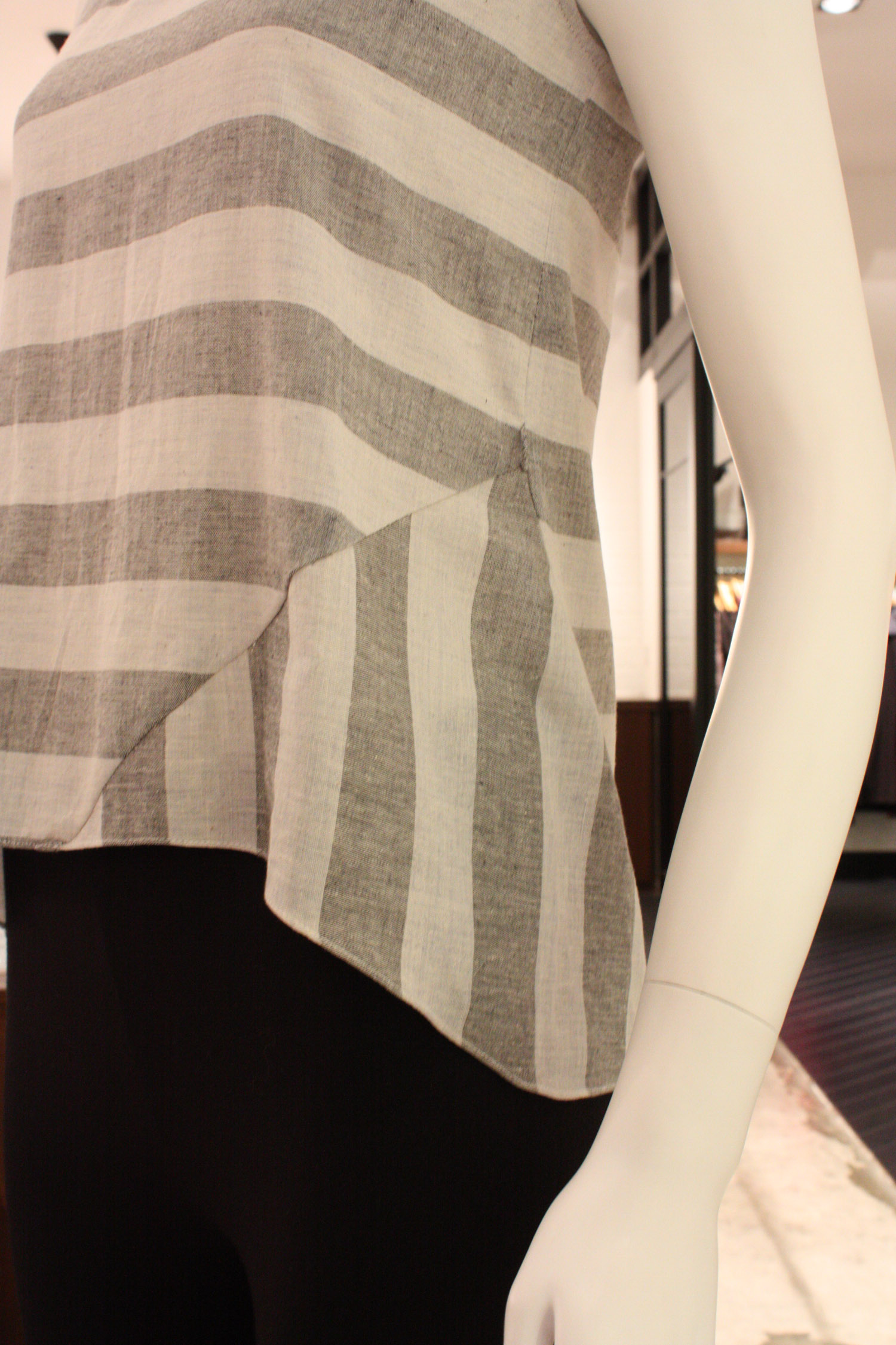 Sleeveless tank top with a round neckline Body has horizontal stripes with contrast vertically striped triangular panels at the sides Asymmetrical hemline at the front Belt loops at the sides
