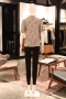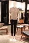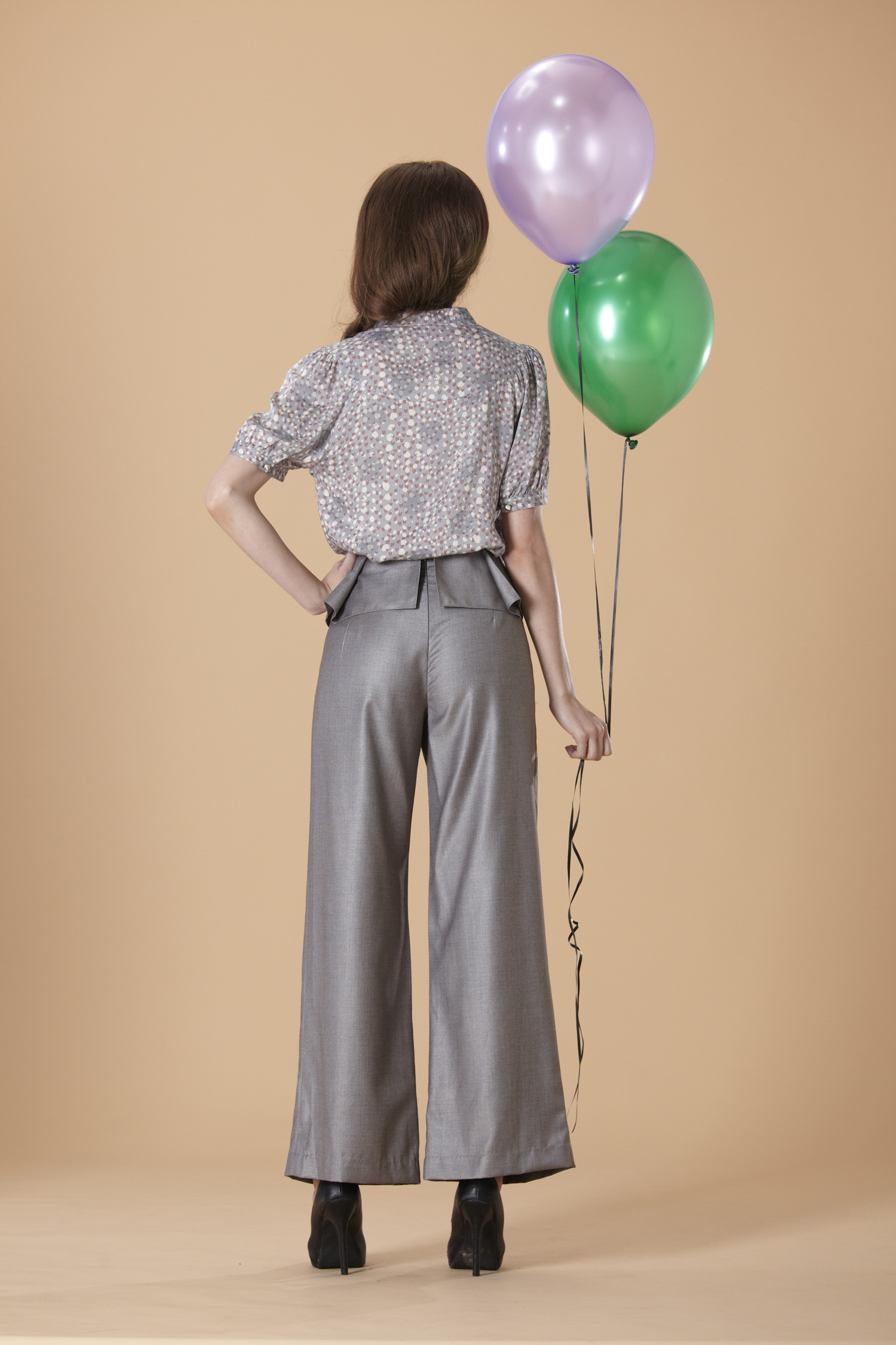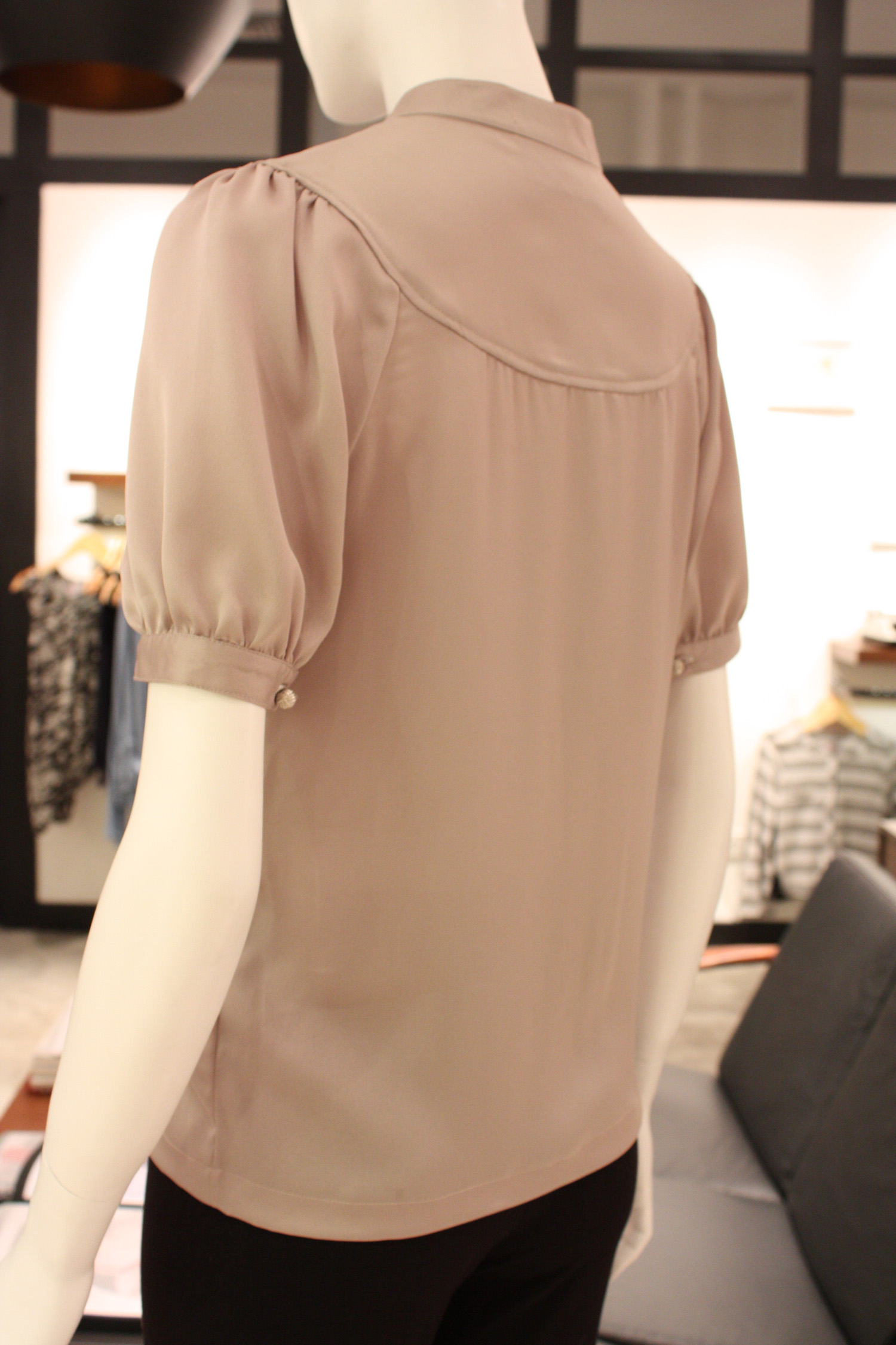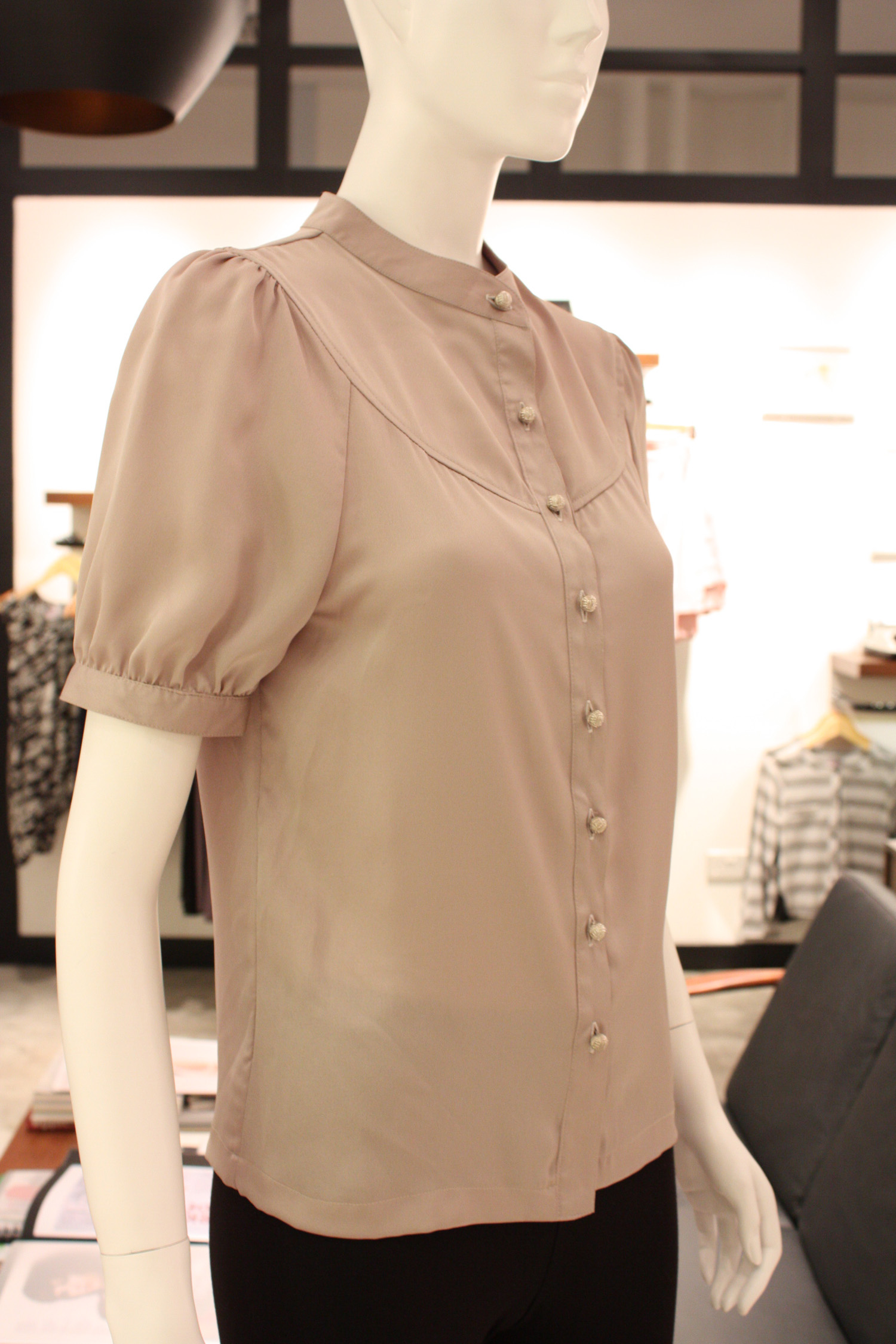 Puff sleeved blouse with a mandarin collar Bib neckline at the front and back Small gathers at the shoulders and at the cuffs 8-Button closure down the centre front Single button eyehole closure on each cuff Buttons have an ornate design