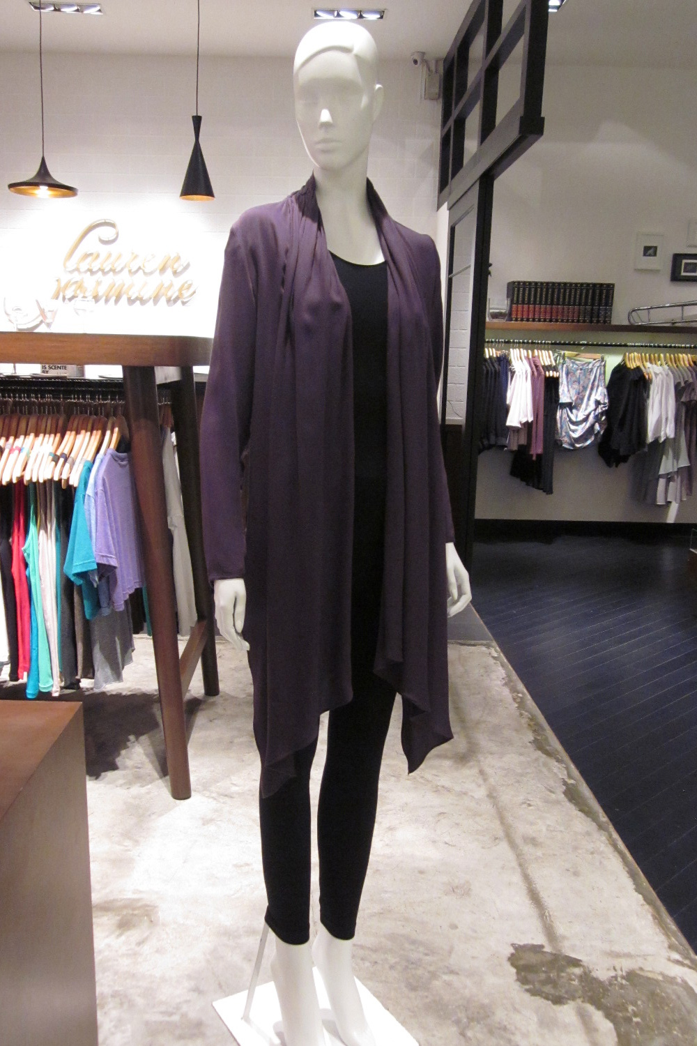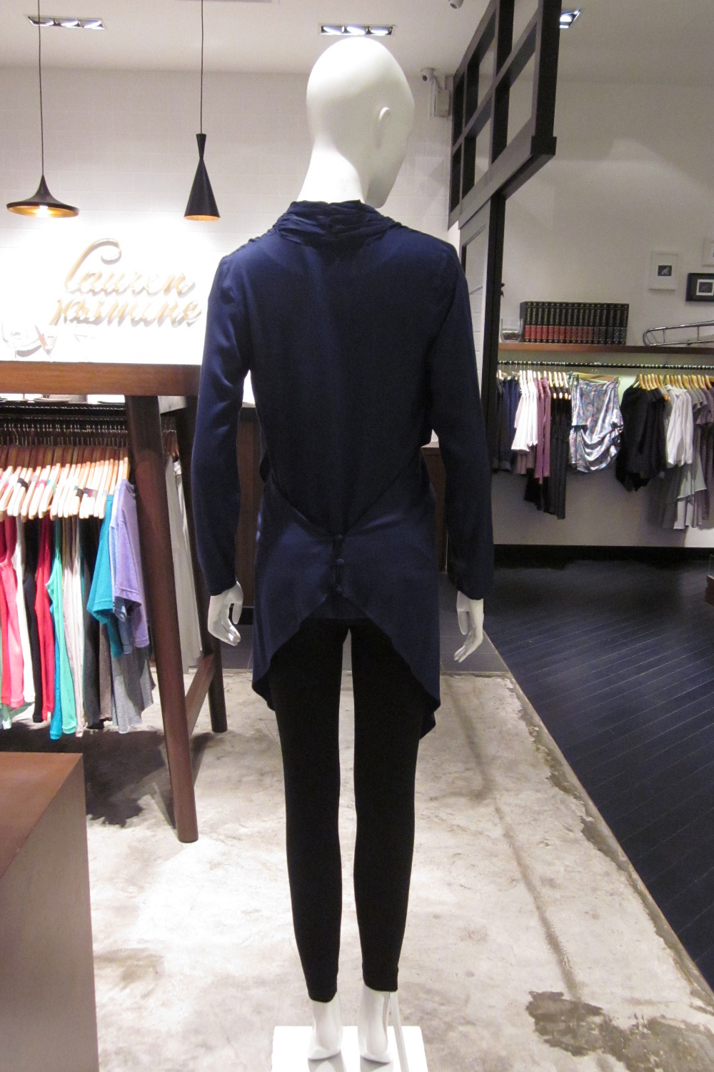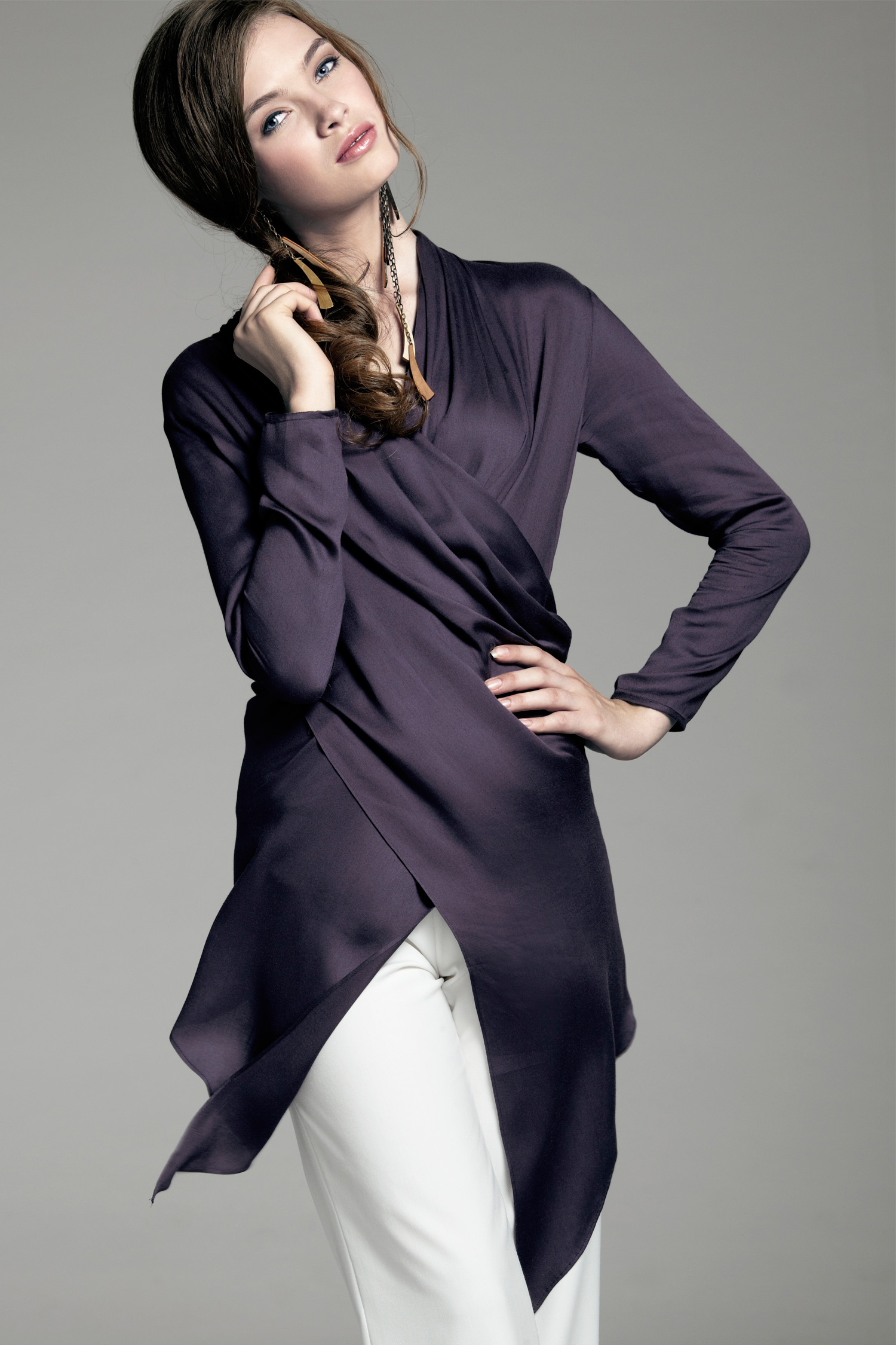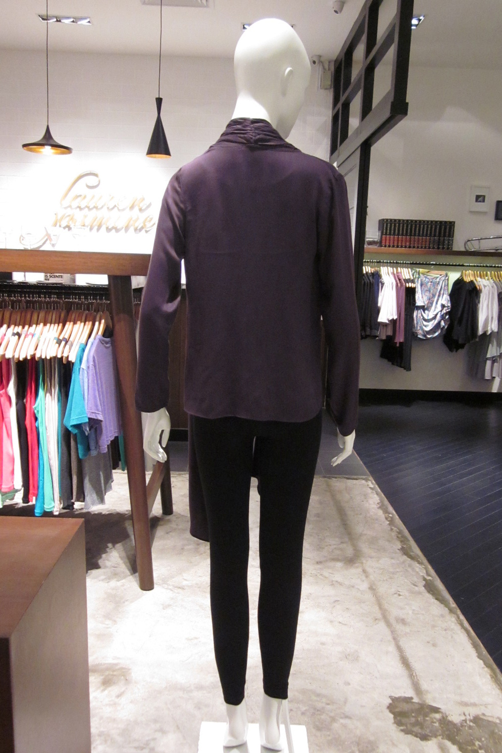 Convertible wrap long sleeved top Slit on each side Ruched along the collar Drapey effect down both sides 3 Fabric button closure