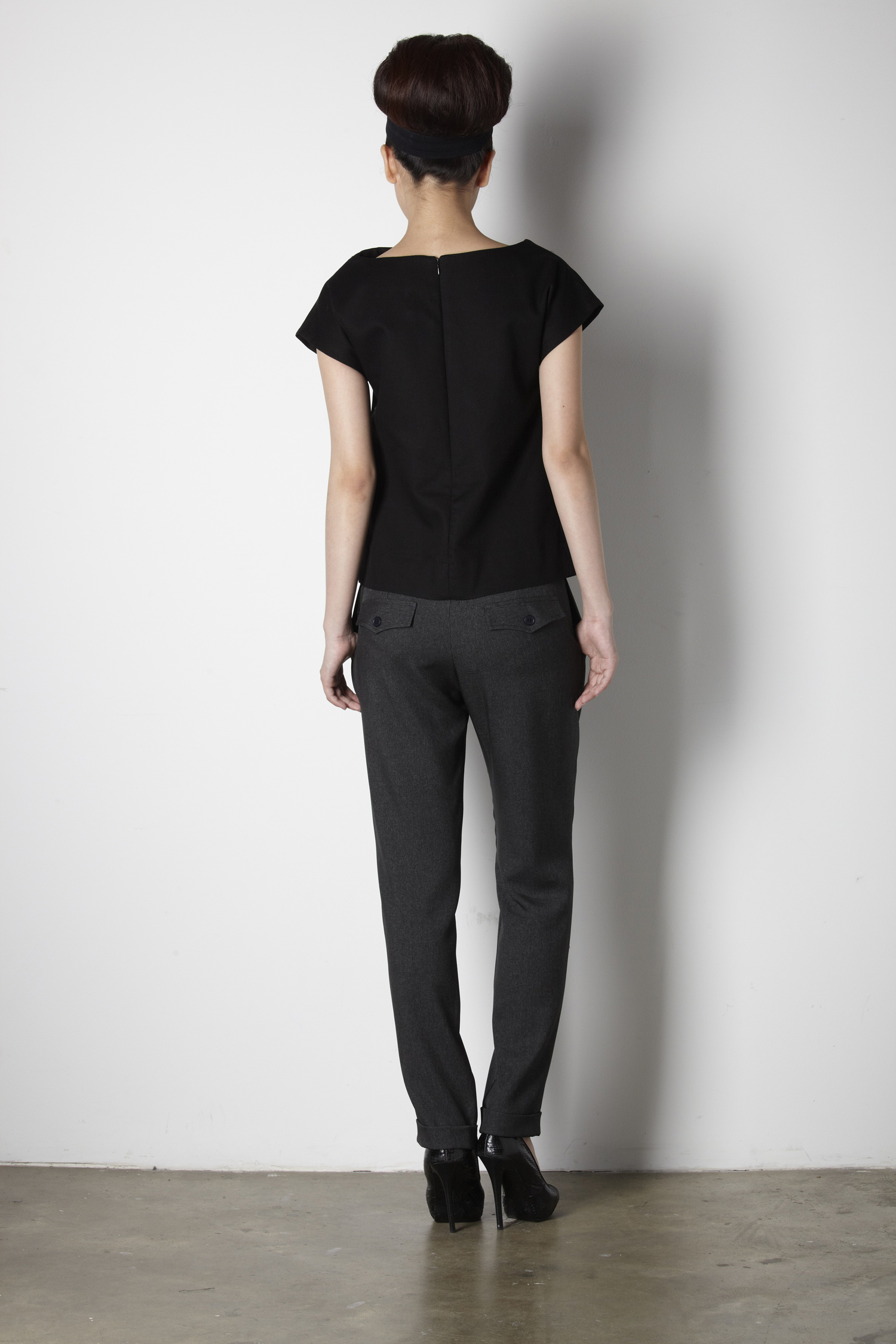 Folded collar top Foldover detail along the front neckline High neckline Extended cap sleeves with no shoulder seams Concealed centre back zip with hook and eye