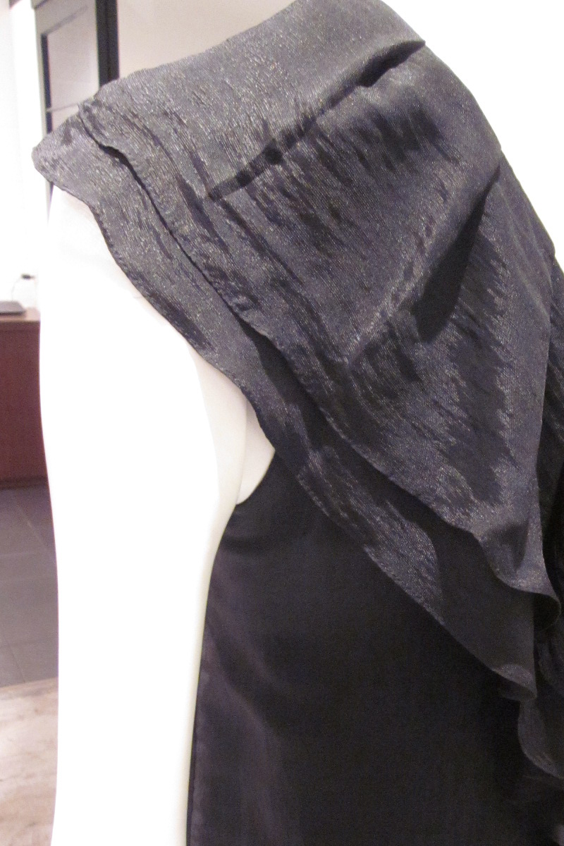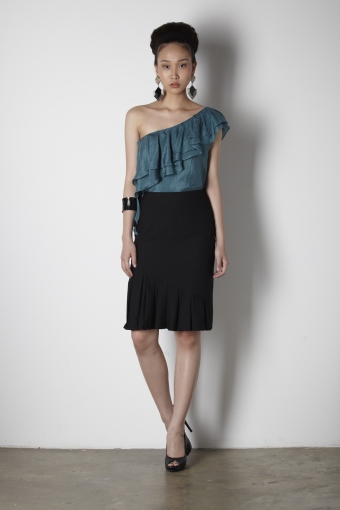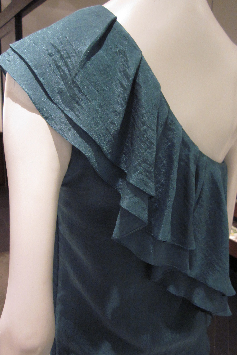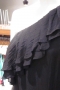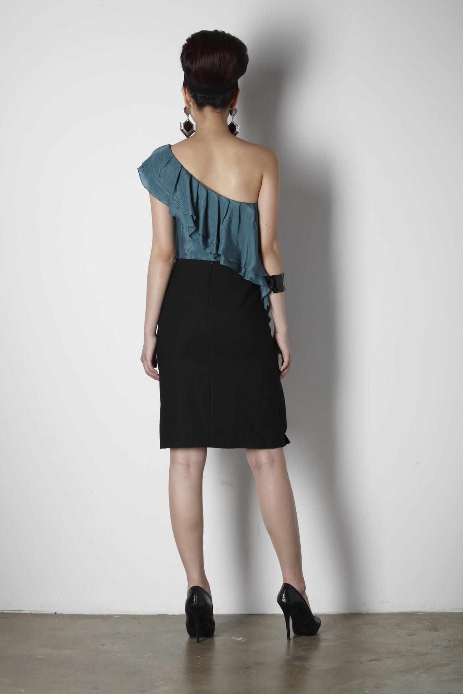 Cascading ruffle toga top 2 Layers of ruffles run along the neckline from the front to the back Concealed side zip Lined with self fabric