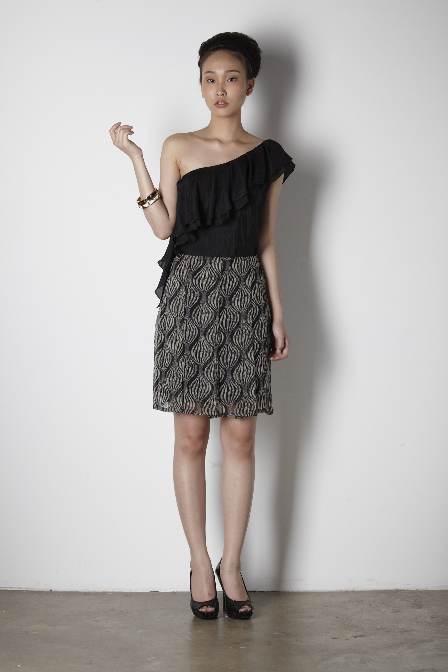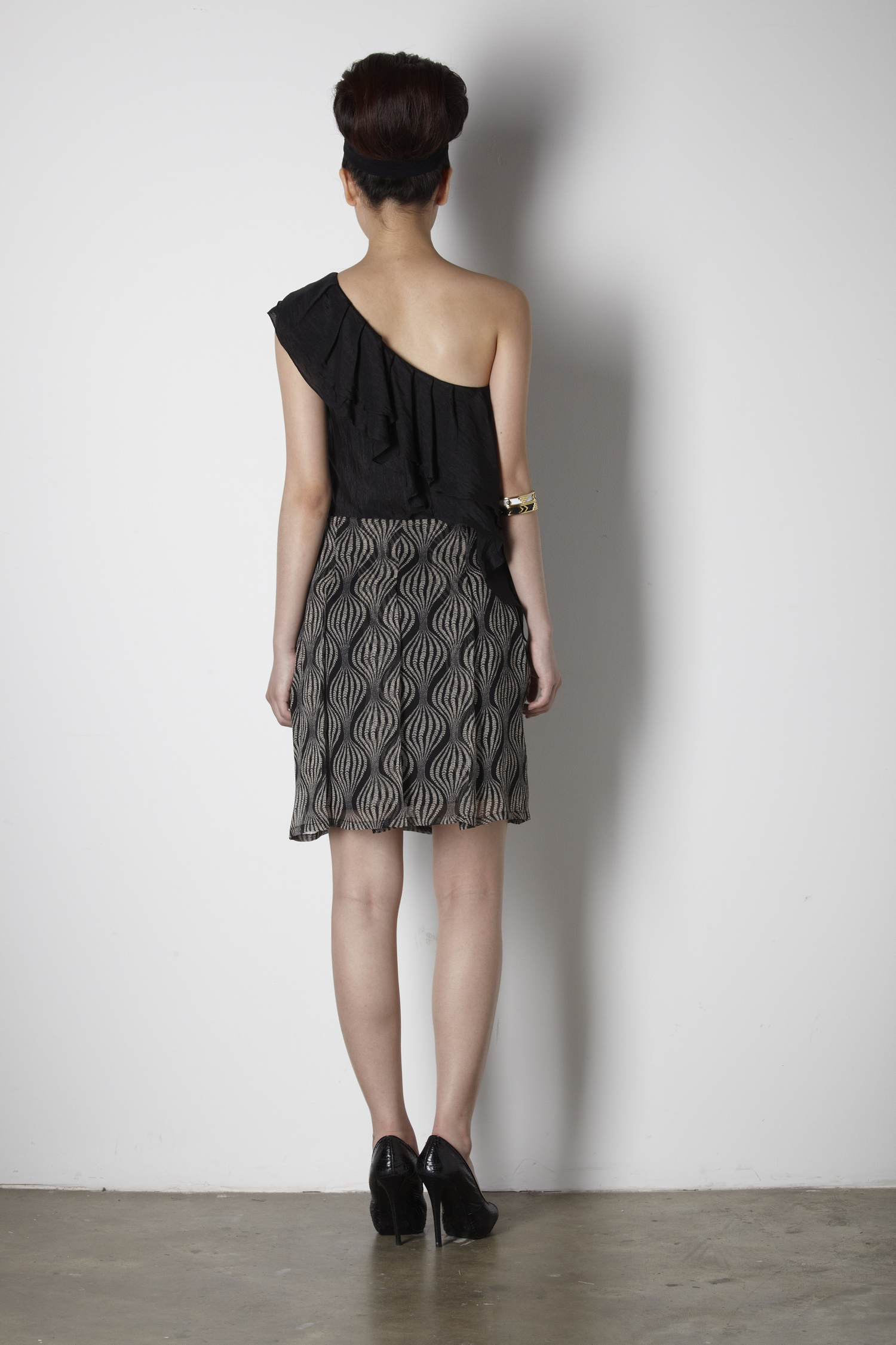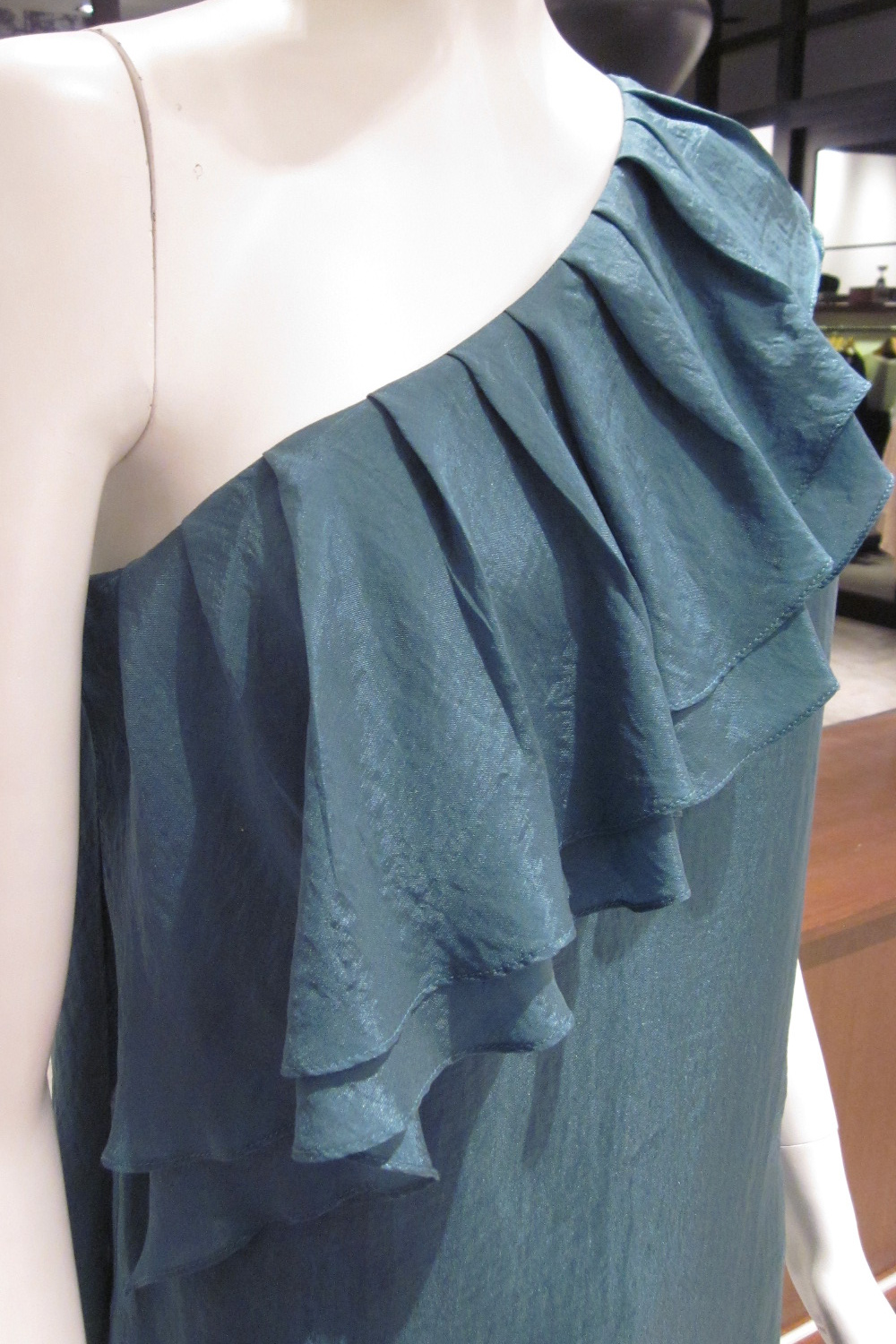 Cascading ruffle toga top 2 Layers of ruffles run along the neckline from the front to the back Concealed side zip Lined with self fabric